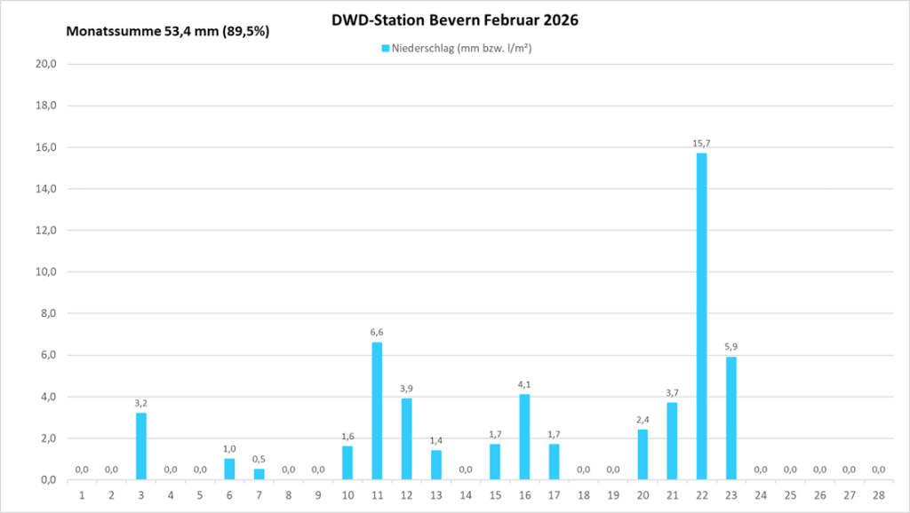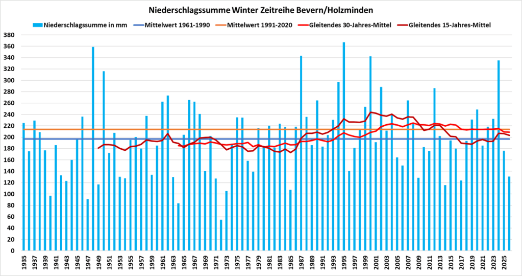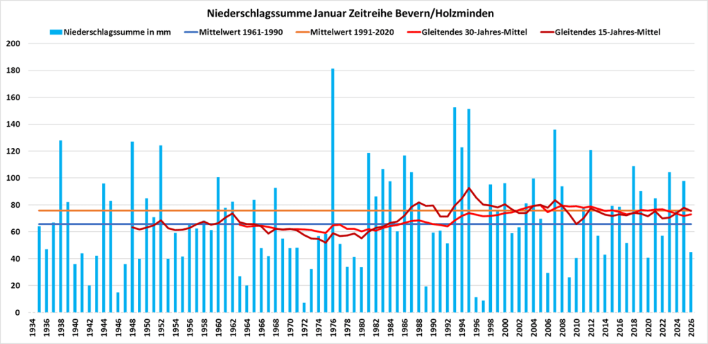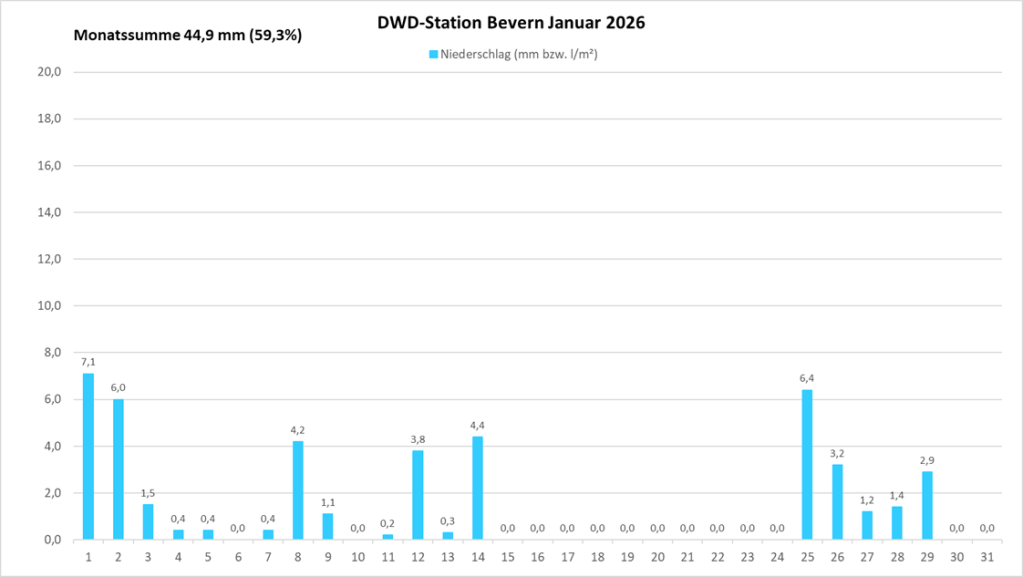 Die höchste Monatssumme meldete Hellental mit 87 mm, gefolgt von Silberborn mit 77 mm, was aber dort bereits ein Minus von gut 25% zum Mittel von 1991-2020 bedeutet. In Polle fielen 65,5 und in Ottenstein 61 mm, es folgt Lüchtringen mit 56 mm und dann ganz nah beieinander Hehlen mit 46 sowie Vorwohle und Bevern mit je 45 mm. Für die Klimastation in Bevern reichte es damit nur für 60% eines durchschnittlichen Januars und die 12-Monatssumme seit Februar 2025 beträgt dort ganze 497 mm – ein Defizit von fast 300 mm innerhalb eines Jahres. Nur zweimal seit Aufzeichnungsbeginn war es noch trockener in diesem Zeitraum: 1959/60 und 1976/77.