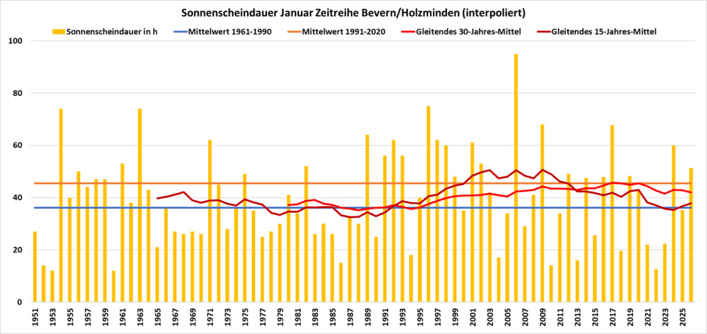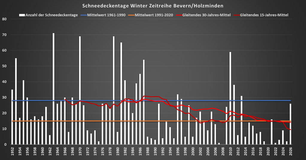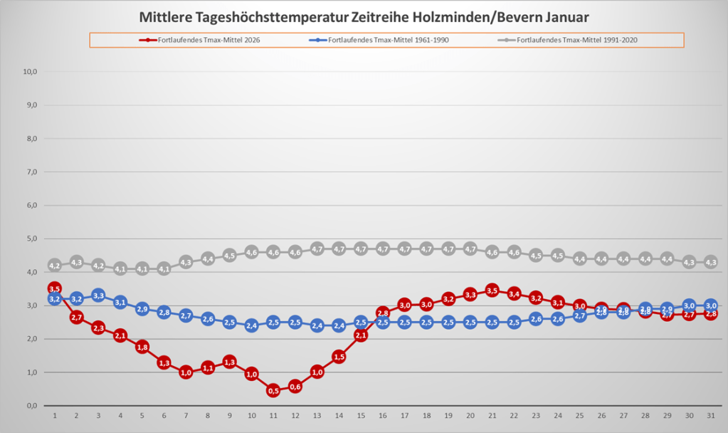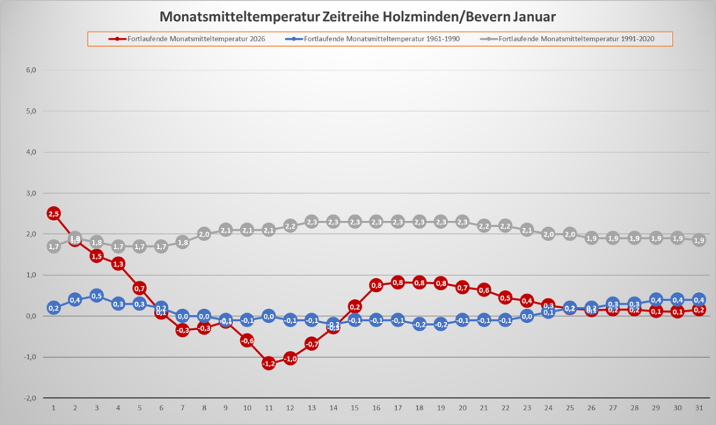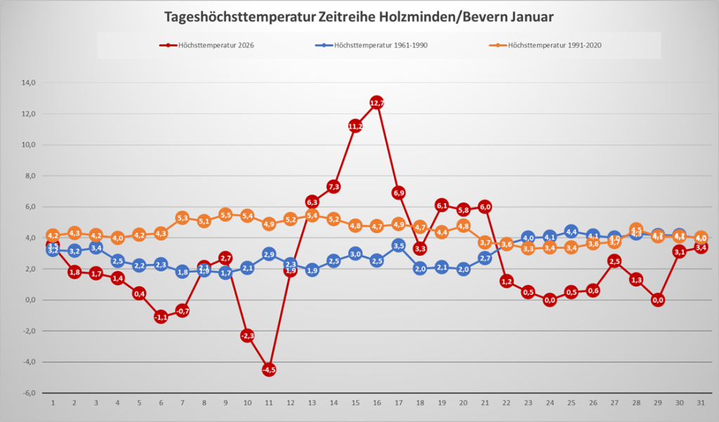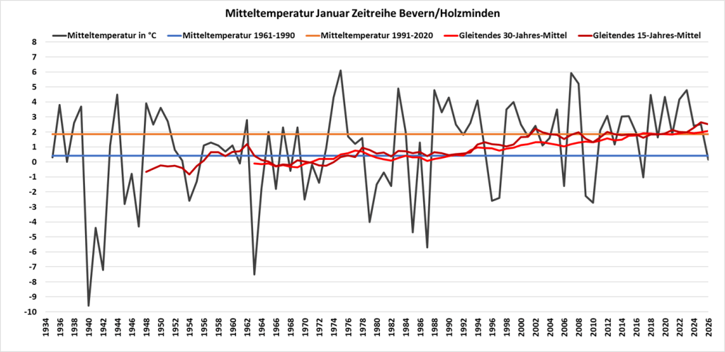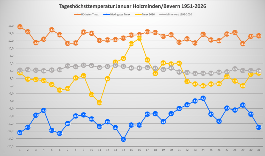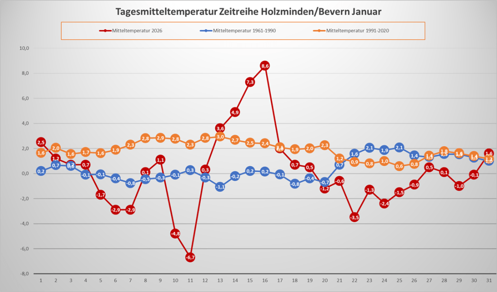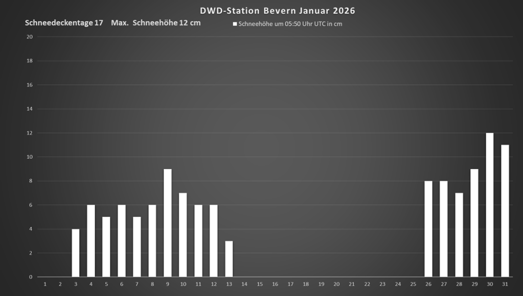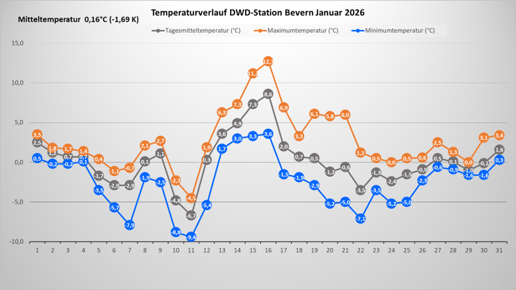 Mit einer Monatstemperatur von 0,16 °C war der Januar 2026 an der DWD-Klimastation in Bevern um 1,7 Grad kälter als im Mittel der Jahre 1991 bis 2020 und gleichzeitig der erste Monat seit dem Mai 2021 (!), der auch unter dem Klimawert der Periode 1961-1990 landete, den er um 0,25 K verfehlte. Der letzte noch kältere Januar stammt aus dem Jahr 2017 mit einer Monatstemperatur von -1,03 Grad. Der Start ins neue Jahr verlief mäßig kalt bis kalt mit leichten Nachtfrösten und Tageswerten meist etwas über dem Gefrierpunkt, bevor sich zum zweiten Wochenende stärkerer Frost ankündigte. Der kam dann auch, blieb aber bei den Tiefstwerten ein Stück über dem zunächst angenommen Strengfrost von unter -10 Grad, weil Wolken und Nebel eine stärkere Auskühlung über der Schneedecke verhinderten. Der kälteste Tag des Monats war der 11., als am Abend ein Minimum von -9,7 °C gemessen wurde, nachdem das Maximum mittags bei -4,5 °C erreicht worden war.