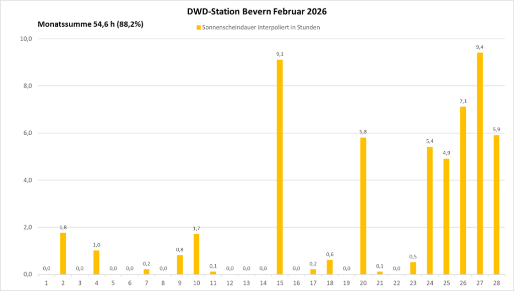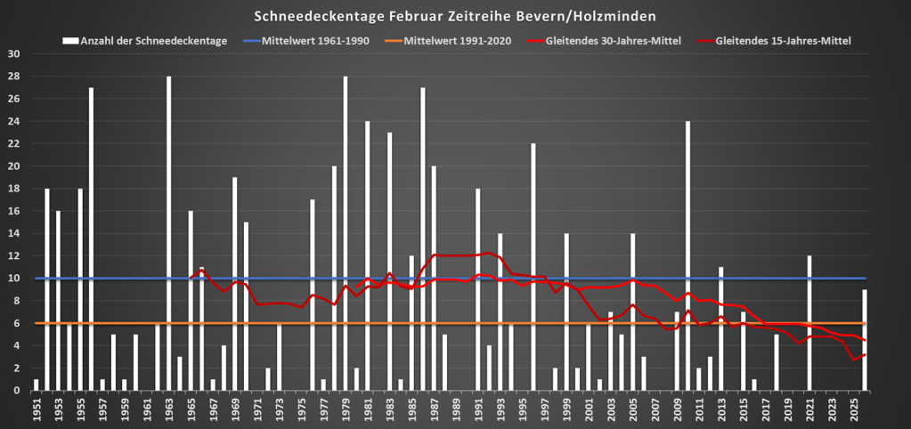 Anschließend verdrängte mildere Luft aus Südwesten die Kälte vorübergehend nordostwärts, ließ die Höchstwerte zur Monatsmitte in den zweistelligen Bereich ansteigen und den Schnee vollständig abtauen. In der dritten Dekade stellte sich eine Grenzwetterlage über Deutschland ein mit einem eisigen Nordosten und einem milden Westen und Südwesten sowie einer Übergangszone dazwischen mit unserer Region mittendrin. Unter regelmäßigen Nachtfrösten und Höchstwerten meist nur ganz leicht über dem Gefrierpunkt konnte sich zum zweiten Mal eine Schneedecke bis in die Niederungen ausbilden, die über das Monatsende hinaus anhielt. Insgesamt gab es 24 Frost- und vier Dauerfrosttage sowie 17 Tage mit einer Schneedecke in Bevern mit einer maximalen Höhe von zwölf Zentimetern am 30.01. und einer mittleren Höhe von immerhin sieben Zentimetern.