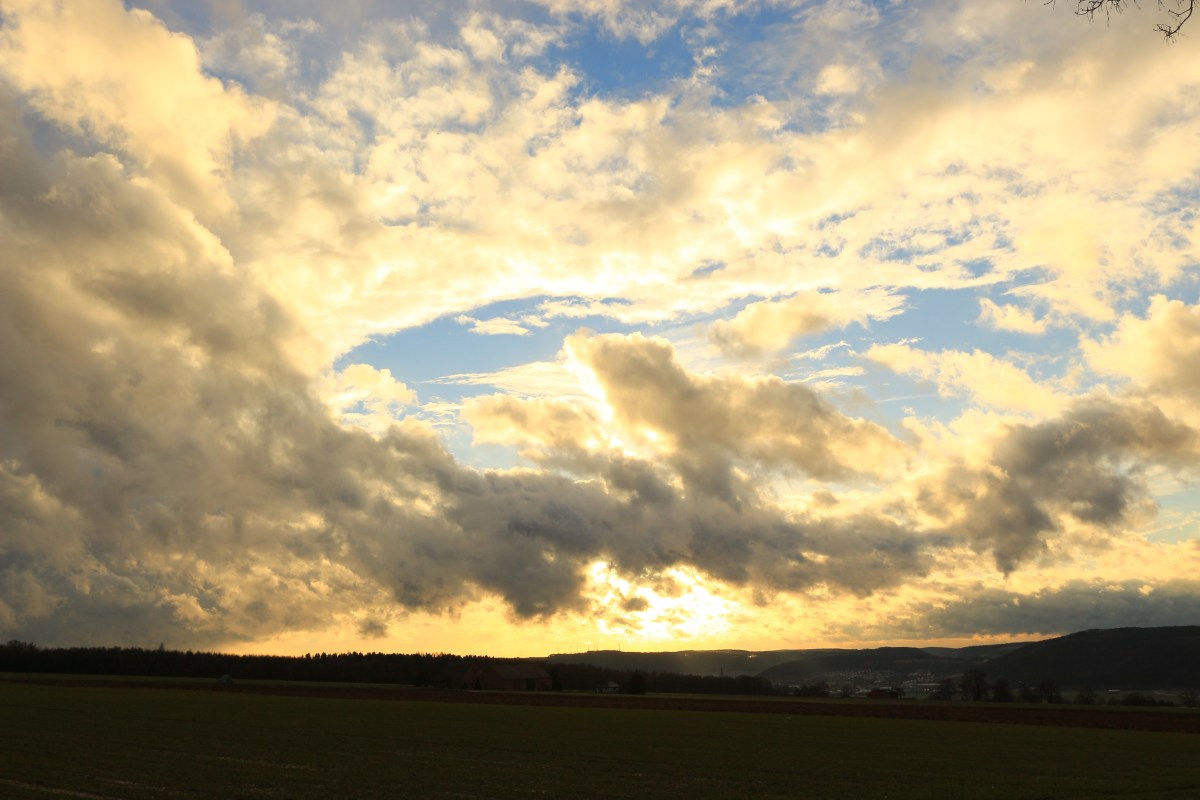 Aufreißende Wolkendecke mit Aufzug des Sturmfeldes am Donnerstagnachmittag (Blick von Hohe Eiche ins Wesertal):