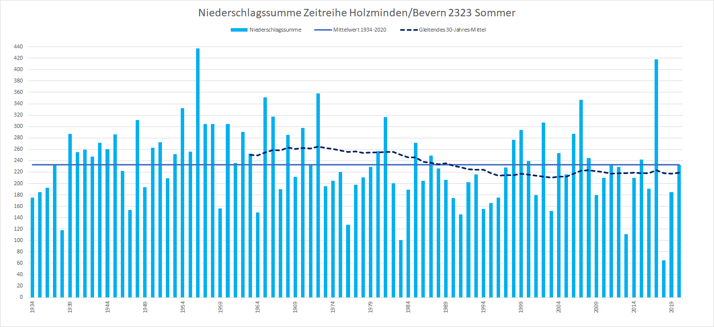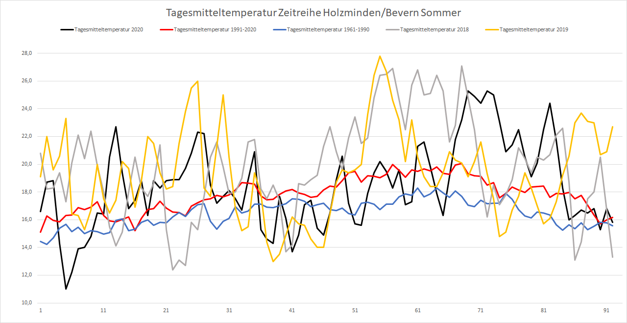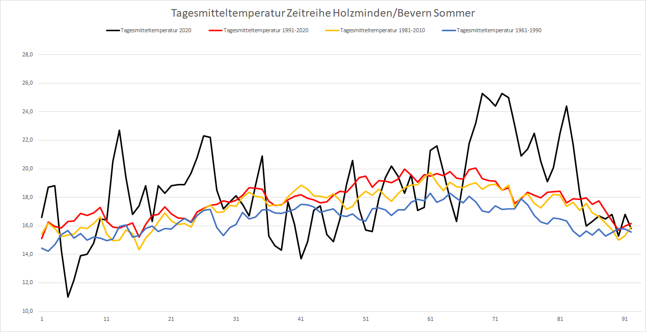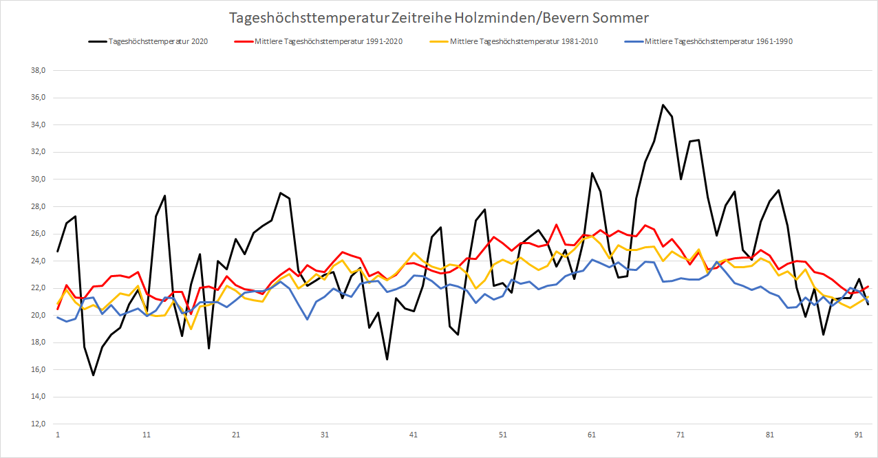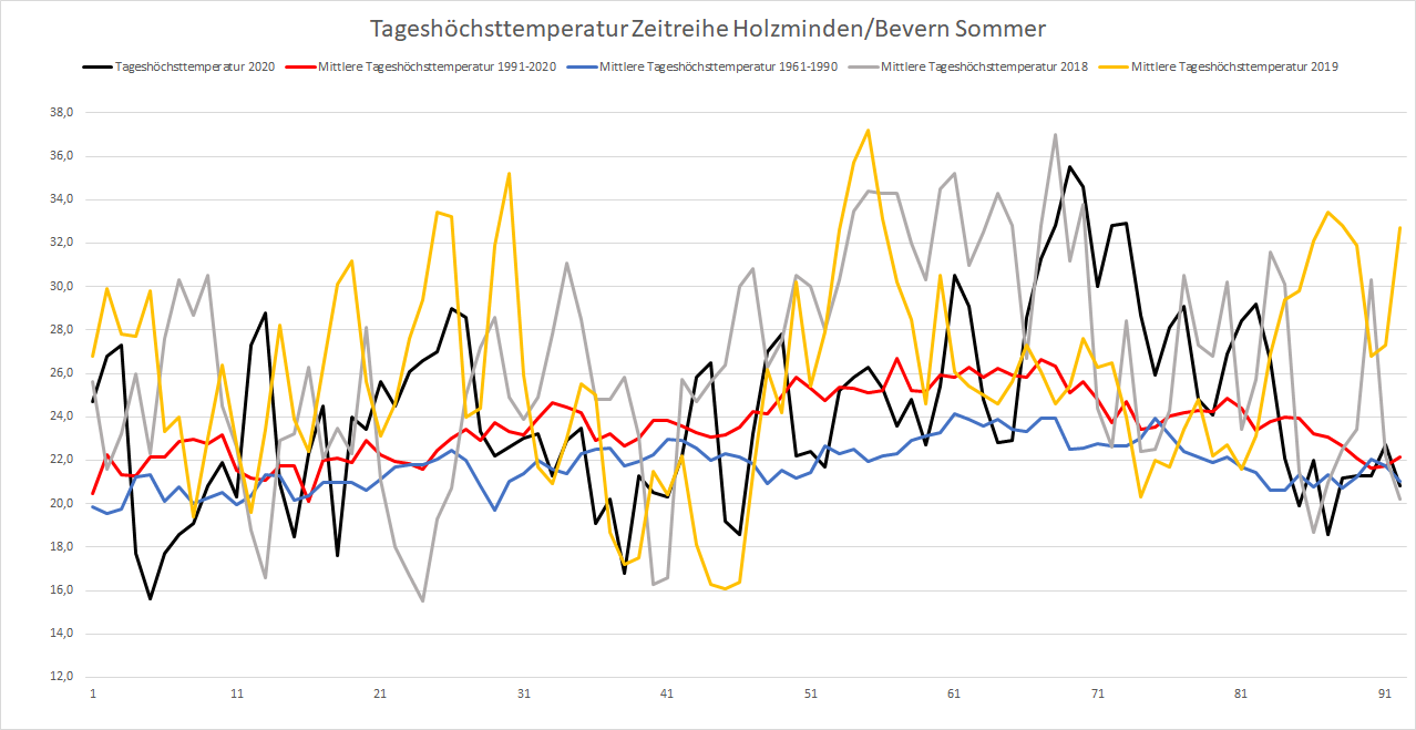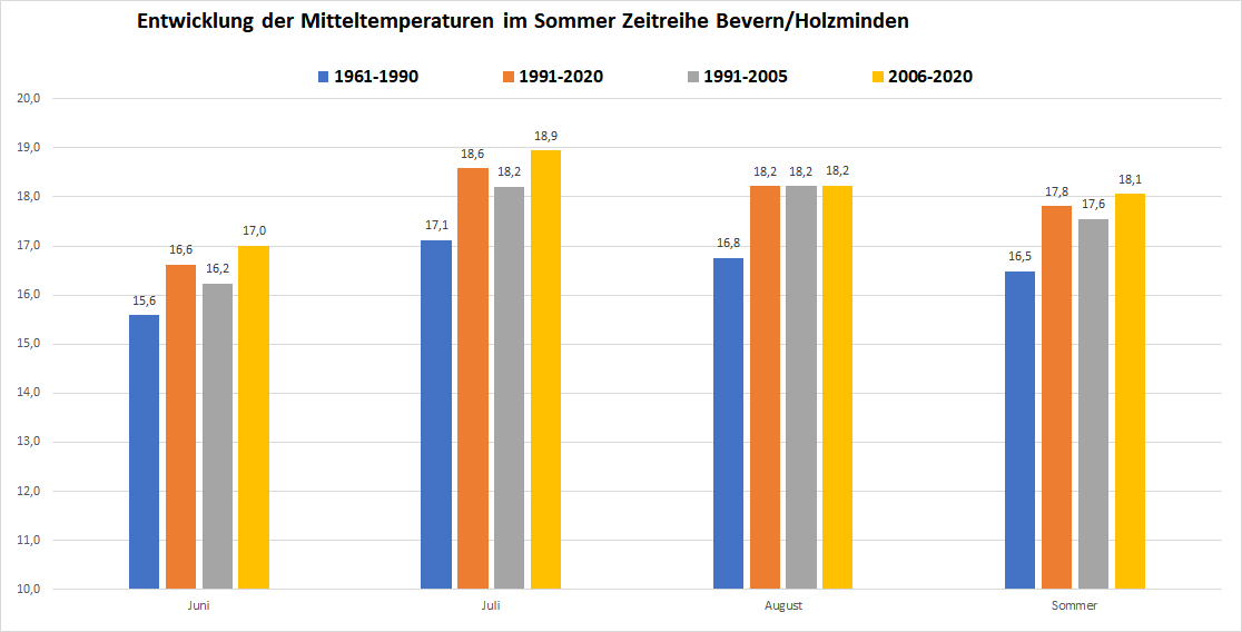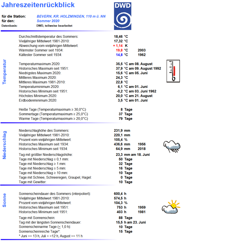 Mit einer Mitteltemperatur von 18,46 °C war es im Sommer 2020 an der DWD-Station in Bevern um 1,14 Kelvin wärmer als im Durchschnitt der Jahre 1981-2010. Noch klarer zeigt sich die Entwicklung, wenn man die internationalen 30-Jahres-Referenzperioden miteinander vergleicht: War es im Mittel der Sommer 1961-1990 noch 16,5 °C warm, sind es 30 Jahre später bereits 17,8 °C – und selbst dieser Wert wurde im Sommer 2020 um 0,65 K übertroffen. Betrachtet man innerhalb der neuen Klimanorm von 1991-2020 die erste und zweite Hälfte getrennt, findet sich zuletzt sogar ein Anstieg auf eine Mitteltemperatur von 18,1 °C.