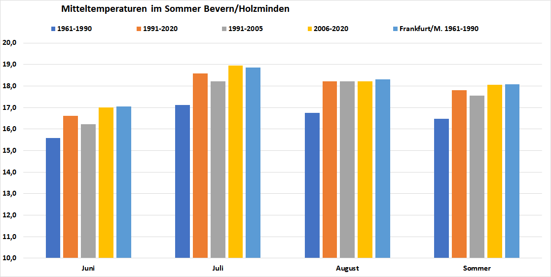 Natürlich ist es auch im Rhein-Main-Gebiet wärmer geworden, dort liegt der aktuelle 30-Jahresschnitt im Sommer bei fast 19,7 °C und in den letzten Jahren ging es sogar regelmäßig über die 20-Grad-Marke, die bei uns noch nicht erreicht wurde, auch wenn ihr die Sommer 2003 und 2018 sehr nahe kamen. Doch obwohl der aktuelle Sommer bis auf die Augusthitze unauffällig blieb und bei den heißen Tagen mit acht sogar leicht unterdurchschnittlich, wurden erstmals drei Sommer in Folge mit über 18 °C Mitteltemperatur an der Station Bevern registriert. Die jüngsten sechs waren alle mindestens 17,95 °C warm – eine solche Serie hat es zuvor nicht annähernd gegeben: Von 1934 bis 2001 brauchte es noch 68 Jahre, um sechs solch warmer Sommer zu zählen, von denen nie mehrere aufeinander folgten.