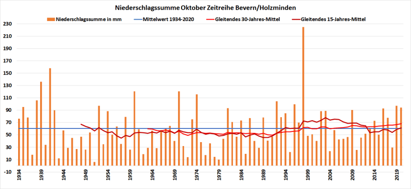 Zwar gab es im Wesertal nach der Beendigung der Messungen in Holzminden Ende Juli 1991 eine noch längere Unterbrechung der Zeitreihe bis zur Inbetriebnahme der Klimastation in Bevern im Juli 2006, für den Niederschlag liegen aber mit Stahle (bis 2000), Negenborn (bis 1997) und Lüchtringen (bis heute) genügend Ersatzstationen auf vergleichbarer Höhenlage für eine Berechnung vor. Demnach liegt das neue 30-Jahresmittel für Bevern und Holzminden im Oktober bei 68,3 mm – ein deutlicher Zuwachs von gut 18 mm oder 36% gegenüber dem Durchschnitt von 1961-1990.
