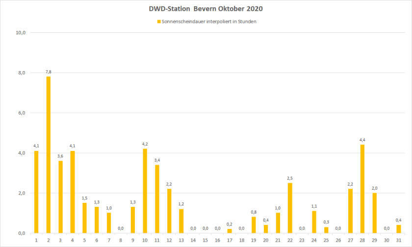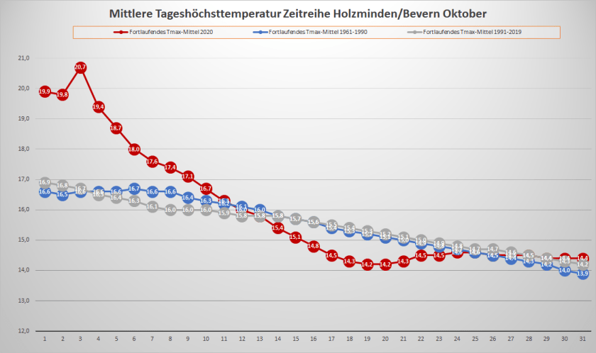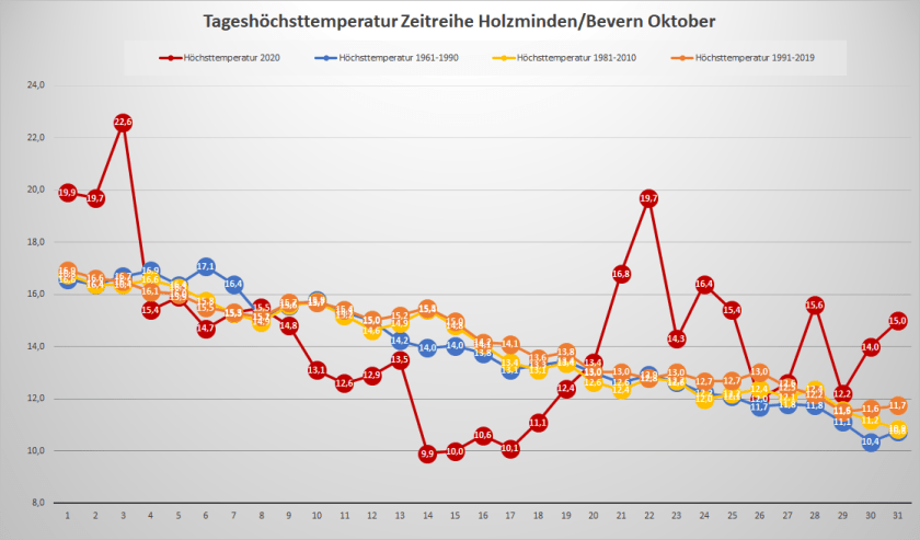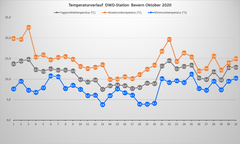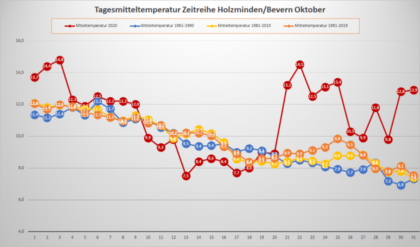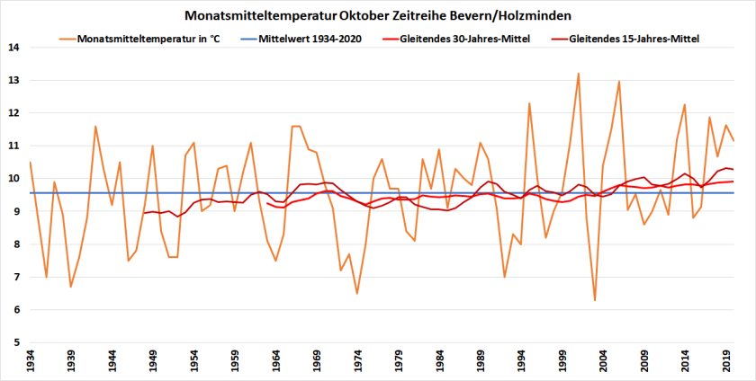 Mit einer Mitteltemperatur von 11,15 °C war der Oktober 2020 an der DWD-Station in Bevern um 1,44 Grad wärmer als im Mittel der Jahre 1981-2010. Damit war er der zwölftwärmste seit Beginn der Aufzeichnungen im Jahr 1934. In den letzten vier Jahren landete der Oktober bei mindestens 10,6 °C, erst zum zweiten Mal nach 1966-1969 gab es viermal in Folge eine zweistellige Mitteltemperatur. Die Jahre 2011-2020 markieren zudem den wärmsten Zehnjahresdurchschnitt im Oktober. Dennoch fällt die langfristige Erwärmung in keinem anderen Monat so gering aus: Das neue 30-Jahres-Mittel von 1991-2020 liegt mit 9,91 °C nur um 0,4 K über dem der Periode 1961-1990. Ähnlich verhalten ist die Entwicklung lediglich noch im September.