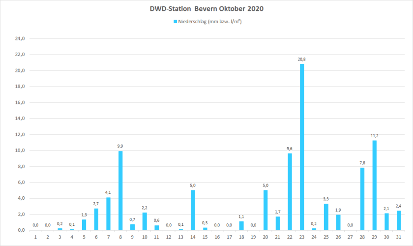 Während der September noch deutlich zu trocken ausgefallen war, regnete es im Oktober häufig an insgesamt 24 Niederschlagstagen und zeitweise auch ergiebig. Höhepunkt waren zwei Regenbänder, die die Region am 22. und 23.10. überquerten und dabei Mengen von bis zu gut 30 mm innerhalb von nur 27 Stunden hinterließen, zeitweise in starken Schauern, die am Abend des 22. sogar von Blitz und Donner begleitet wurden.