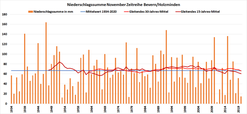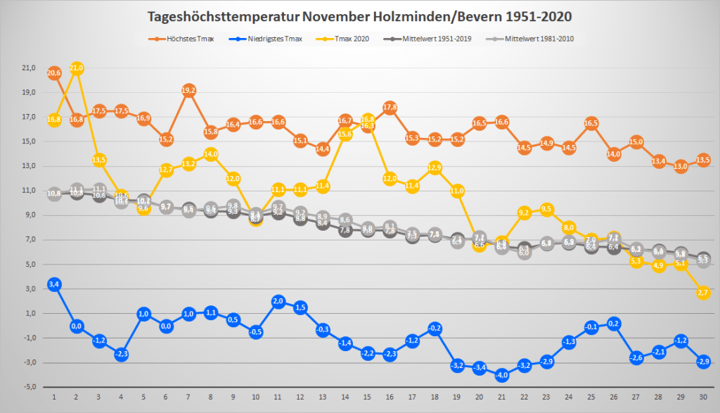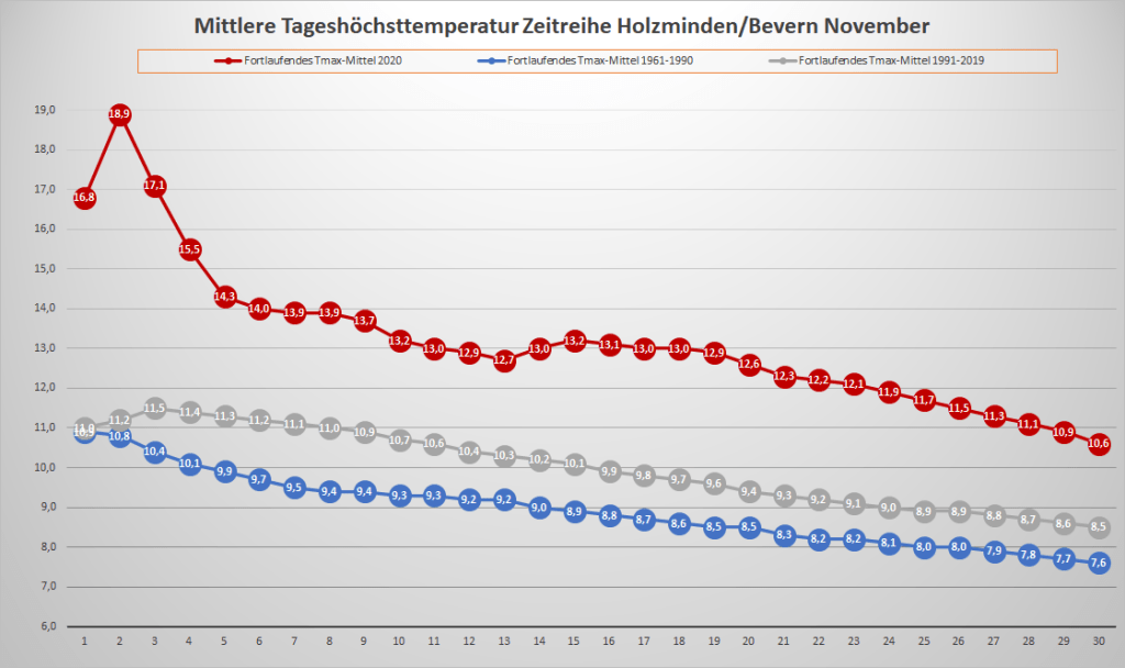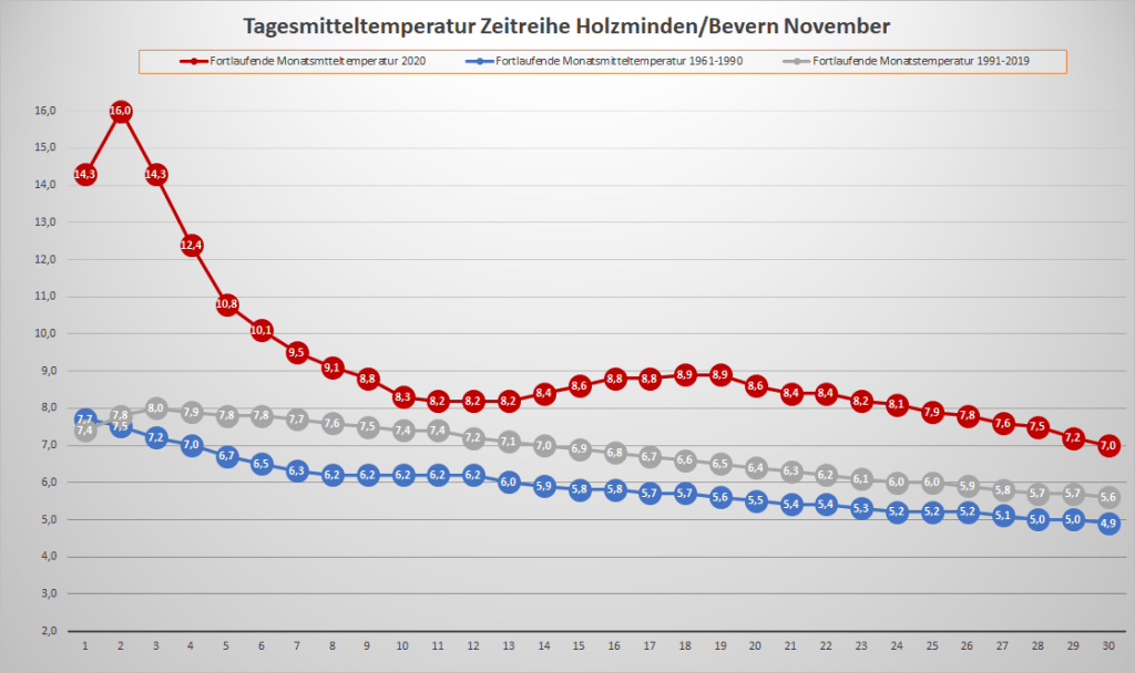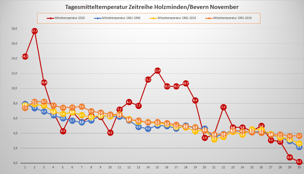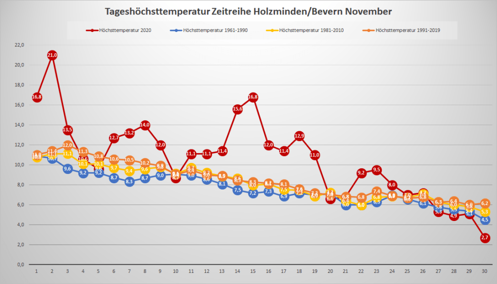 Mit einer Mitteltemperatur von exakt 7,00 °C war der November 2020 an der DWD-Station in Bevern um 1,72 Grad wärmer als im Mittel der Jahre 1981-2010. In der Zeitreihe Holzminden/Bevern ab 1934 ist der dritte meteorologische Herbstmonat zehnmal wärmer, dreimal gleichwarm und 73 Mal kälter ausgefallen. Das neue, ab 2021 offiziell gültige Temperaturmittel der Jahre 1991-2020 liegt für den November bei 5,64 °C, was einer Erwärmung von knapp 0,8 Kelvin gegenüber der Periode 1961-1990 entspricht. Der Mittelwert der vergangenen 15 Jahre liegt bereits bei 6,22 °C.