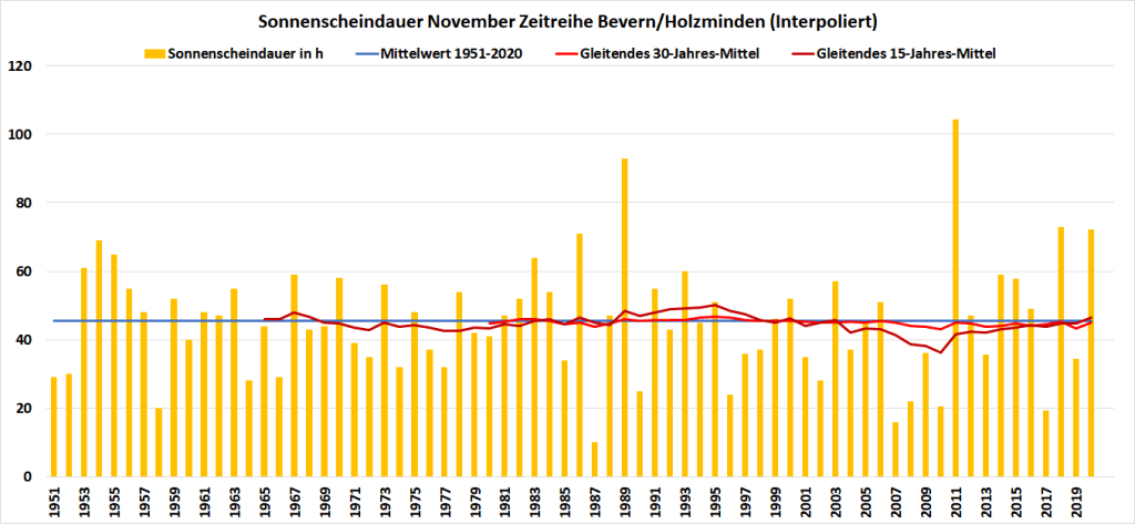 So lag die Monatssumme von gut 72 Stunden einerseits um gut zwei Drittel über dem Mittelwert der Jahre 1981-2010, andererseits sind auch dies nur knapp zweieinhalb Stunden pro Tag im Schnitt – was aber dennoch für den viertsonnigsten November seit 1951 hinter 2011, 1989 und 2018 reichte. Die langjährigen Mittelwerte kommen trotz der beiden sonnigen Vertreter in den letzten drei Jahren aber auch nicht vom Fleck und verharren bei 45 Stunden.