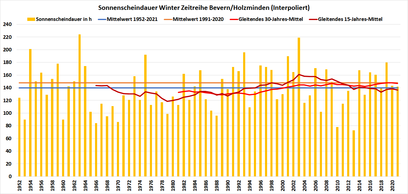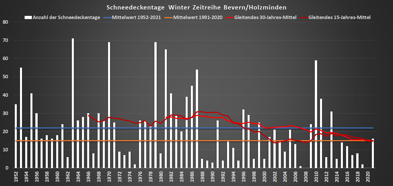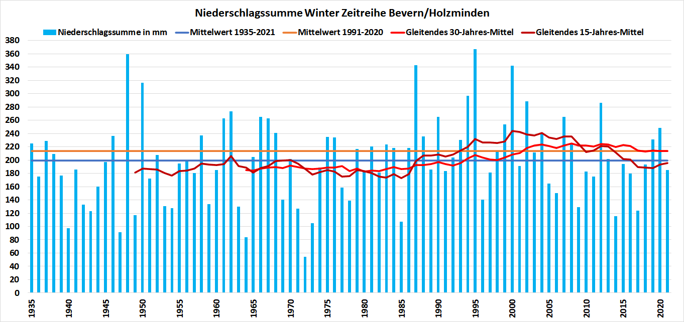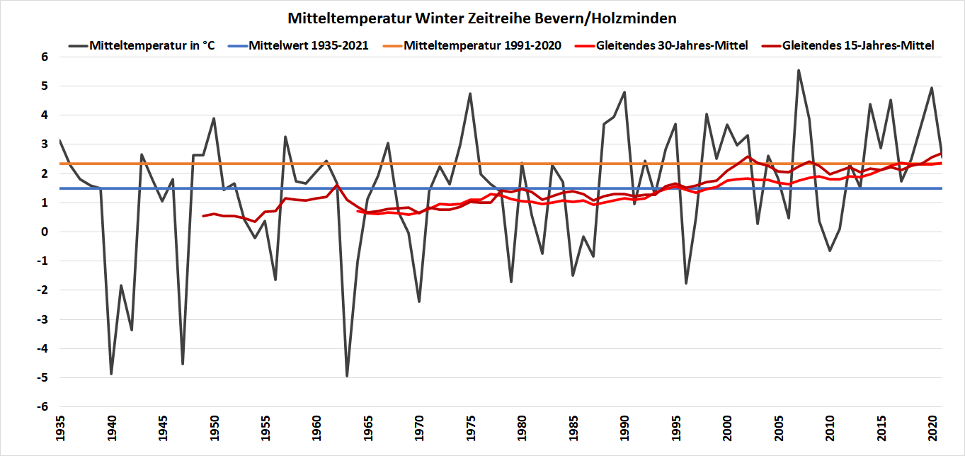 Mit einer Mitteltemperatur von 2,56 °C sortiert sich der Winter 2021 zwar als einer der kälteren der letzten zehn Jahre, aber im längeren Betrachtungszeitraum als durchaus mild ein. Seit Messbeginn 1934 in Holzminden waren bezogen auf den Standort Bevern 26 Winter wärmer und 60 kälter. Im Vergleich zum Klimamittel 1991-2020 steht ein zartes Plus von 0,2 K, gegenüber dem älteren der Jahre 1961-1990 fällt es mit 1,4 K deutlicher aus.