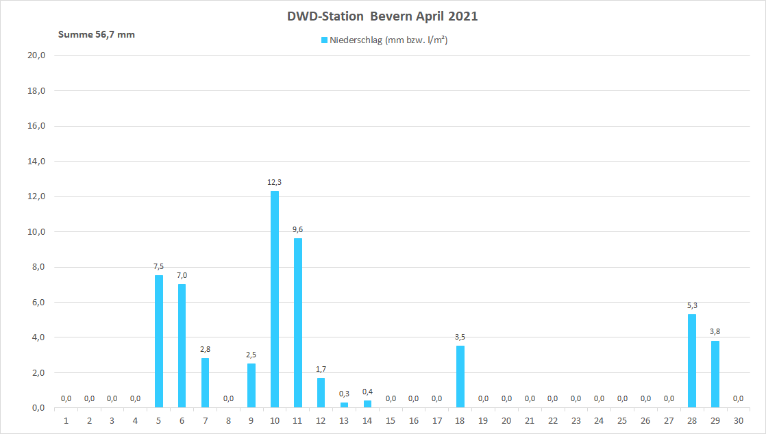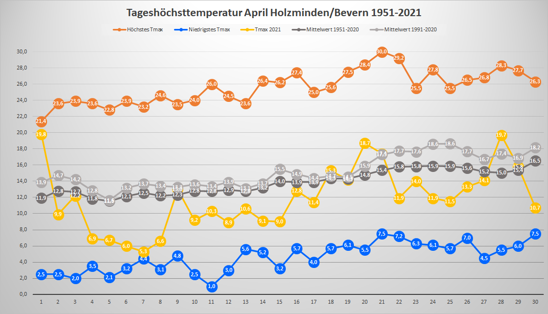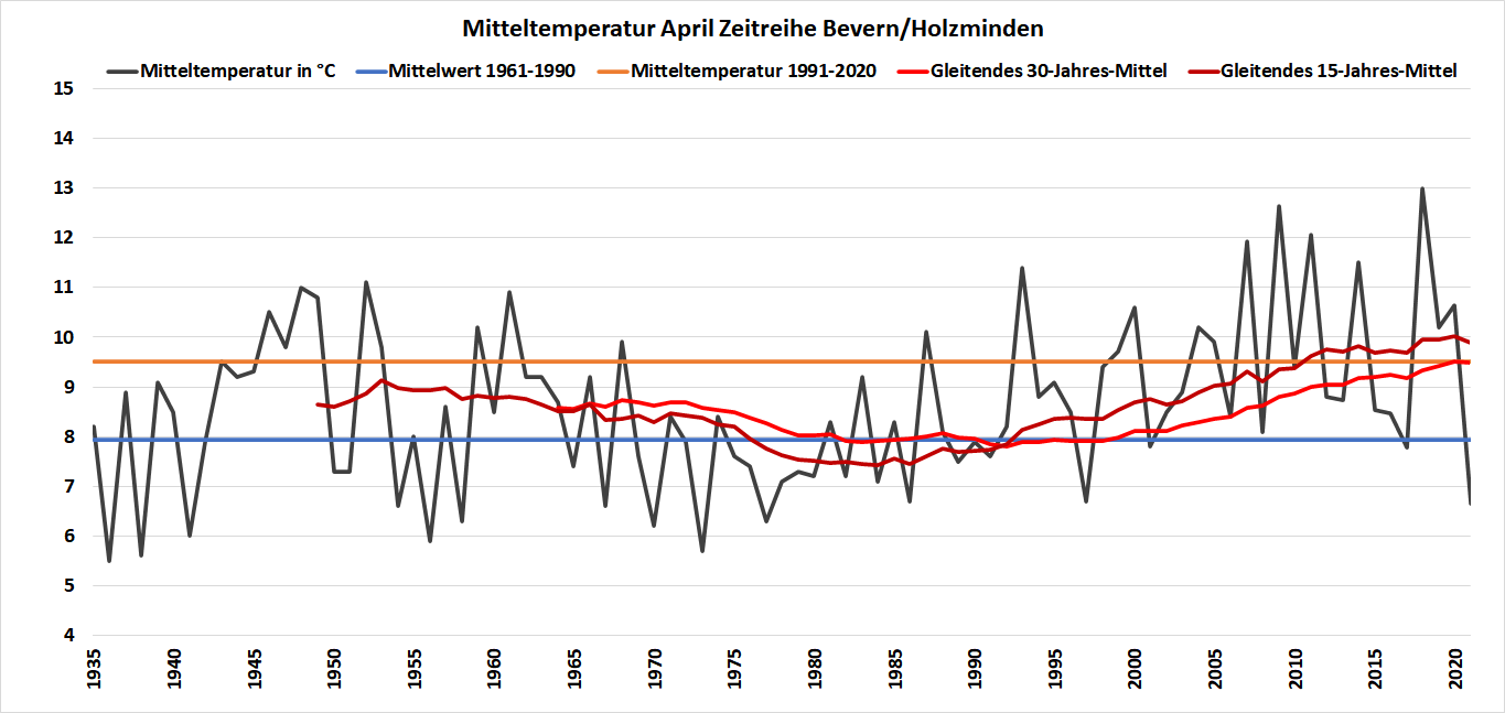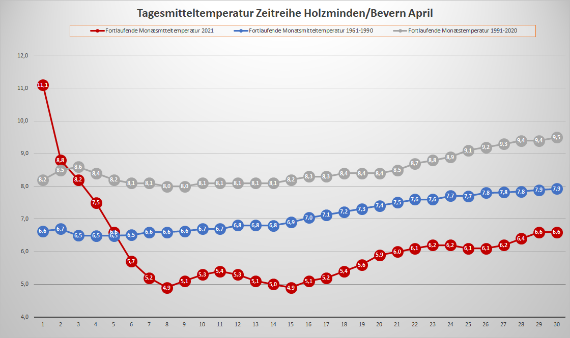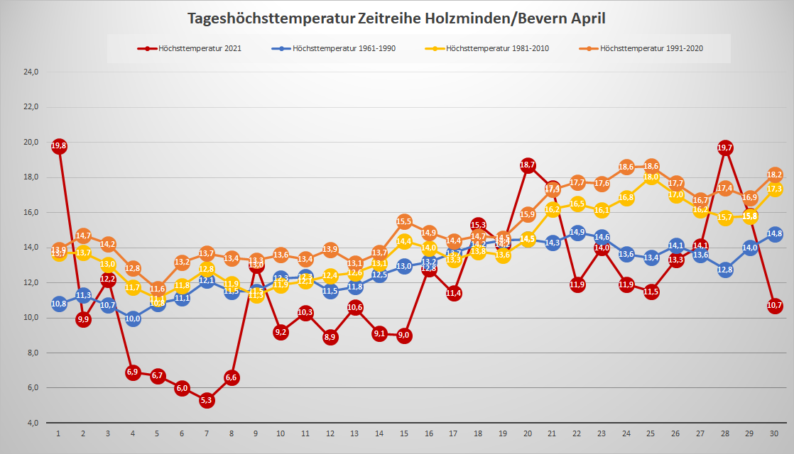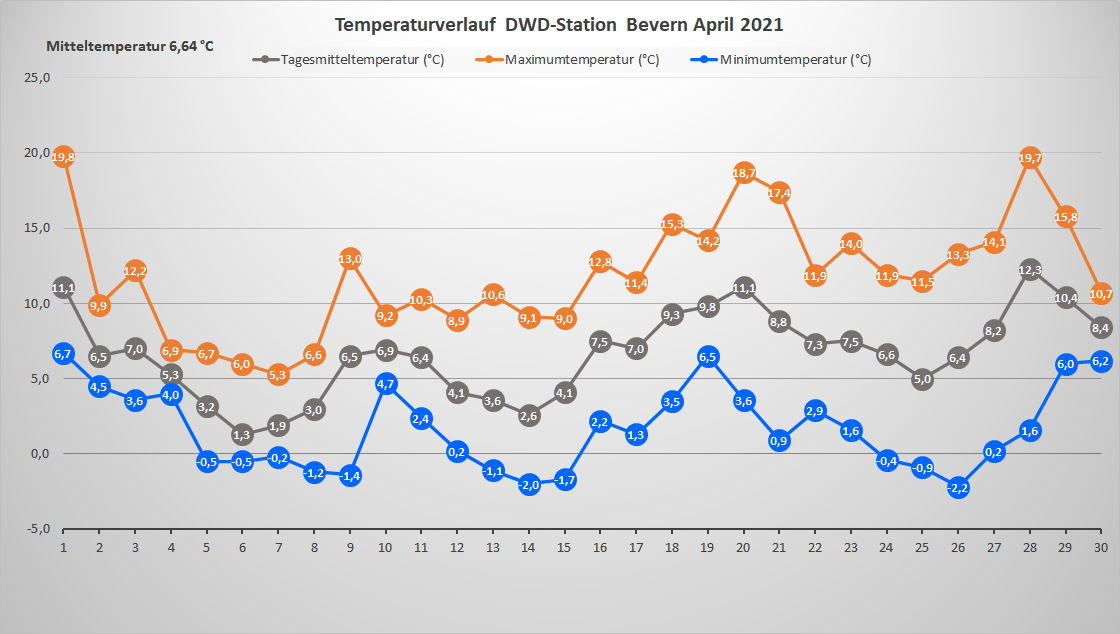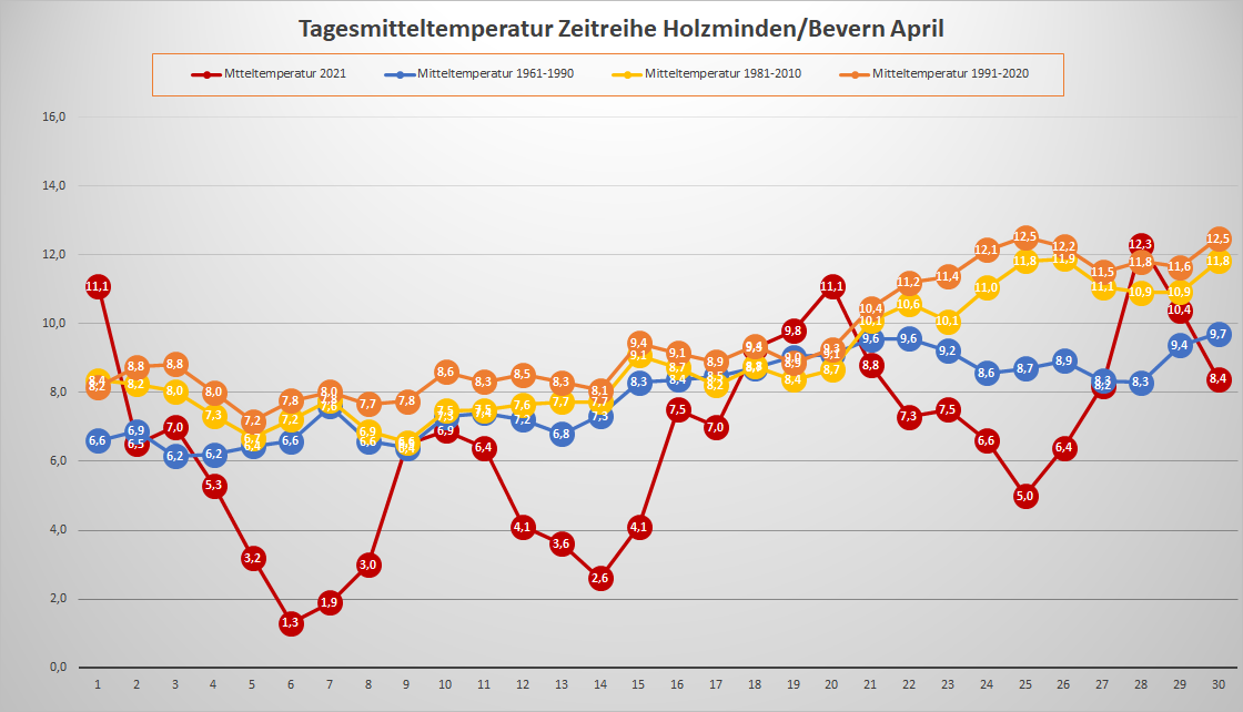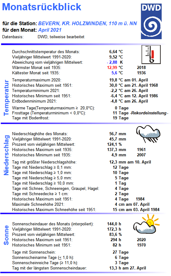 Mit einer Monatstemperatur von 6,64 °C war der April 2021 an der DWD-Station in Bevern um 2,9 Kelvin kälter als das Mittel der aktuellen Klimaperiode 1991-2020. In den letzten 15 Jahren hatte es im zweiten meteorologischen Frühjahrsmonat mehrfach sehr warme Vertreter mit Temperaturen über elf Grad gegeben, der Rekord vor drei Jahren kratzte sogar an der 13-Grad-Marke. Zwischendurch gab es zwar auch immer wieder kühlere Exemplare, aber wirklich kalt war es seit nunmehr 20 Jahren nicht – 2001 wurde letztmals das ältere und niedrigere Klimamittel der Jahre 1961-1990 von 7,93 °C verfehlt. Ähnlich tief wie in diesem Jahr war das Temperaturniveau zuletzt im April 1997, als es keine Wetterstation vor Ort im Wesertal gab und sich aus den Werten der Umgebung wie Hameln und Oberweser (heute Wesertal) sowie Moringen-Lutterbeck ein Wert von 6,7 °C errechnet. Auch 1986 kommt auf eine Apriltemperatur von 6,7 °C, gemessen an der damaligen Station in Holzminden am Bergblick/Sonnenwinkel, zweifelsfrei noch kälter war es zuletzt im April 1977 mit 6,3 °C, die am Vorgängerstandort Über dem Gerichte ermittelt wurden.
