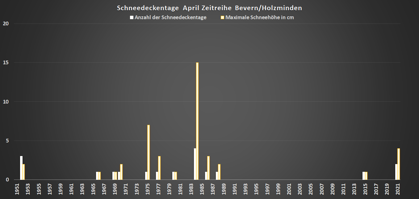 Was man aber auch festhalten muss: Einzelne Tage mit einer dünnen Schneedecke von meist 1-2 cm sind im Hochsolling auch in den letzten 30 Jahren im April immer wieder mal vorgekommen – ab und zu sogar noch nach Monatsmitte. Ganz anders sieht es im Wesertal aus: Auch dort finden sich bis zum Ende der 1980er Jahre immer wieder mal späte Schneedecken im April, meist nur kurz und auch nicht allzu hoch, aber es gab sie – in den Achtzigern immerhin in vier Jahren. 1984 ragt auch hier mit bis zu 15 cm deutlich heraus. Mit Beginn der globalen Erwärmung am Ende des Jahrzehnts war es dann wie abgeschnitten: 27 Jahre passierte nichts mehr, erst am 2. April 2015 gab es wieder eine offizielle Schneedeckenmeldung von der 2006 in Betrieb genommenen Station in Bevern, die mit einem Zentimeter aber gerade einmal die Mindesthöhe erreichte. Erst vor gut vier Wochen konnte Beobachter Manfred Springer an „seiner“ DWD-Station nun zum zweiten Mal seit Wiederbeginn der Messungen morgendliche handgemessene Schneehöhen im April nach Offenbach melden: Zunächst einen Zentimeter am 6. und einen Tag später sogar vier Zentimeter, die damit den höchsten Wert der Klimareihe seit 1984 und zugleich Stationsrekord am Standort Bevern im April bedeuten.