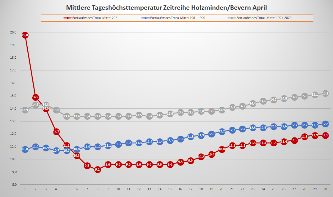 Doch nicht nur Monatsmitteltemperatur fiel außergewöhnlich niedrig aus, auch die Tageswerte unterstreichen die hartnäckige Kälte: Mit elf Frosttagen in Bevern wurde der Rekord in der Messreihe Holzminden/Bevern aus dem Jahr 1958 eingestellt. Bodenfrost in fünf Zentimetern über dem Erdboden trat sogar an 19 Tagen auf und im Vergleich zu den durchschnittlichen täglichen Höchstwerten der letzten 30 Jahre waren 25 Tage im April kälter und nur fünf wärmer. Das Maximum wurde mit 19,8 °C gleich am Monatsersten erreicht und lag erstmals seit 1997 unter der 20-Grad-Marke.