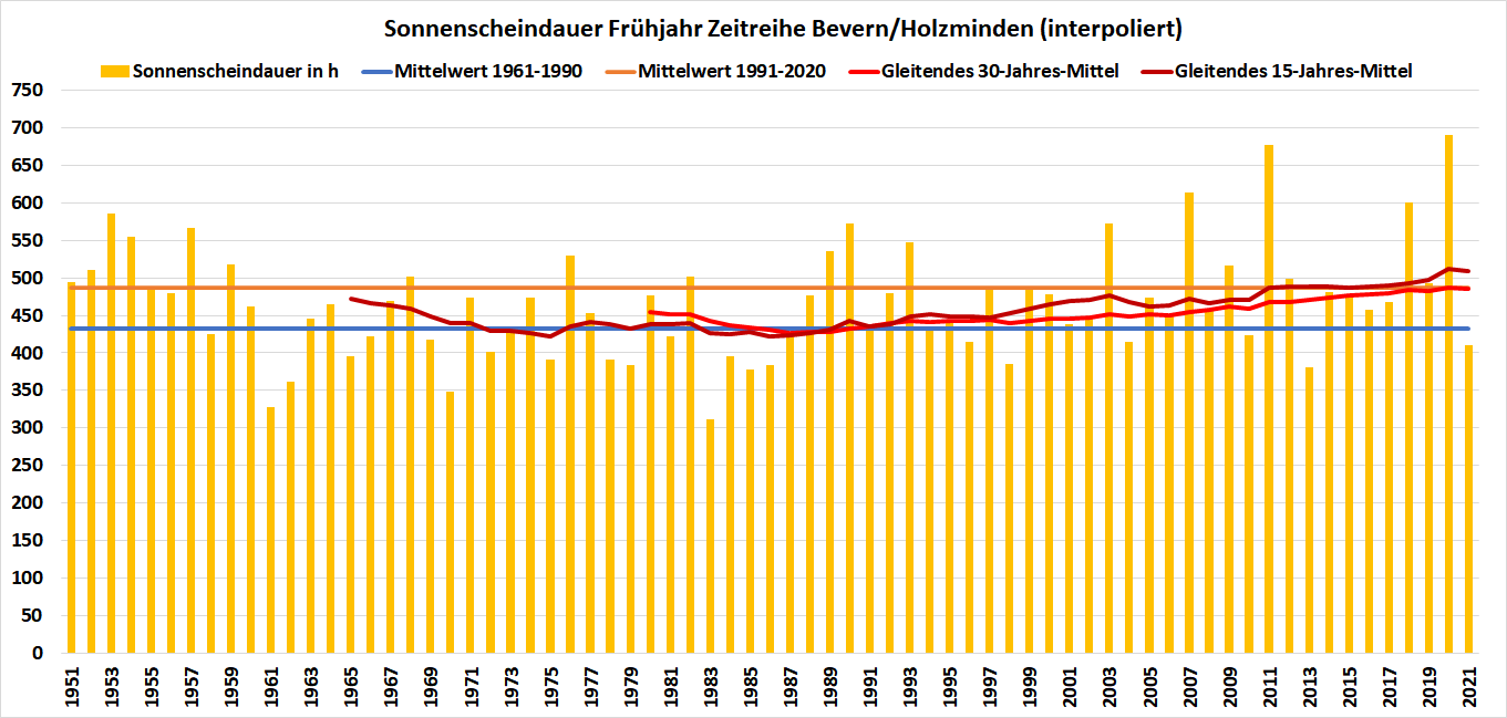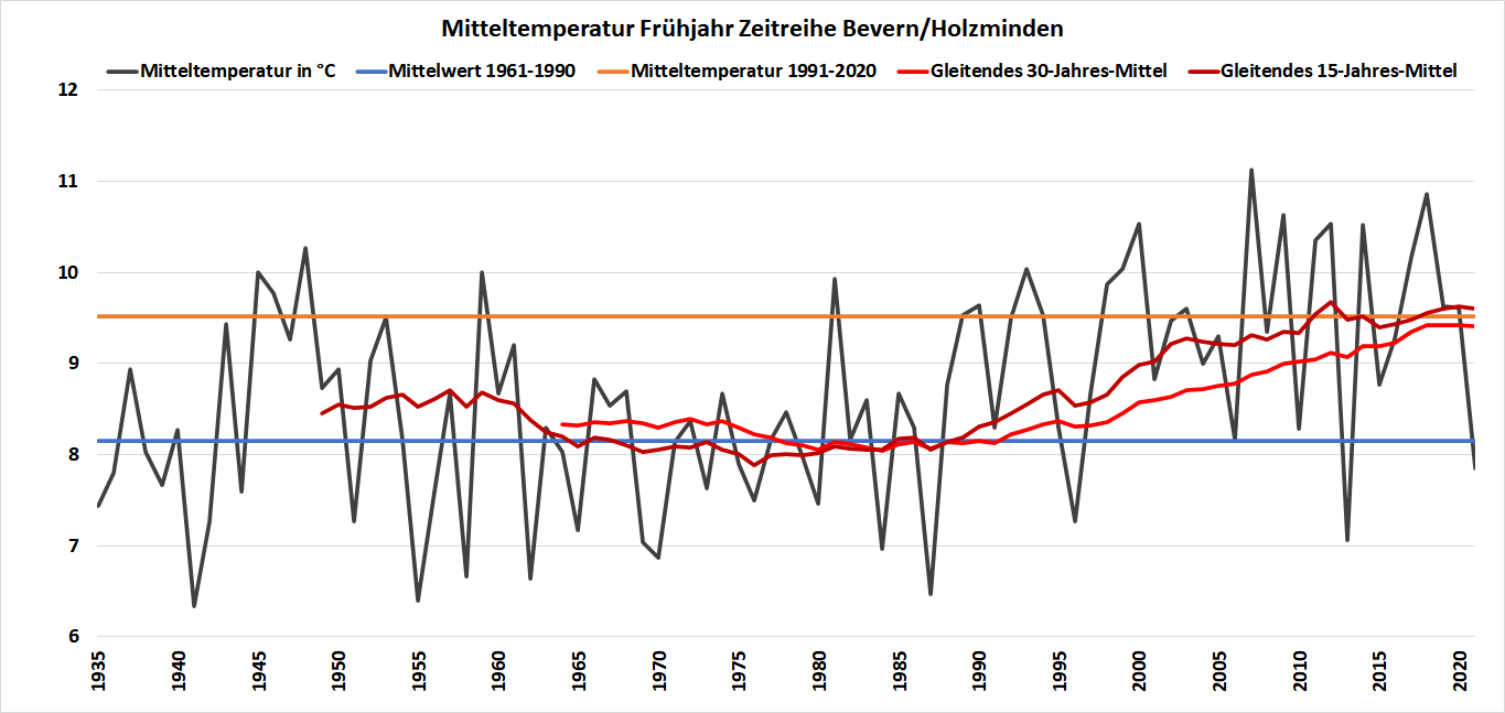 Ein März, ein April auf Märzniveau und ein Mai auf Aprilniveau – so lässt sich das meteorologische Frühjahr 2021 bei den Temperaturen nur wenig zugespitzt zusammenfassen. Unter dem Strich war es das kühlste seit 2013, als allerdings ein extrem kalter März für Schlagzeilen sorgte und den Wert drückte. Mit nur 7,85 °C war der aktuelle Frühling an der Station in Bevern der drittkälteste seit Beginn der globalen Erwärmung 1987 – nur 2013 und 1996 liegen noch darunter. Das Klimamittel der letzten 30 Jahre wurde um fast 1,4 K verfehlt und selbst gegenüber der älteren Periode 1961-1990 steht ein Minus von 0,3 K. Die in Silberborn erzielten 5,6 °C bedeuten sogar eine Abweichung von fast -1,8 K im Vergleich zum Klimawert seit 1991, auch dort war es das drittkälteste Frühjahr seit 1987 hinter 1996 und 2013, wobei 2006 anders als in Bevern mit dem aktuellen Frühling gleichauf liegt.