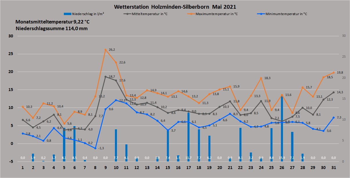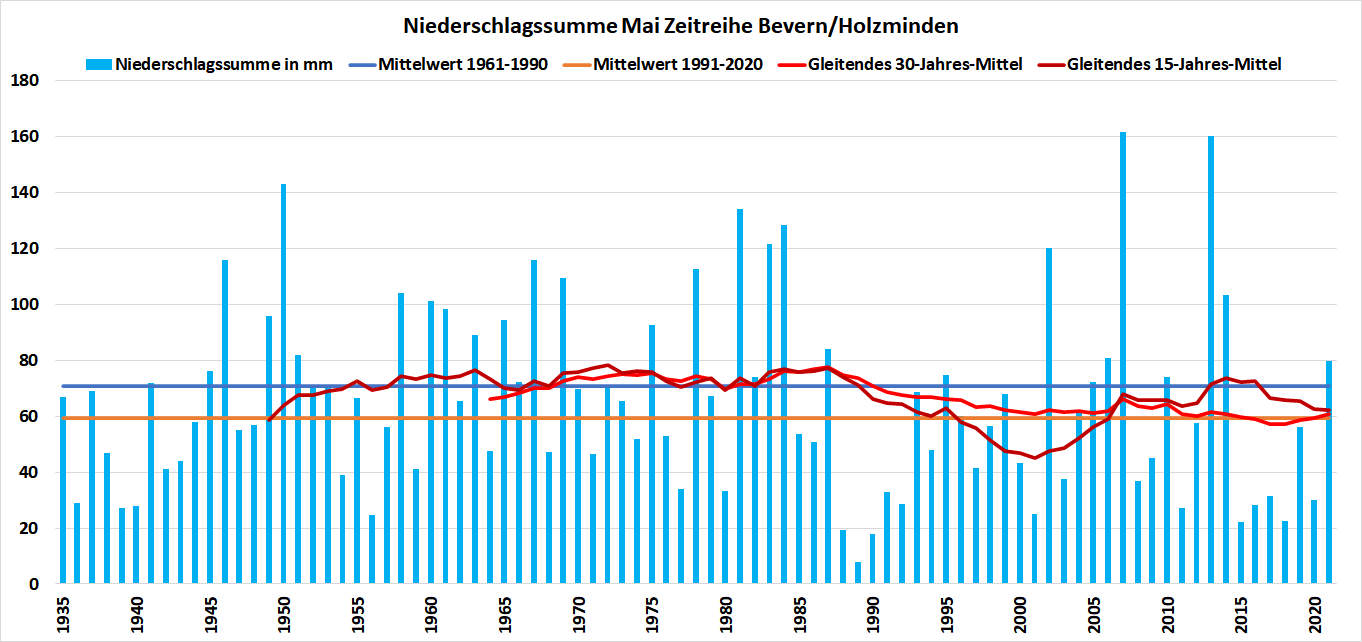 Doch damit war Bevern sogar noch die „trockenste“ Station im Kreis und den angrenzenden Gebieten: Lüchtringen meldete 97,7 mm, Polle 98,1 mm und Hehlen 94,2 mm. In Vorwohle waren es 88,1 mm und in Amelith 84,0 mm, während in Hellental mit 102,9 mm die 100er-Marke ebenso überschritten wurde wie in Ottenstein mit 105 mm. Spitzenreiter war Silberborn, wo sogar 114 mm gemessen wurden – gut die Hälfte mehr als im Schnitt der vergangenen 30 Jahre und Balsam für die Sollingwälder. Insgesamt war es der nasseste Mai seit 2014.