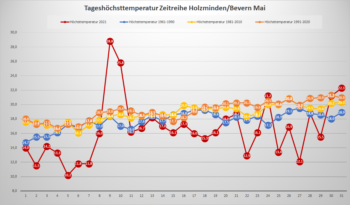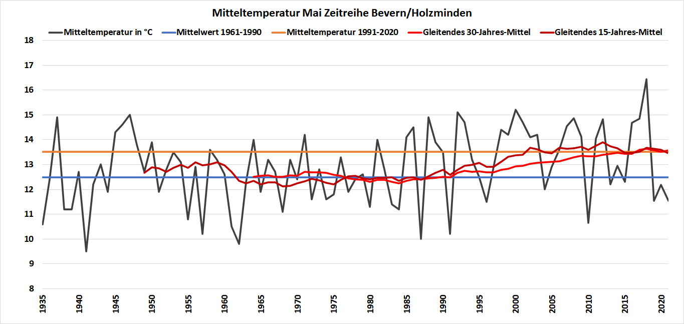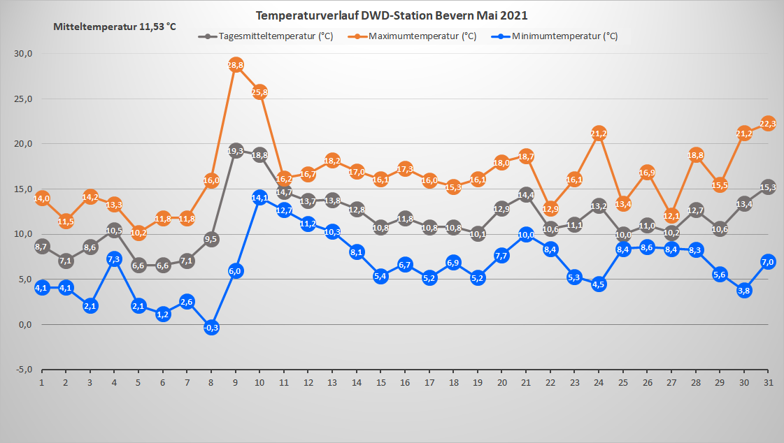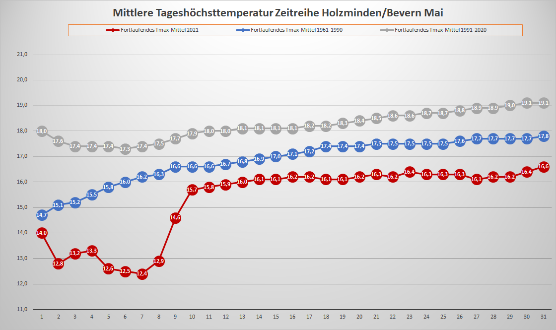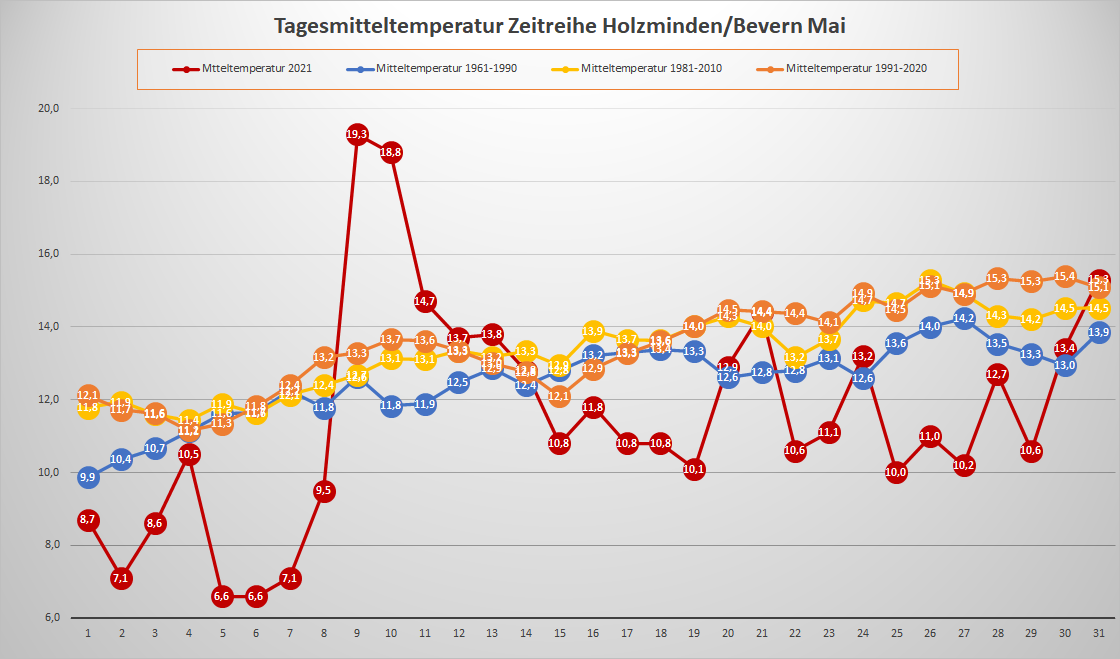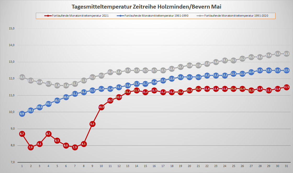 Mit einer Monatstemperatur von 11,53 °C war der Mai 2021 an der DWD-Station in Bevern um glatt 2,0 Kelvin kälter als das Mittel der aktuellen Klimanorm von 1991-2020. Nach dem Wärmerekord im Jahr 2018 war es der dritte Mai in Folge, in dem sogar das Klimamittel der älteren und weniger warmen Periode von 1961-1990 verfehlt wurde. Drei so kühle Maie nacheinander – eine solche Serie besitzt Seltenheitswert, ist doch die letzte von 1961-1963 fast 60 Jahre her. Bezogen auf die letzten 30 Jahre war es sogar zusammen mit 2019 und 1996 der zweitkälteste Mai hinter 2010, als nur 10,7 °C gemessen wurden. Noch kälter war es zuvor im Mai 1991 mit nur knapp über zehn Grad, auf den dann noch ein ausgesprochen kühler Juni folgte. So weit dürfte es aber in diesem Jahr nicht kommen, wie die ersten Tage des meteorologischen Sommers bereits gezeigt haben.