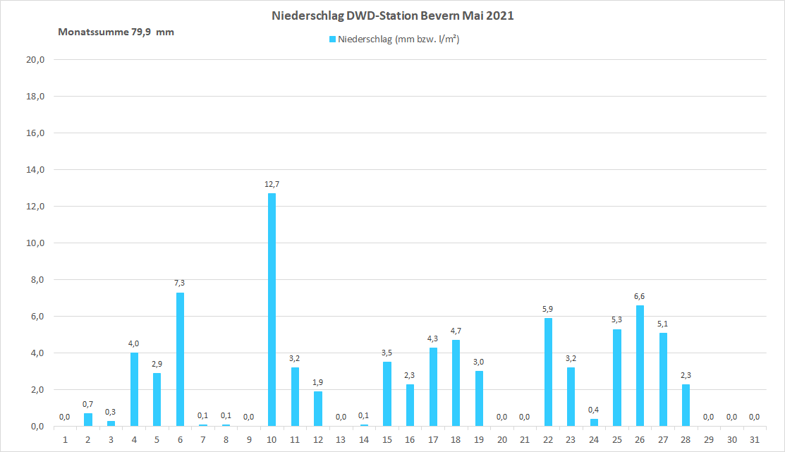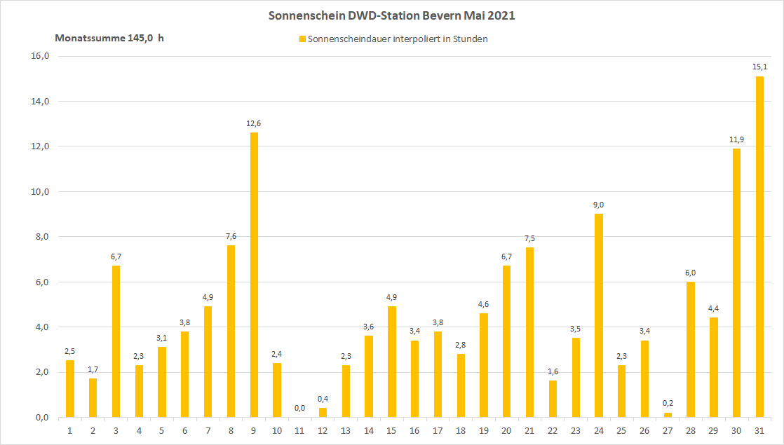Wie schon im April war nicht nur die niedrige Durchschnittstemperatur auffällig, sondern auch die geringe Anzahl warmer Tage mit einer Höchsttemperatur von mindestens 20 Grad. Davon schaffte der Mai deutlich unterdurchschnittliche fünf, zwei davon während des einzigen kurzen Vorstoßes sehr warmer Luftmassen zum Ende der ersten Dekade waren sogar Sommertage mit bis zu 28,8 °C. Vergleicht man die einzelnen Tageshöchstwerte in Bevern mit dem jeweiligen Durchschnittswert der letzten 30 Jahre, so wurde dieser an nur vier Tagen übertroffen, aber an 27 Tagen verfehlt. Schon im April hatte dieses Verhältnis bei außergewöhnlichen 5:25 gelegen. Und wenn man bei den Monatstemperaturen April und Mai gemeinsam betrachtet, kommt man auf nur 9,1 °C – noch tiefere Werte findet man in der lokalen Klimageschichte nur 1991 und dann erst wieder 1941 sowie in den 1930er-Jahren. Mit anderen Worten: es war in den acht Wochen vor Maiende nicht nur gefühlt, sondern auch objektiv gemessen wirklich außergewöhnlich kühl, wobei im Mai weniger als im April kalte Nächte die Ursache waren: Der einzige und schwache Luftfrost wurde in Bevern mit -0,3 °C ebenso am 8. Mai gemessen wie der letzte Bodenfrost – von Eisheiligen also keine Spur.