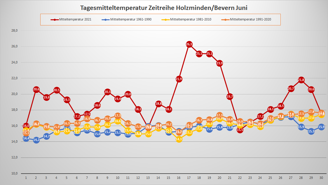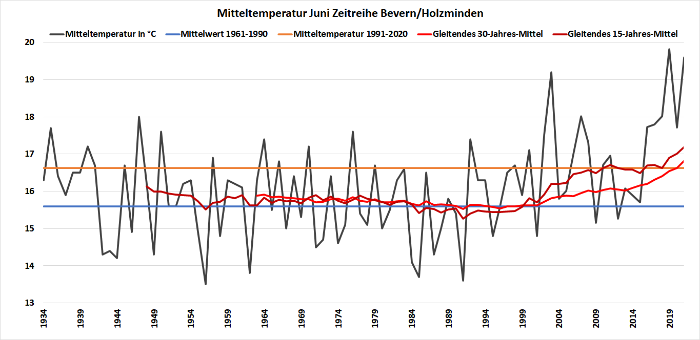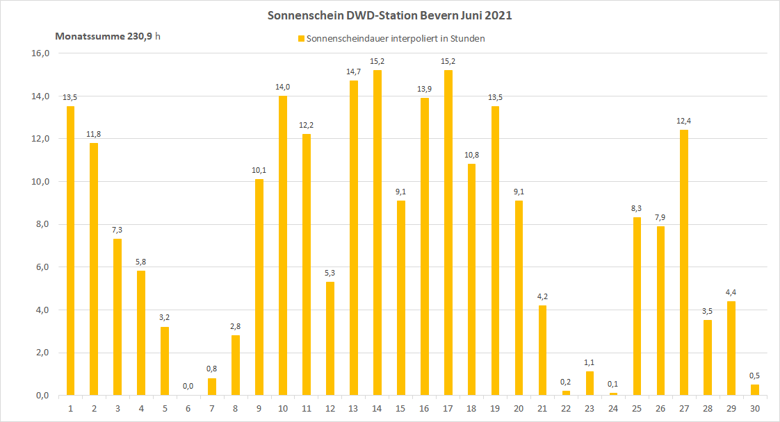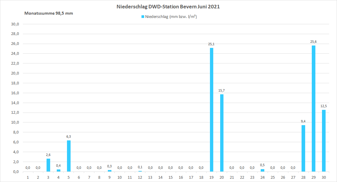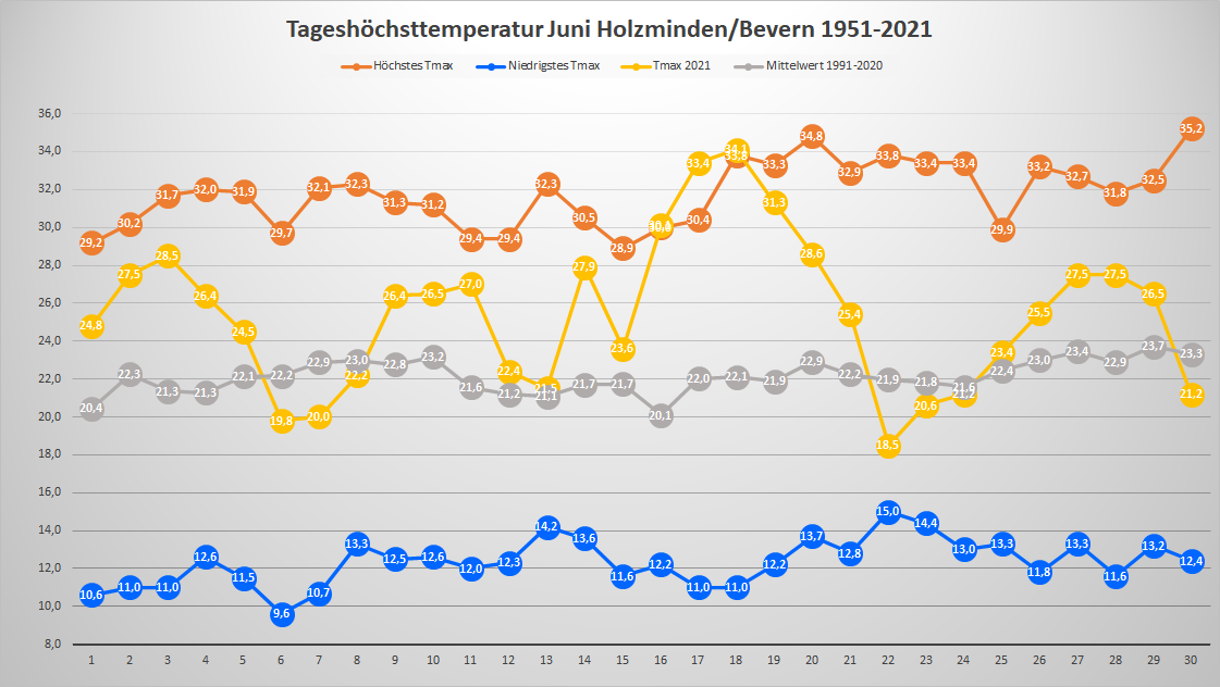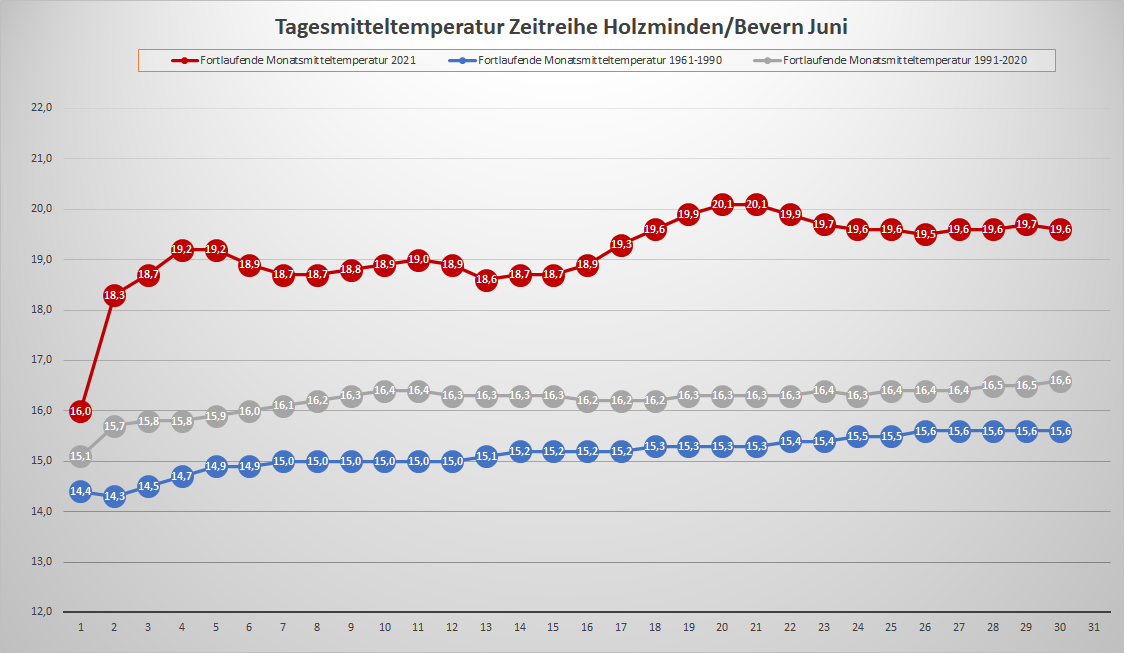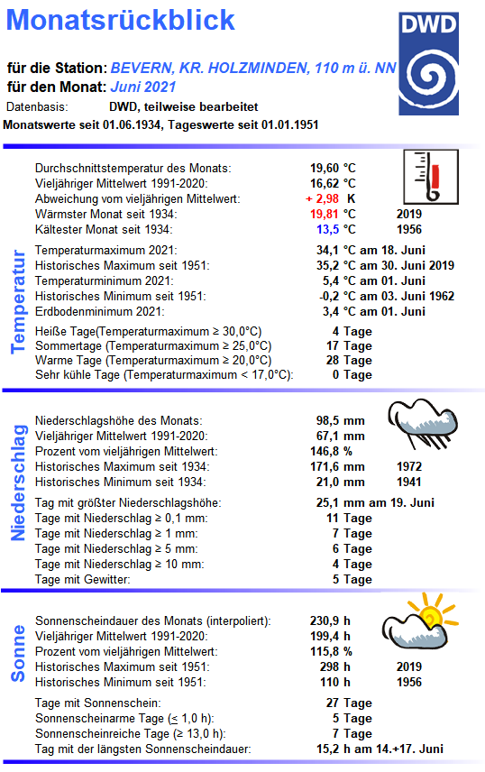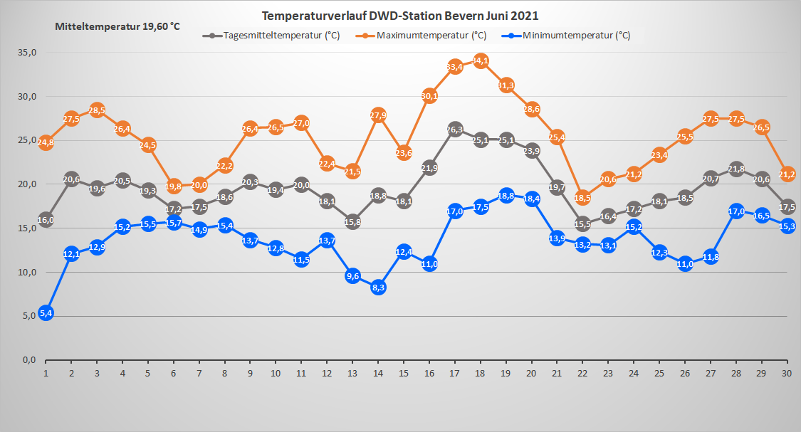Mit einer Monatstemperatur von 19,60 °C war der Juni 2021 an der DWD-Station in Bevern um fast 3,0 Kelvin wärmer als im Mittel der Jahre von 1991-2020. Nur vor zwei Jahren war es mit 19,81 °C noch wärmer, Platz drei belegt nunmehr der Juni aus dem „Jahrhundertsommer“ 2003. Besonders markant fällt der Unterschied zum vorausgegangenen kühlen Mai aus: Beträgt die durchschnittliche Differenz zwischen diesen beiden Monaten 3,1 K, lag sie in diesem Jahr bei 8,1 K – auch das ist Platz zwei seit Beobachtungsbeginn 1934 hinter dem Rekordhalter 2019. Viele hochsommerlich warme Tage, eine kurze Hitzewelle nach Monatsmitte sowie die völlige Abwesenheit kühler Phasen waren die Zutaten zu diesem sehr warmen Monat.