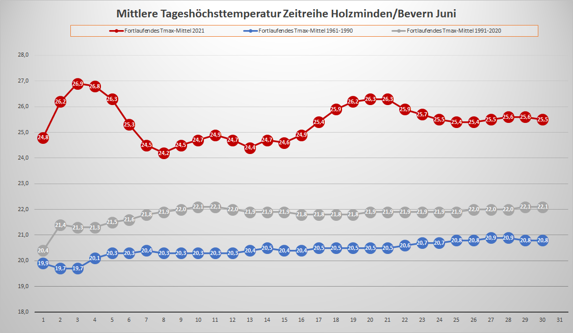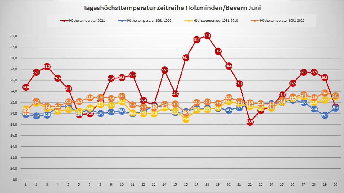 Auch an der Wetterstation im Kurgarten von Silberborn, einem Gemeinschaftsprojekt des internationalen Wetterdienstleisters DTN mit der Stadt Holzminden zur Beobachtung des Klimas im Hochsolling, fiel der Juni 2021 außergewöhnlich warm aus, hier betrug der Rückstand zum Rekord von 2019 nur 0,14 Kelvin. Mit einer Monatstemperatur von 17,81 °C war es um 3,5 K wärmer als im Mittel der Jahre 1991-2020, gegenüber der älteren Klimanorm von 1961-1990 betrug das Plus sogar 4,5 K.