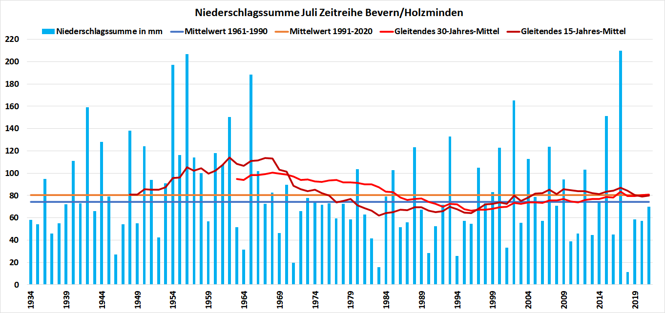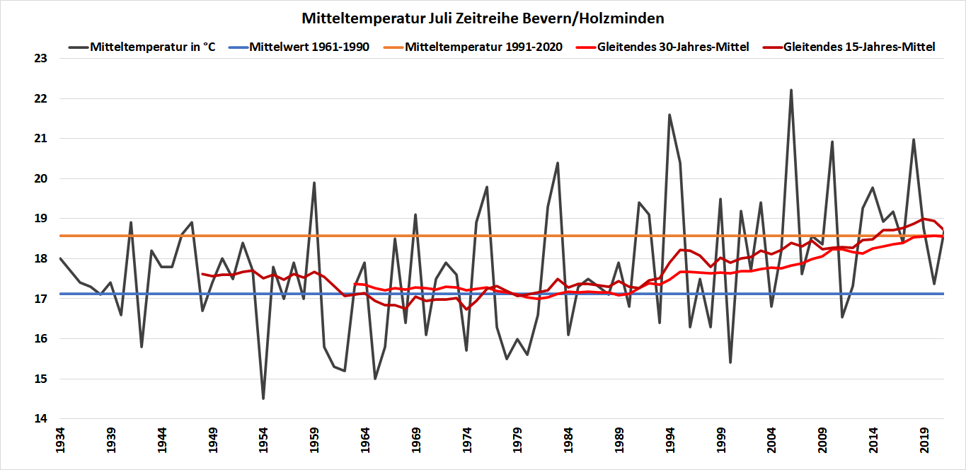 Wenn der Hochsommer mit Werten über 27 Grad im Wesertal schon so geizt, dann bleibt in den höher gelegenen Orten der Region kaum noch ein meteorologischer Sommertag übrig, wie ein Blick auf die Daten der Station in Silberborn zeigt, wo nur an zwei Tagen über 25 Grad gemessen wurden. An immerhin elf Tagen wurde hier die 20-Grad-Marke verfehlt, am kühlsten war auch im Hochsolling der Monatserste mit nur 13,0 °C Höchsttemperatur. Das Monatsmittel von 16,5 °C entsprach wie in Bevern fast genau dem jüngsten klimatologischen Durchschnitt (+0,1 K) und einem Plus von 1,6 K im Vergleich zur Periode 1961-1990. Der Temperaturverlauf an beiden Stationen zeigt auf, dass wie schon 2017 selbst ein sonnenscheinarmer und tiefdruckgeprägter Juli ein ganzes Stück wärmer abschneidet als vor 30 Jahren.