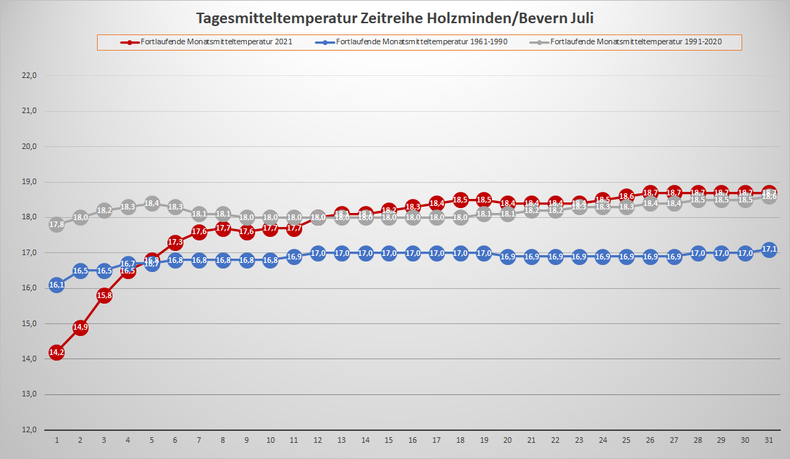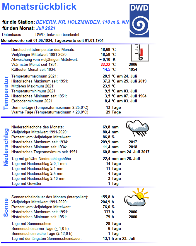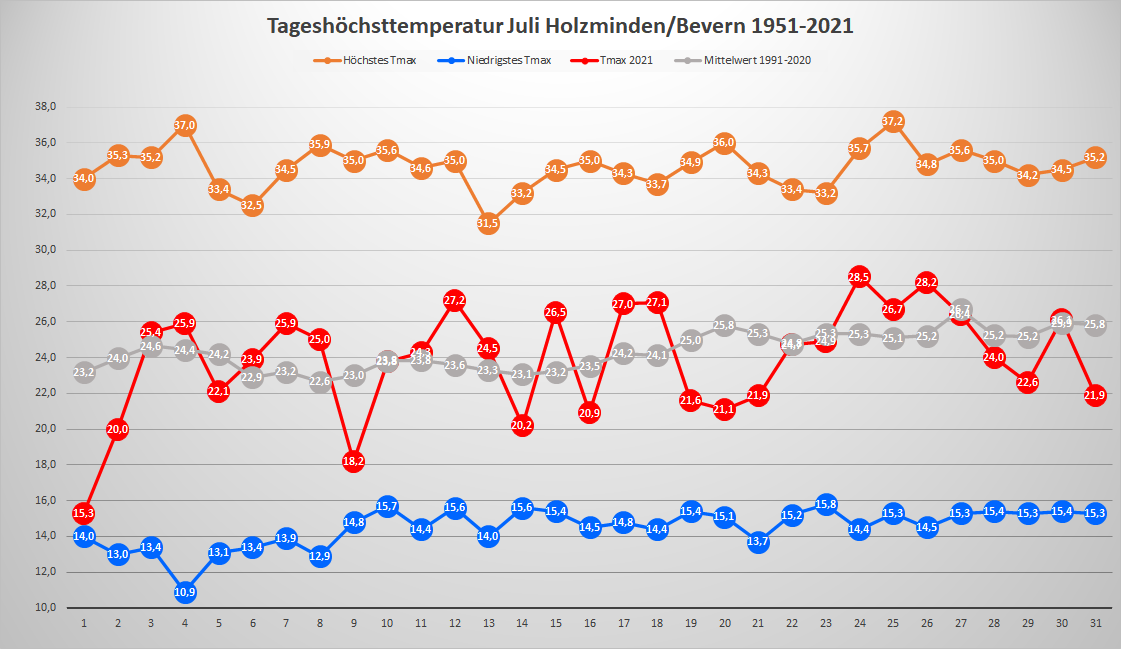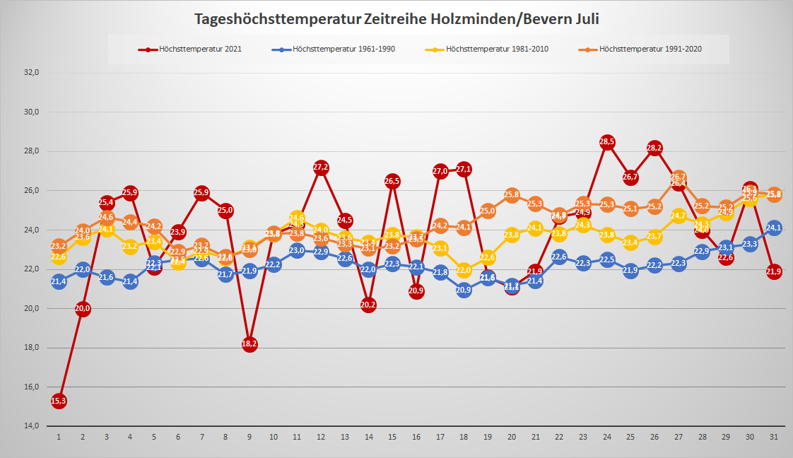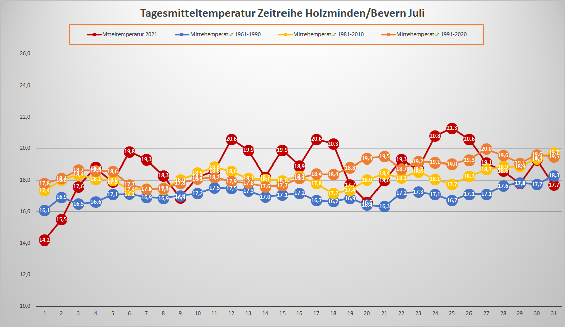 Mit einer Monatstemperatur von 18,68 °C landete der Juli 2021 an der DWD-Station in Bevern fast genau im Mittel der Jahre von 1991-2020. Gegenüber der älteren Klimareferenzperiode von 1961-1990 gab es ein Plus von knapp 1,6 Kelvin. An den meisten Tagen lagen die Höchstwerte im mäßig warmen bis warmen Bereich, an 27 Tagen innerhalb eines Korridors zwischen 20 und 27 Grad. Das Maximum von 28,5 °C war das niedrigste in einem Juli seit 2011, tiefer lag es zuletzt vor 21 Jahren, als im Juli 2000 nicht einmal ein meteorologischer Sommertag erreicht wurde. Wie schon im Juni gab es auf der kühlen Seite kaum etwas zu vermelden, nur an zwei Tagen blieb der Höchstwert unter der 20-Grad-Marke – am Monatsersten mit nur 15,3 °C allerdings so deutlich, dass damit ein neuer Minusrekord für einen 1. Juli in der Klimareihe Bevern/Holzminden aufgestellt wurde – bezogen auf den Zeitraum ab 1951, für den die entsprechenden Tageswerte vorliegen.