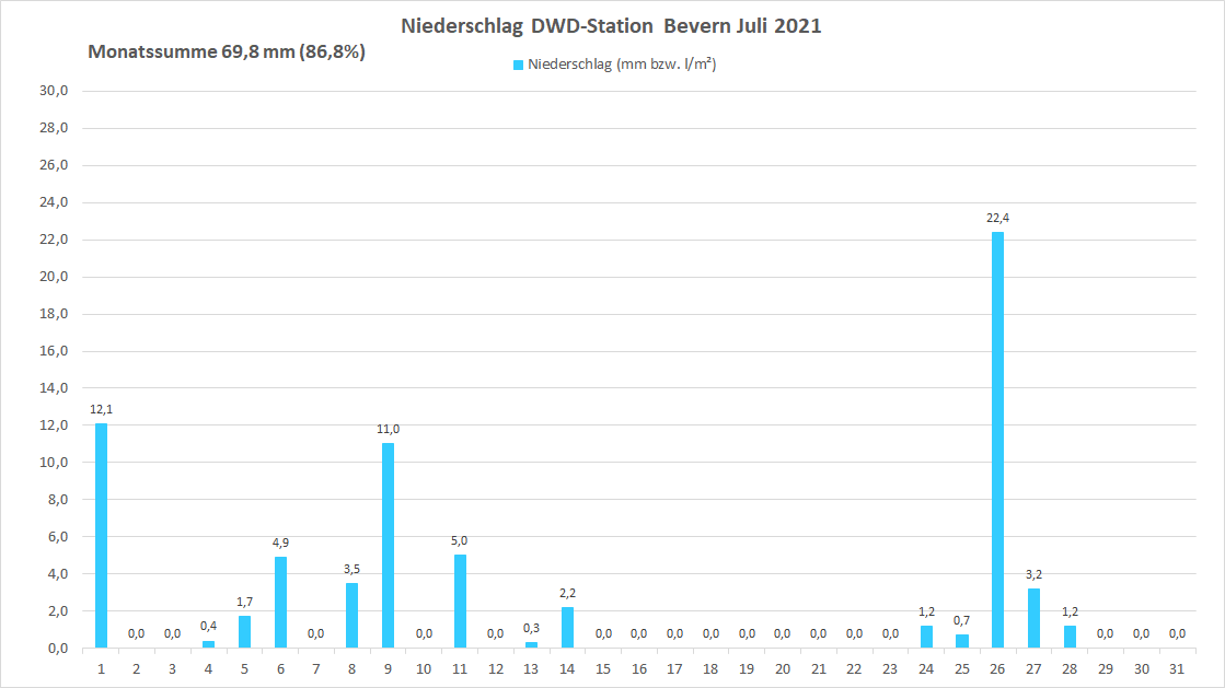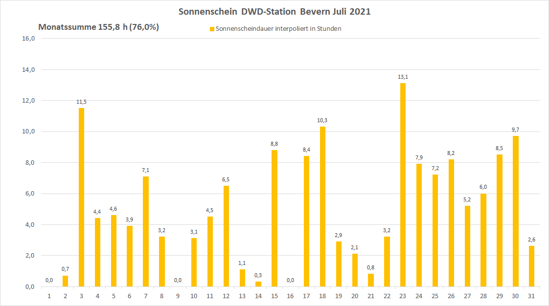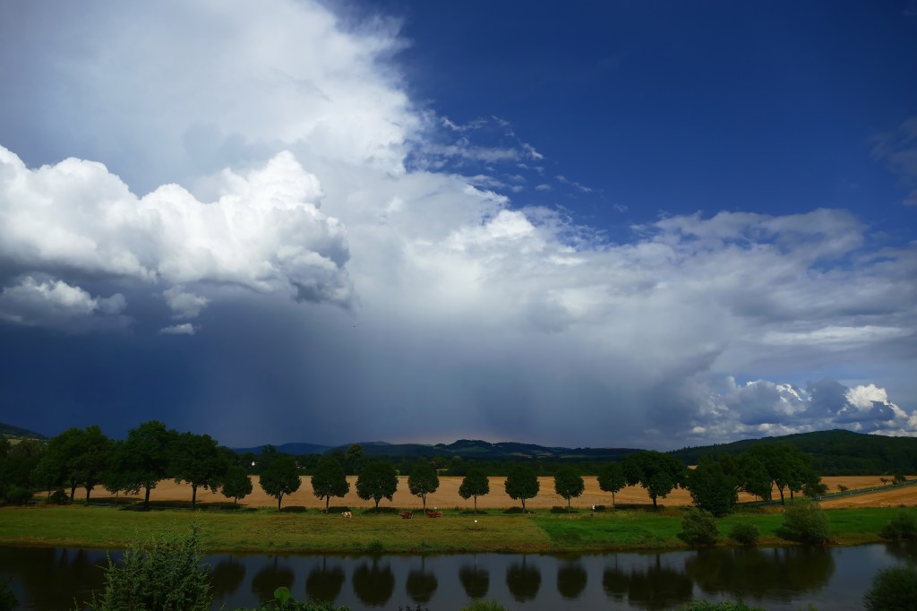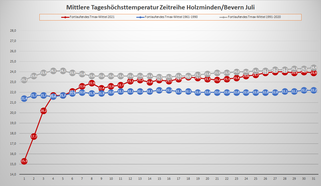Mit einer Monatstemperatur von 18,68 °C landete der Juli 2021 an der DWD-Station in Bevern fast genau im Mittel der Jahre von 1991-2020. Gegenüber der älteren Klimareferenzperiode von 1961-1990 gab es ein Plus von knapp 1,6 Kelvin. An den meisten Tagen lagen die Höchstwerte im mäßig warmen bis warmen Bereich, an 27 Tagen innerhalb eines Korridors zwischen 20 und 27 Grad. Das Maximum von 28,5 °C war das niedrigste in einem Juli seit 2011, tiefer lag es zuletzt vor 21 Jahren, als im Juli 2000 nicht einmal ein meteorologischer Sommertag erreicht wurde. Wie schon im Juni gab es auf der kühlen Seite kaum etwas zu vermelden, nur an zwei Tagen blieb der Höchstwert unter der 20-Grad-Marke – am Monatsersten mit nur 15,3 °C allerdings so deutlich, dass damit ein neuer Minusrekord für einen 1. Juli in der Klimareihe Bevern/Holzminden aufgestellt wurde – bezogen auf den Zeitraum ab 1951, für den die entsprechenden Tageswerte vorliegen.
