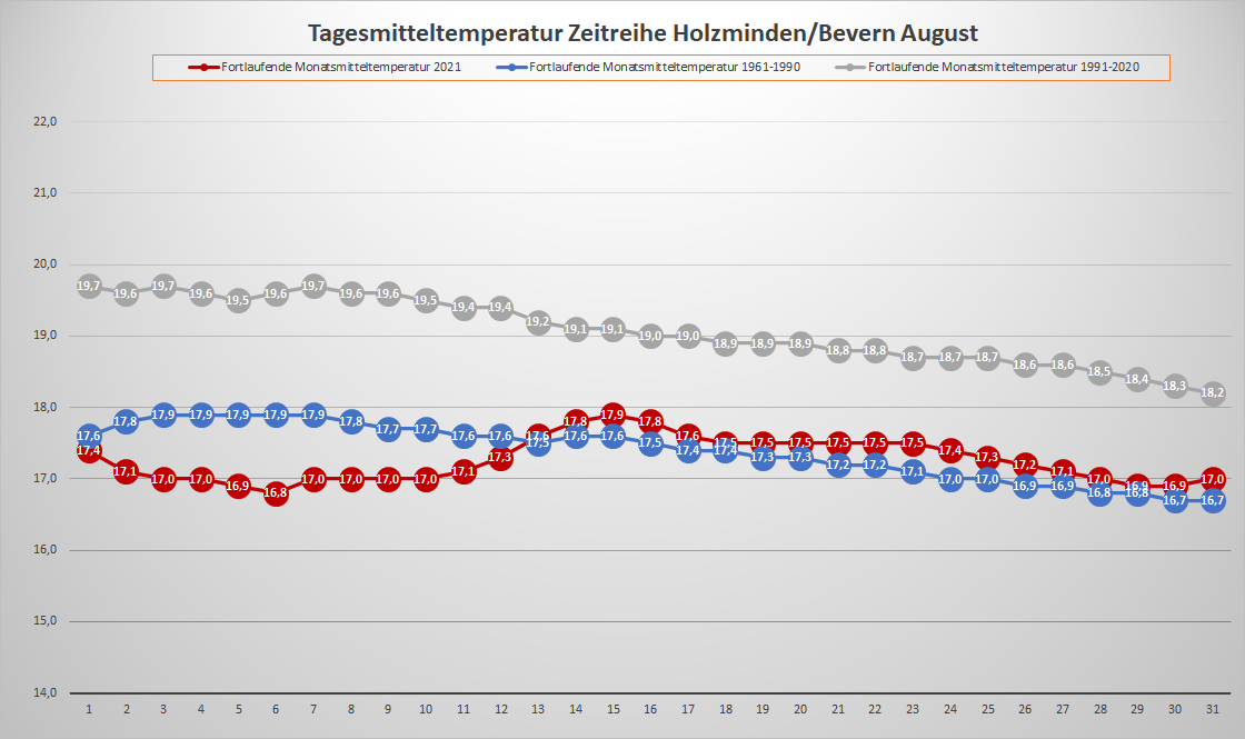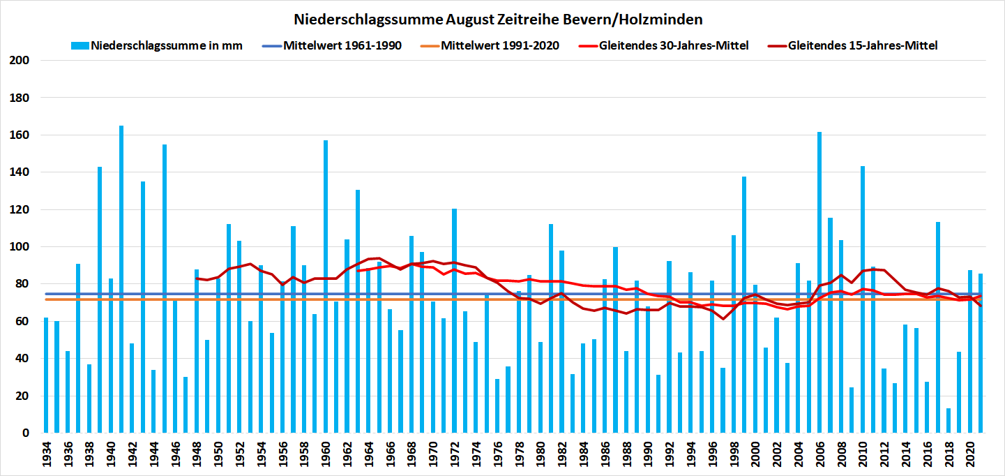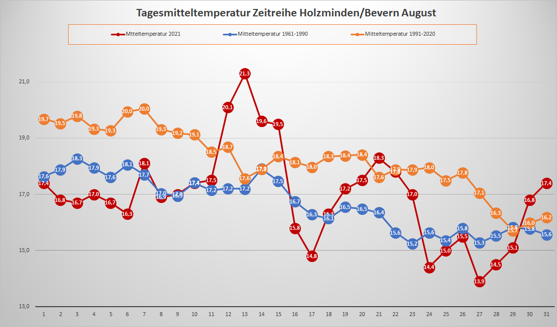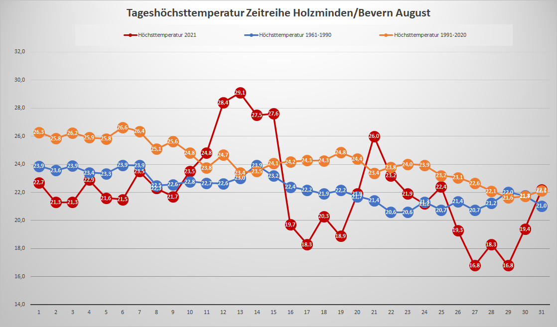 Die Hochsolling-Wetterstation in Silberborn liegt auf fast 430 m Höhe und entsprechend fallen die Sommerbrötchen dort kleiner aus. Sofern keine Inversionswetterlage herrscht, was in den Sommermonaten kaum einmal der Fall ist, beträgt die Differenz bei den Höchsttemperaturen zum Wesertal in der Regel rund drei Grad. Dies bestätigen auch die Augustwerte mit einem mittleren Tagesmaximum von 19,1 °C gegenüber Bevern mit 22,1 °C. Sommertage gab es in Silberborn nur zwei, dafür ging es gen Monatsende schon herbstlich zu mit Höchstwerten von unter 15 Grad. Die Monatsmitteltemperatur lag mit 14,65 °C um 1,4 K unter dem dortigen Klimawert der Jahre 1991-2020, während das 30 Jahre ältere Referenzmittel für langfristige Klimavergleiche von 14,7 °C fast auf den Punkt getroffen wurde.