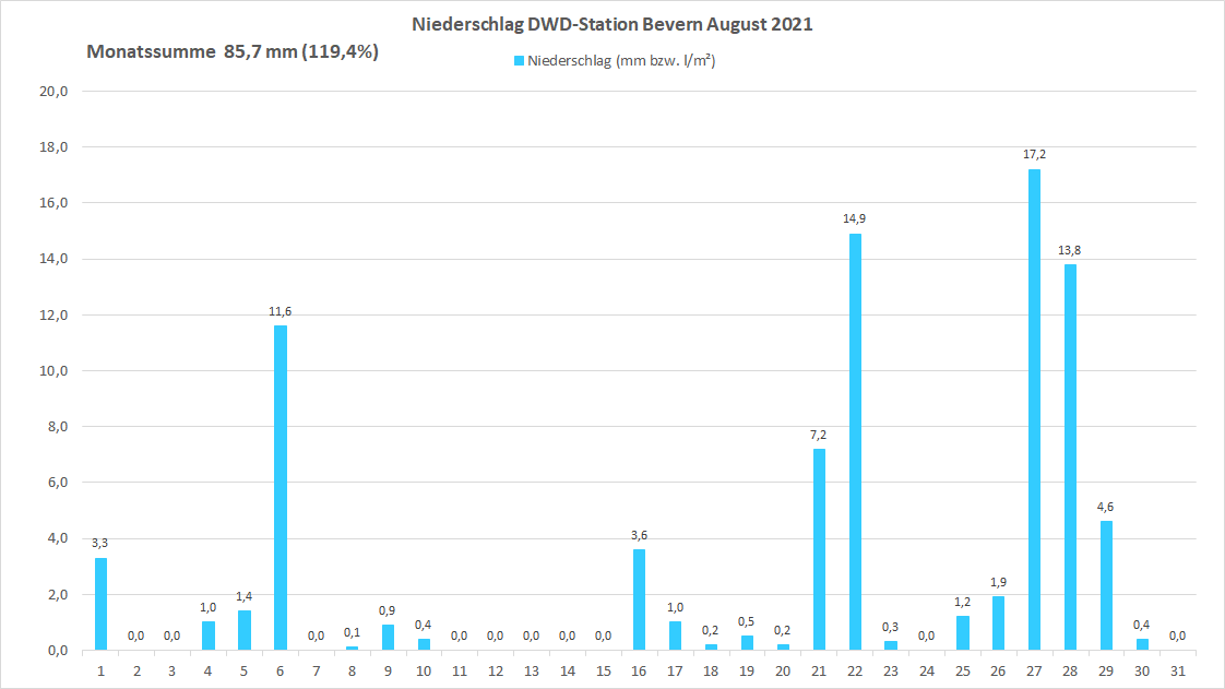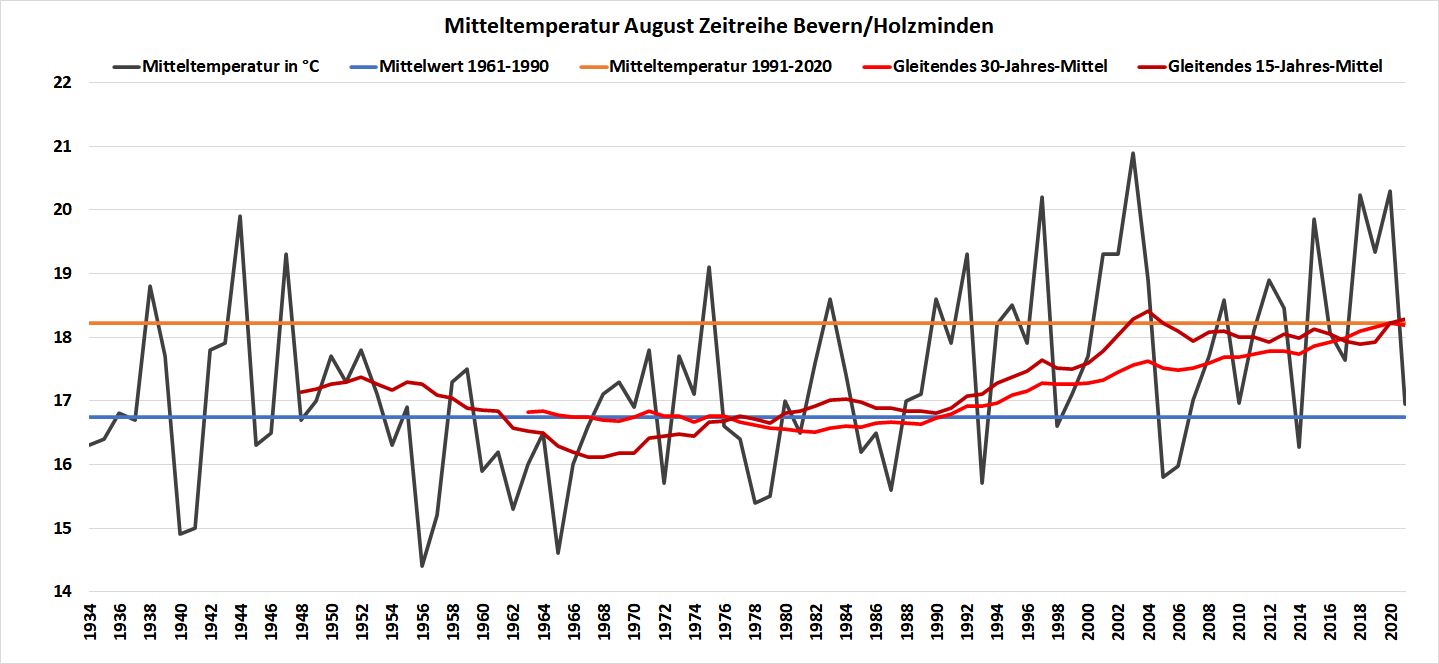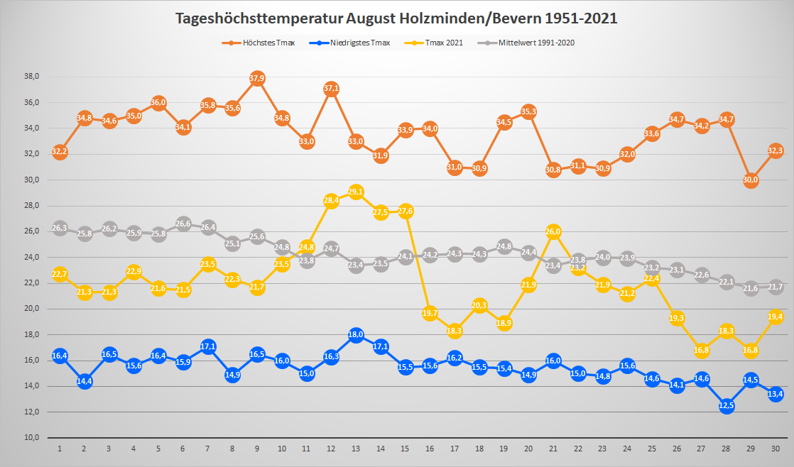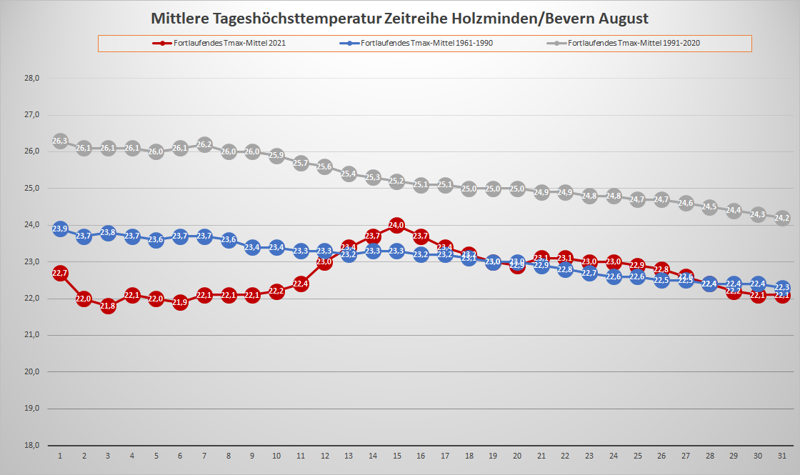 Die Hochsolling-Wetterstation in Silberborn liegt auf fast 430 m Höhe und entsprechend fallen die Sommerbrötchen dort kleiner aus. Sofern keine Inversionswetterlage herrscht, was in den Sommermonaten kaum einmal der Fall ist, beträgt die Differenz bei den Höchsttemperaturen zum Wesertal in der Regel rund drei Grad. Dies bestätigen auch die Augustwerte mit einem mittleren Tagesmaximum von 19,1 °C gegenüber Bevern mit 22,1 °C. Sommertage gab es in Silberborn nur zwei, dafür ging es gen Monatsende schon herbstlich zu mit Höchstwerten von unter 15 Grad. Die Monatsmitteltemperatur lag mit 14,65 °C um 1,4 K unter dem dortigen Klimawert der Jahre 1991-2020, während das 30 Jahre ältere Referenzmittel für langfristige Klimavergleiche von 14,7 °C fast auf den Punkt getroffen wurde.