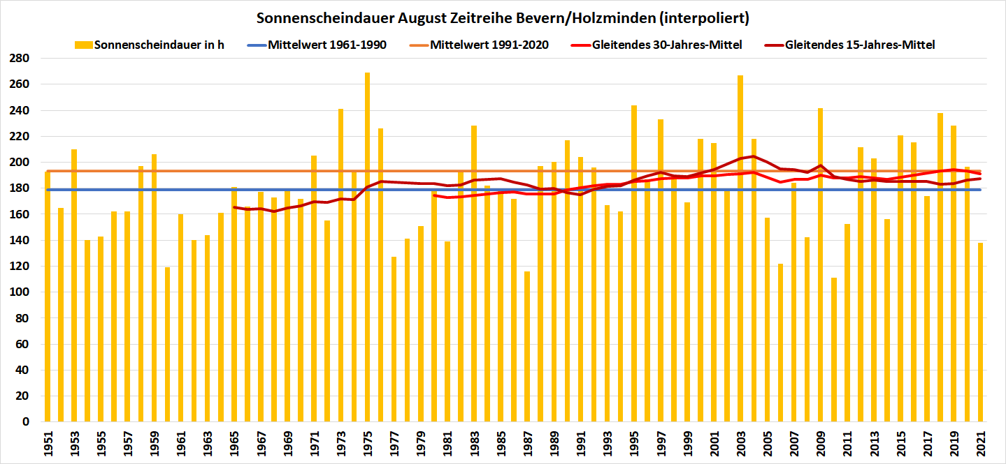 Eindeutig ist das Bild beim Sonnenschein: Mit lediglich 138 Stunden wurde nicht nur das Mittel der letzten 30 Jahre deutlich verfehlt (um fast 30%), der August 2021 zählt auch klar zu den trübsten Vertretern der lokalen Wetterhistorie seit 1951: Nur sieben Mal gab es in den letzten 70 Jahren noch weniger Sonnenschein in einem August, zuletzt 2010, als der Minusrekord von nur 111 Stunden aufgestellt wurde.