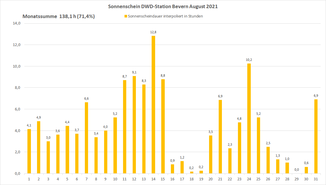 Beim Sonnenschein fiel das Defizit der Monate Juli und August deutlich größer aus als das Plus, das der Juni angesammelt hatte. Nach 92 Tagen betrug der Schätzwert für die Region, gewonnen aus fünf DWD-Stationen mit Sonnenscheinmessern in der Umgebung, rund 525 Stunden. Das ist ein Minus von 73 Stunden gegenüber dem Mittel der letzten 30 Jahre und der niedrigste Wert seit 2012. Der trübste Sommer stammt aus dem Jahr 1981, als mit Müh und Not die Marke von 400 Stunden knapp überschritten wurde, der Rekord immer noch aus dem „Sonnenjahr“ 1959, als ca. 753 Stunden erreicht wurden.
