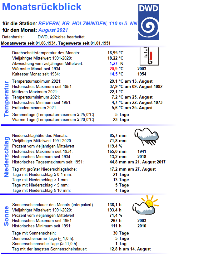 Mit einer Monatstemperatur von 16,95 °C war der August 2021 an der DWD-Station in Bevern um fast 1,3 K kühler als im Mittel der Jahre von 1991-2020. Gegenüber der älteren Klimareferenzperiode von 1961-1990 reicht das aber immer noch für ein kleines Plus von zwei Zehnteln. Sieht man einmal von den letzten Tagen des Monats ab, ergibt sich ein ähnliches Fazit wie im Juli: Kühle und sehr warme Tage gab es kaum, meist spielte sich das Niveau der Tageshöchstwerte im mäßig warmen Bereich etwas oberhalb der 20-Grad-Marke ab. In der ersten Dekade blieb der Korridor bei den Maxima mit Werten zwischen 21,3 und 23,5 °C äußerst schmal. Lediglich vor Monatsmitte stiegen die Werte vorübergehend für vier Tage deutlich über die 25-Grad-Marke an. Die Anzahl meteorologischer Sommertage blieb mit fünf klar unterdurch-schnittlich, die 30-Grad-Marke wurde wie im Juli gar nicht erreicht. Der letzte August ohne heißen Tag ist zwar erst vier Jahre her, auf der Suche nach dem letzten hitzefreien Juli-August-Paar wird man aber erst vor fast 30 Jahren im Sommer 1993 fündig.