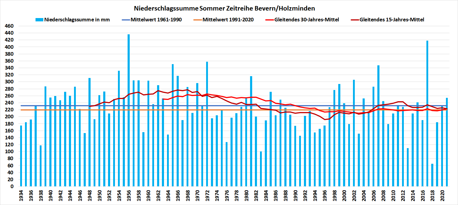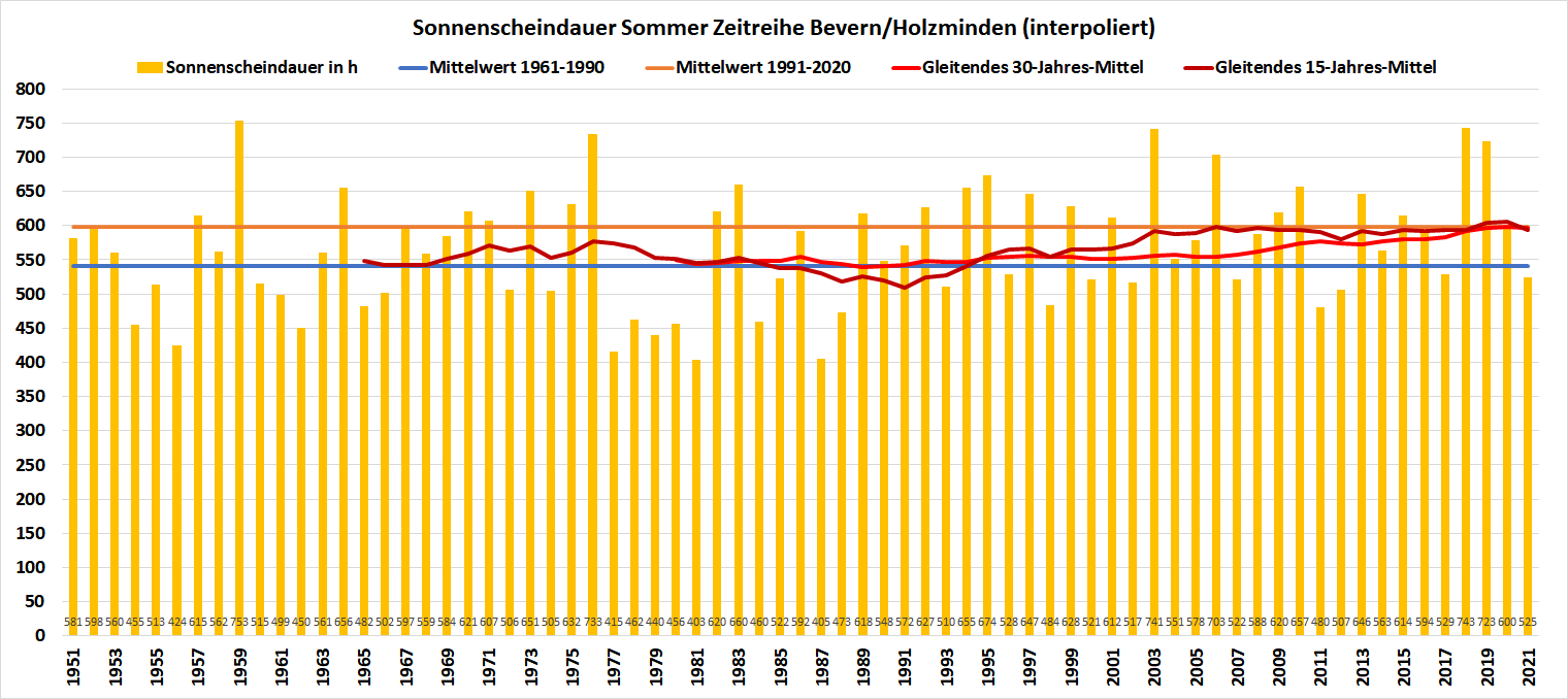 In der Sommerbilanz macht jeder Monat einen Anteil von einem Drittel aus und hier sorgt dann der Juni mit seinem markanten Temperaturüberschuss dafür, dass der Sommer 2021 unter dem Strich an der DWD-Station in Bevern mit 18,4 °C überdurchschnittlich ausfiel – eher leicht gegenüber dem aktuellen Klimamittel der letzten 30 Jahre von 17,8 °C, deutlich gegenüber der älteren Norm der Periode 1961-1990 von 16,5 °C. Zum Vergleich: Der damals als Hitzesommer eingestufte Sommer 1983 war mit 18,5 °C nur ein Zehntelgrad wärmer als der aktuelle. An solchen Zahlen lässt sich das Fortschreiten der Erwärmung in den letzten Jahren gut ablesen. Hitze blieb gleichwohl in diesem Sommer die Ausnahme und beschränkte sich auf vier Tage im Juni am Standort Bevern, in Silberborn waren es zwei, beides deutlich weniger als zuletzt und auch weniger als im langjährigen Mittel, das in Bevern bei fast zehn Tagen und in Silberborn bei rund vier Tagen liegt. Die Anzahl der Sommertage mit mindestens 25 Grad Höchsttemperatur lag in Bevern mit 35 im Schnitt der letzten 30 Jahre, in Silberborn wurde dieser mit elf von ca. 19 allerdings klar verfehlt. Die dortige Sommertemperatur von 16,3 °C unterscheidet sich hingegen bezogen auf das kühlere Klima vor Ort kaum von der in Bevern: An der Hochsollingstation lag der Sommer rund 0,7 Grad über dem Mittel der Jahre 1991-2020 und glatt zwei Grad über der älteren Norm von 1961-1990.