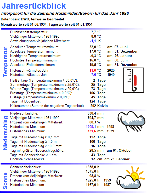 Der Juli fiel selbst für damalige Verhältnisse mit nur 16,3 °C im Wesertal und nicht einmal 14 °C im Hochsolling ungewöhnlich kühl aus, während der August durchaus seine sommerlichen Phasen hatte und zum mit Abstand wärmsten Monat des Jahres avancierte. Den Gesamtsommer hievte er mit 16,6 bzw. 14,3 °C sogar noch auf das Niveau des Klimamittels 1961-1990. Bis heute blieben dennoch nur drei weitere Sommer (1998, 2000 und 2005) ähnlich niedrig temperiert, kühler war seither keiner mehr. Zum Vergleich: Der Durchschnittswert der letzten 15 Jahre ist auf 18,1 °C am heutigen DWD-Standort in Bevern und 15,9 °C in Silberborn angestiegen, und die heißesten Sommer 2003 und 2018 waren jeweils über drei Grad wärmer als 1996. Auch die geringe Anzahl der heißen Tage (2 bzw. 0) sowie Sommertage (20 bzw. 9) wurde seither nicht mehr unterboten.