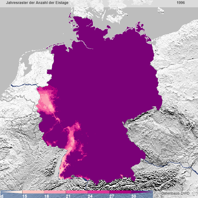 Doch nicht nur bei der Temperatur landete das Jahr 1996 weit unten, auch bei Niederschlag und Sonnenschein hielt es sich stark zurück. Trockentrübkalt lautet daher das Fazit, wenn man es in einem Wort treffen muss. Mit 638 mm wurde der durchschnittliche Jahresniederschlag um fast 160 mm bzw. 20% verfehlt, die Sonne zeigte sich nur ca. 1.358 Stunden lang, was damals allerdings noch recht normal war für die Region angesichts eines Klimamittels 1961-1990 von nur 1.375 Stunden (das allerdings auf recht dünner Datenbasis steht) und leider auch heute noch unterboten werden kann, wie das vergangene Jahr 2021 und zuvor 2017 erst wieder zeigten. Dennoch hat mit der Erwärmung auch ein Anstieg der mittleren Sonnenscheindauer in einer der trübsten Regionen des Landes auf immerhin fast 1.520 Stunden im Jahr stattgefunden in der Bezugsperiode 1991-2020.