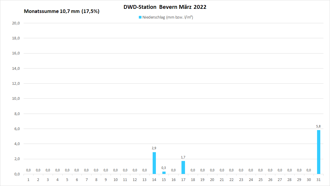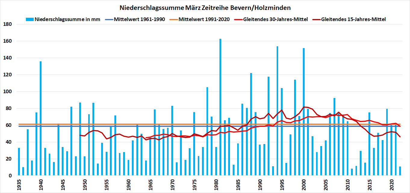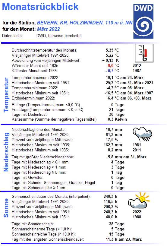 Erst durch diese sehr späten Tropfen und Flocken wurde quasi in den letzten Stunden des März ein neuer Trockenheitsrekord verhindert. Der 31. war erst der vierte Niederschlagstag des Monats und die zur Monatsmitte gefallenen Mengen waren mit wenigen Millimetern äußerst gering geblieben. Am Ende war es an der Station in Bevern mit 10,7 mm nach 2011 (8,2) und 1936 (10,0) der dritttrockenste März seit Aufzeichnungsbeginn. Vom 30-Jahres-Mittel wurden nicht einmal 18% erreicht. Auch im Hochsolling blieb es mit 17,2 mm in Silberborn außergewöhnlich trocken, dort finden sich (Messbeginn 1937 in Torfhaus) nur 1984 und 2011 noch geringere Niederschlagsmengen im März. Das dortige Klimamittel von 87 mm wurde fast genauso deutlich verfehlt (19,8%). Auch die weiteren Messgefäße im Umkreis brachten kaum Nass hervor: Hellental meldete 17,1 mm, Lüchtringen 11,4, Polle 10,8, Amelith 9,4, Vorwohle 8,3 und Ottenstein 8,0 mm. Schlusslicht war Hehlen mit 7,6 mm.