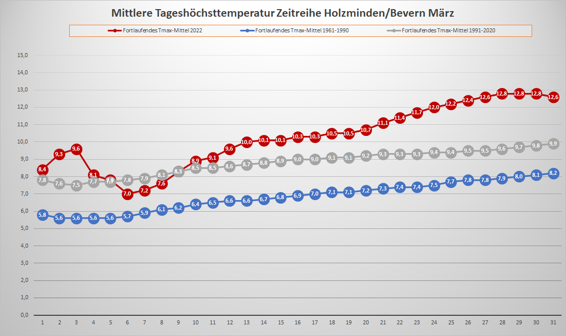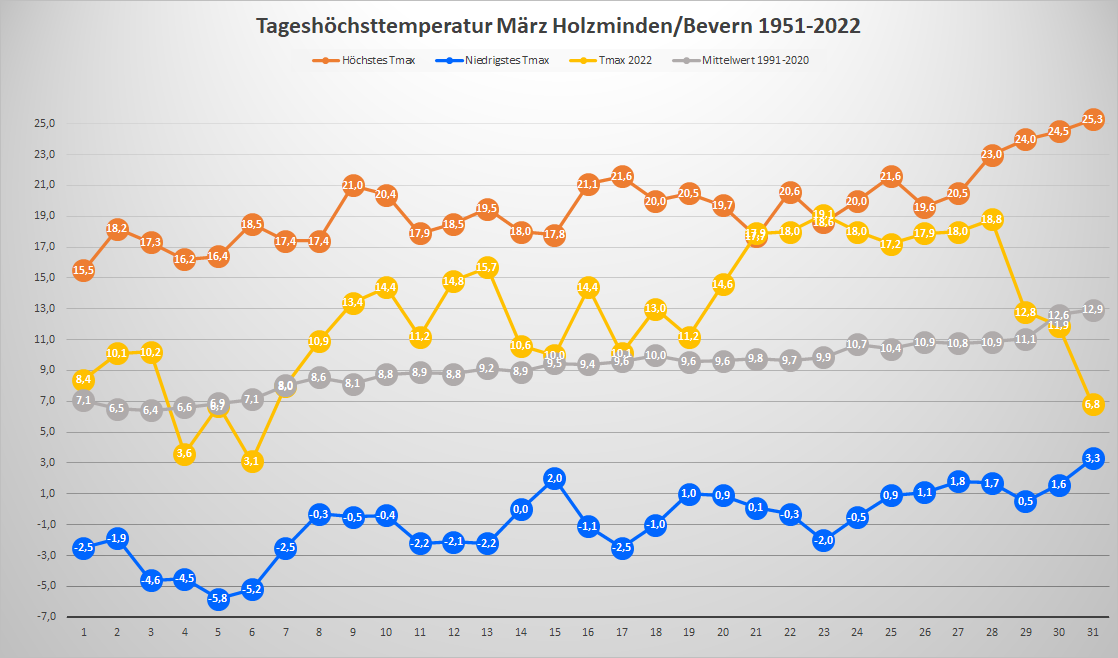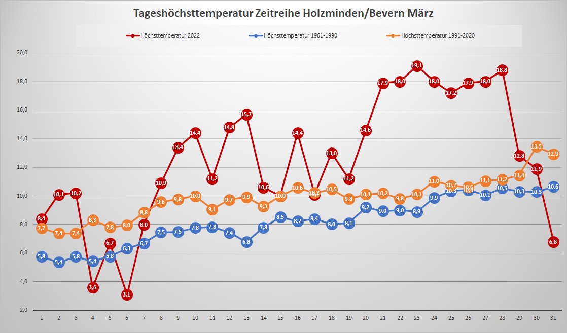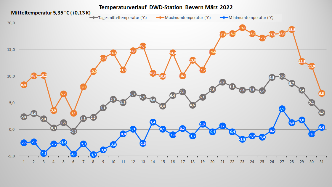 Mit einer Mitteltemperatur von 5,35 °C erzielte der März 2022 an der DWD-Station in Bevern ein zartes Plus von 0,1 Kelvin gegenüber seinem langjährigen Mittelwert von 1991-2020. Im Vergleich zur älteren Klimareferenz der Periode 1961-1990 betrug die positive Abweichung 1,3 K. Deutlicher wird das Plus auch zum neuen Klimamittel, wenn man die Tageshöchstwerte separat betrachtet: Hier lag der Durchschnitt in diesem März bei 12,6 °C und damit 2,7 K über dem aktuellen 30-Jahresmittel – ein Resultat der vielen gering bewölkten oder sogar wolkenlosen Tage, die mit Frost in der Nacht und am Morgen starteten und mit der ungehinderten Sonneneinstrahlung steile Temperaturanstiege aufwiesen. Der Höchstwert wurde am 23. mit 19,1 °C gemessen, für den ersten „Zwanziger“ reichte es also noch nicht, aber immerhin für eine ungewöhnlich stabil temperierte frühlingshafte Phase in der dritten Dekade mit acht Tagen in Folge mit Höchstwerten um 18 Grad.