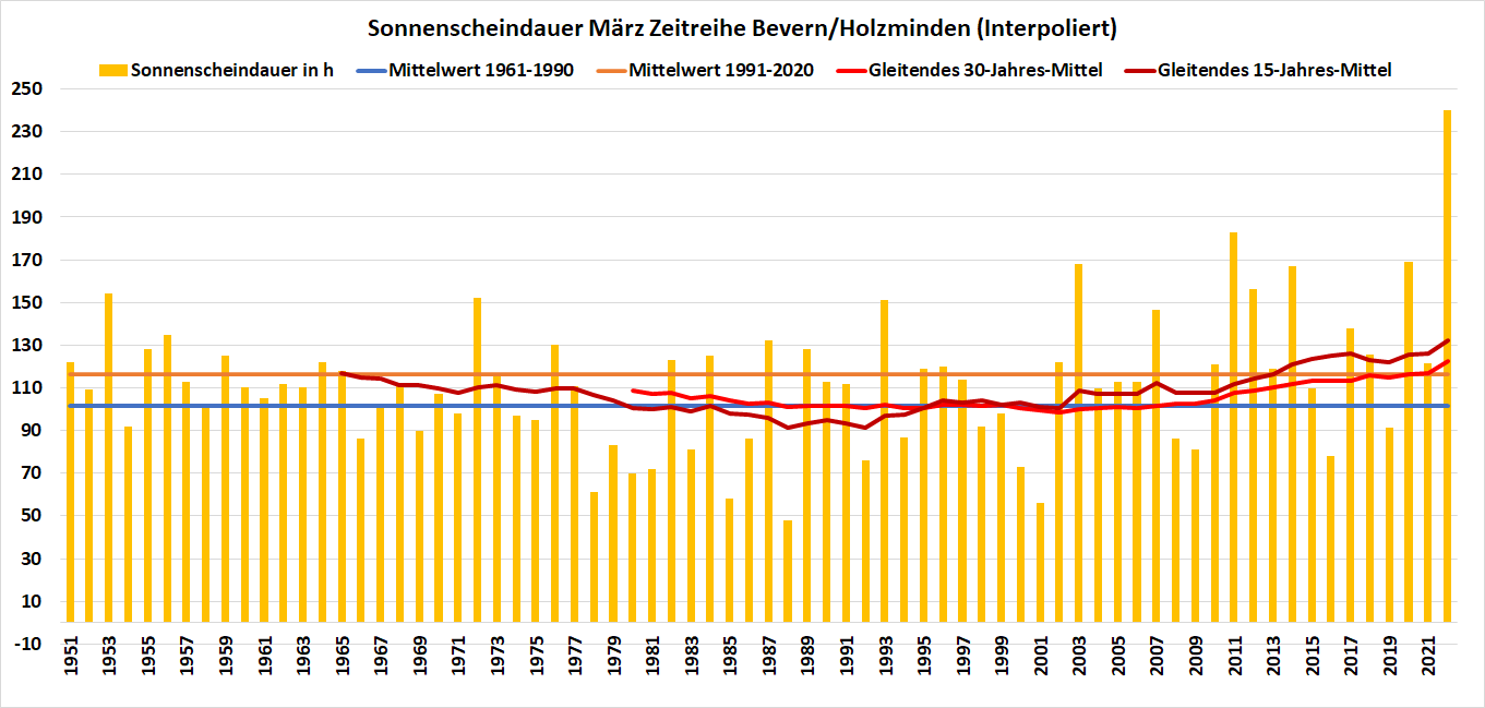 Und noch etwas Interessantes fördert der Blick in die Historie zu Tage: In den letzten 30 Jahren – das ist bereits der sonnigste Zeitraum seit Messbeginn – wurde nur in der Hälfte der Jahre ein höherer Wert als die im März erzielten 240 Stunden gemessen. Statistisch betrachtet liegt der Monat mit dem meisten Sonnenschein des Jahres mit einer Wahrscheinlichkeit von 50% also bereits hinter uns…