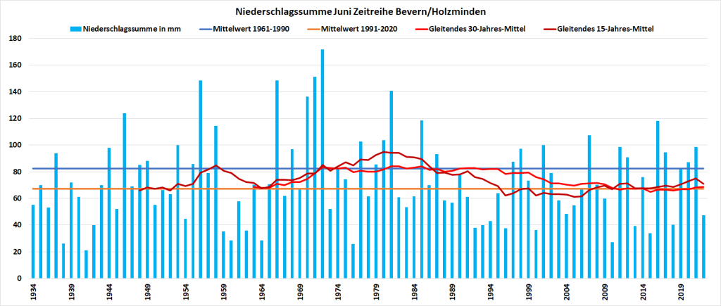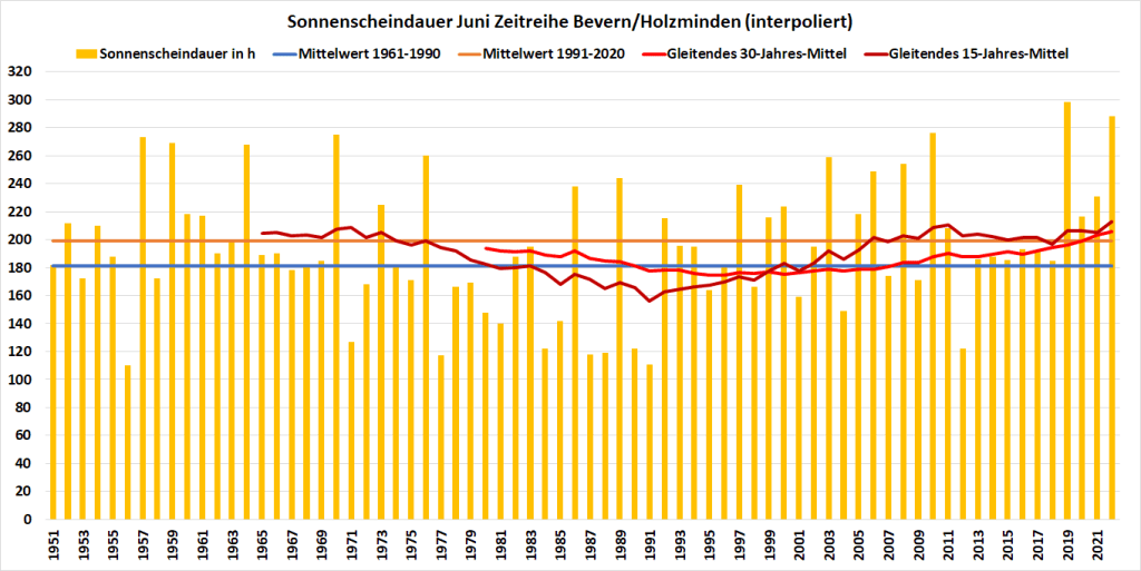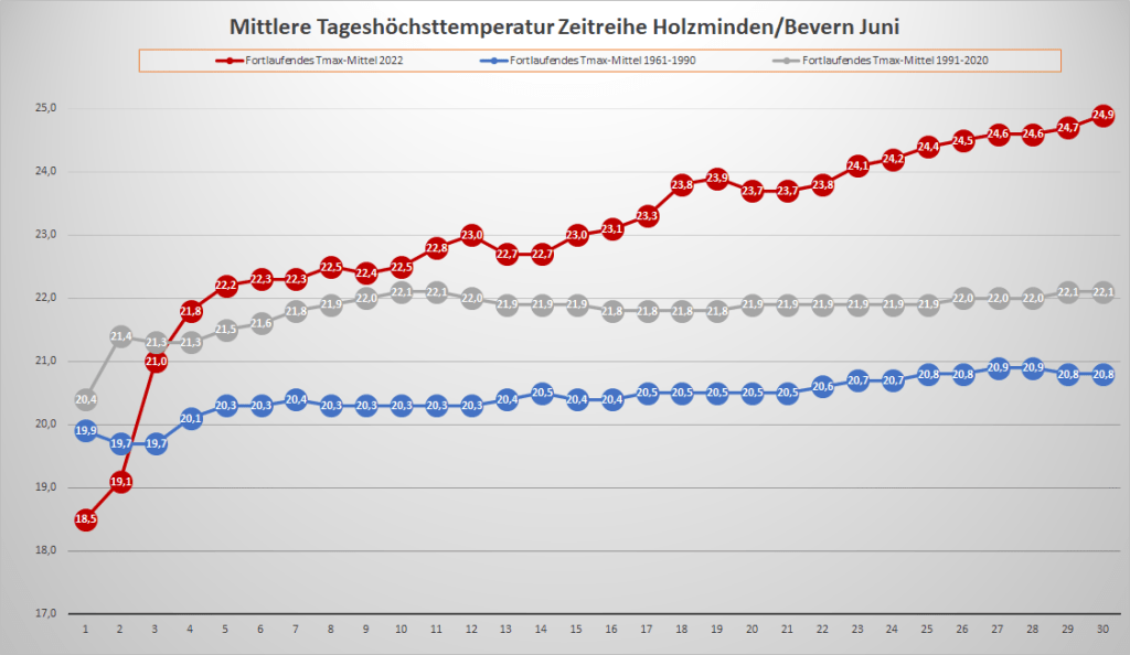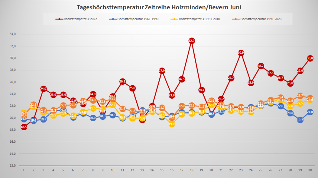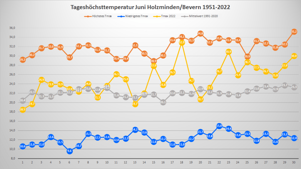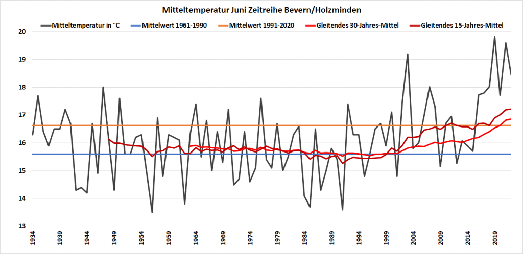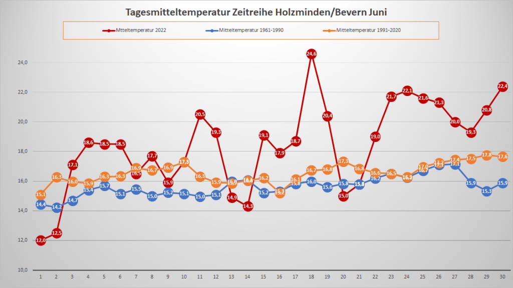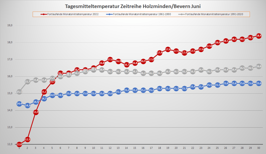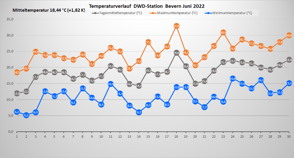 Mit einer Monatstemperatur von 18,44 °C war der Juni 2022 an der DWD-Klimastation in Bevern um 1,8 K wärmer als im Mittel der Jahre 1991-2020. Gegenüber der älteren Klimanorm von 1961-1990 betrug das Plus sogar 2,8 K. In der Zeitreihe Bevern/Holzminden ab 1934 war es der viertwärmste Juni hinter 2019, 2021 und 2003 – damit belegen nun drei der letzten vier Jahre die vordersten Plätze. Besonders auffällig ist der Anstieg der Junitemperaturen der jüngsten Vergangenheit: Der Schnitt der Jahre 2016-2021 hatte mit 18,44 °C ein Niveau sogar knapp oberhalb des Julimittels der Periode 1991-2020 erreicht – und wurde in diesem Jahr aufs Hundertstel genau getroffen.