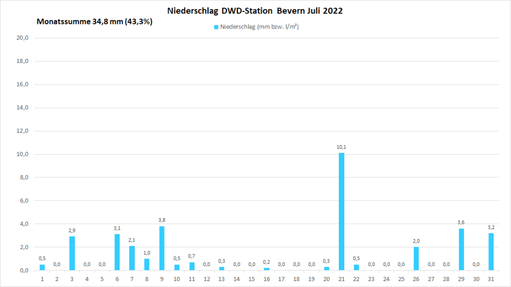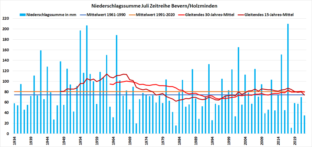 Deren Juliwerte lauteten (in Klammern die Klimawerte 1991-2020): Bevern 34,8 mm (80,4), Lüchtringen 43,5 mm (78,2), Polle 38,8 mm (75,4 – dieser vom DWD angegebene Wert scheint angesichts der Höhenlage von 270 m zu niedrig), Hehlen 47,2 mm (80,0), Vorwohle 43,2 mm (88,4), Hellental 46,1 mm (78,0 – auch diese DWD-Angabe ist unplausibel niedrig) und Amelith 52,0 mm (91,5). Aus Ottenstein fehlen erneut einige Tageswerte, andere wurden vom DWD nachträglich mit Schätzwerten gefüllt, so dass leider keine belastbare Monatssumme vorliegt. Klar zu trocken war es aber auch im Nordwesten des Kreises auf jeden Fall.
