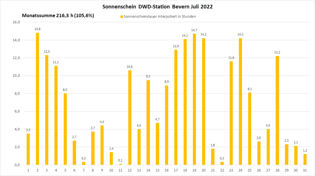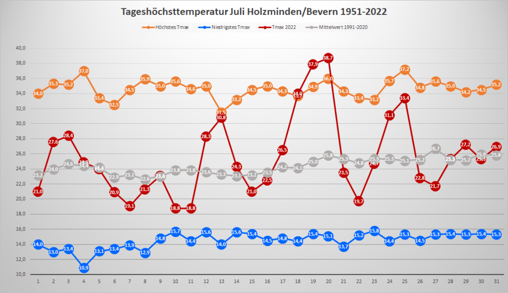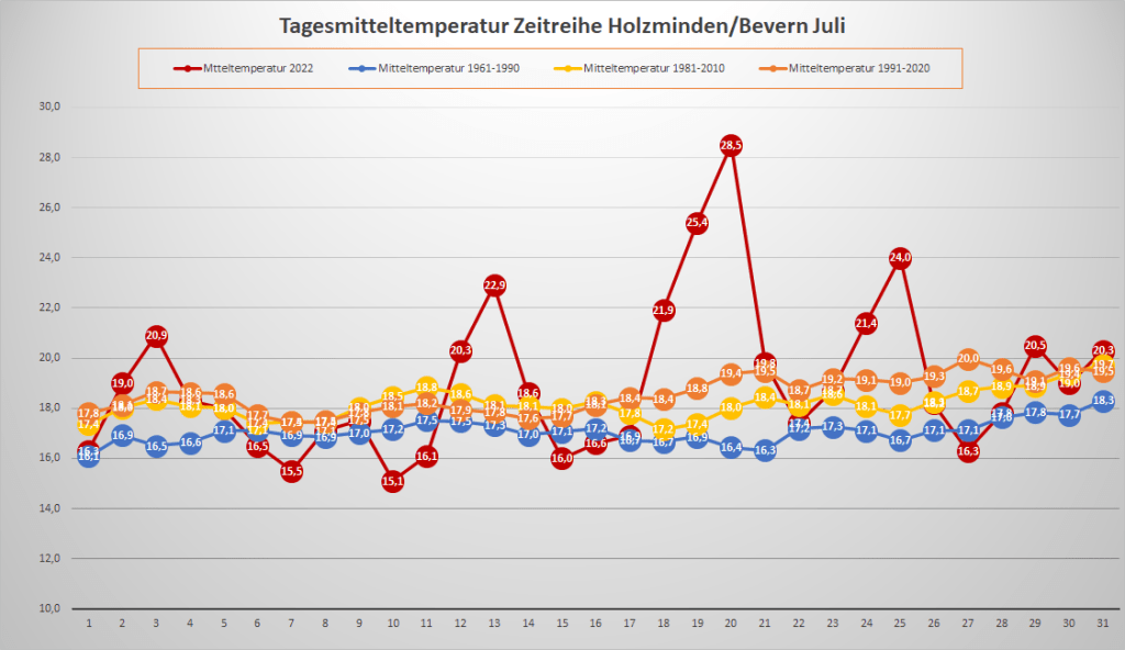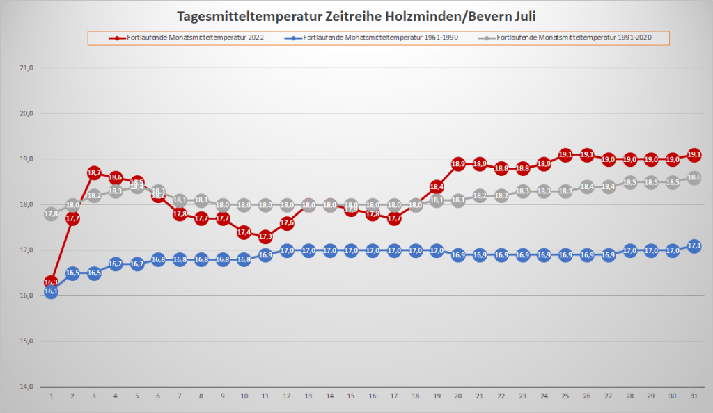 Mit einer Monatstemperatur von 19,06 °C war der Juli 2022 an der DWD-Klimastation in Bevern um knapp 0,5 K wärmer als im Mittel der Jahre 1991-2020. Gegenüber der älteren Klimanorm von 1961-1990 betrug das Plus deutliche 1,9 K. Neben den beiden Rekordtagen wurde noch an vier weiteren Tagen die 30-Grad-Marke überschritten, das Kriterium einer Hitzewelle erfüllte aber nur der Zeitraum vom 18.-20. Juli. Ansonsten war es mal hochsommerlich und mal mäßig warm, wirklich kühle Tage blieben wie schon im Juni Fehlanzeige: Nur an vier Tagen wurde die 20-Grad-Marke verfehlt und das auch nur recht knapp mit Höchstwerten zwischen 18,8 und 19,7 °C. Deutlich frischer kam so manche Nacht daher, immerhin fünfmal gingen die Werte in den einstelligen Bereich zurück. Einer der Gründe dafür war die häufig trockene Luft in der bodennahen Schicht, die auch dazu führte, dass die Rekordhitze als nicht so belastend wahrgenommen wurde wie die sehr feuchte und damit schwüle Hitzewelle im August 2020. Am Nachmittag des 19. fiel die relative Feuchte sogar auf rekordverdächtig niedrige 13,9% in Bevern, am 20. lag der tiefste Wert bei 15,7%.