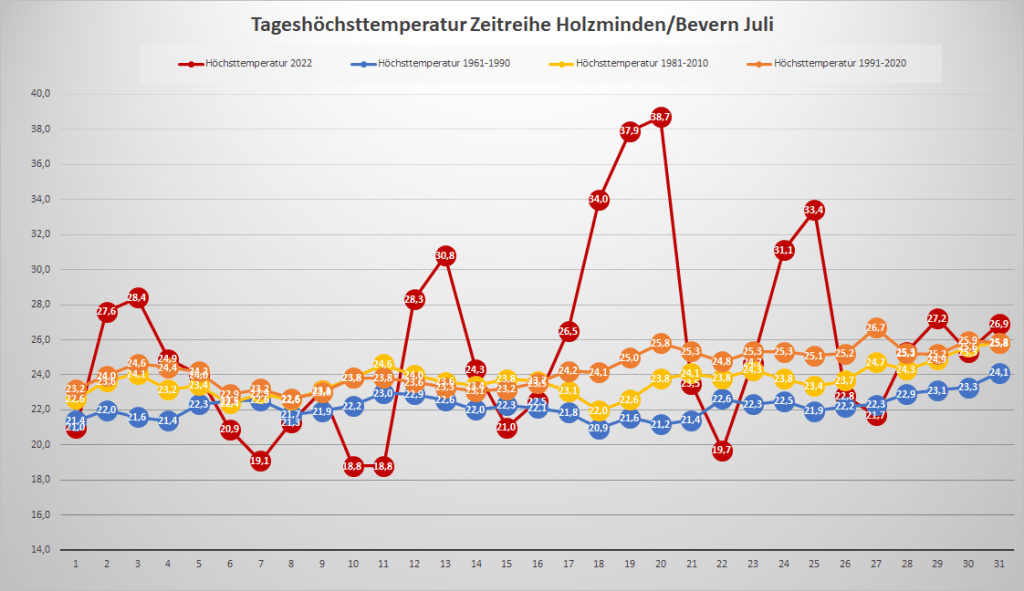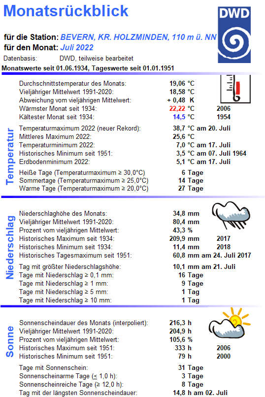 „36 Grad und es wird noch heißer“ – dieser Song mag so manchem Bewohner der Region beim Blick auf das Thermometer am Ende der zweiten Julidekade in den Sinn gekommen sein. Und es wurde in der Tat noch ein ganzes Stück heißer mit neuen Allzeitrekorden für den Landkreis: Auf 37,9 und schließlich 38,7 °C steigerte sich die Hitze am 19. und 20.07. an der DWD-Station in Bevern. Auch in Silberborn wurde mit dem erstmaligen Überschreiten der 36-Grad-Marke ein neuer Rekord aufgestellt. Sieht man allerdings von diesem kurzen, sehr intensiven Heißluftvorstoß bis weit in den Norden mit dem Knacken der 40-Grad-Marke selbst in Hamburg an der Station Neuwiedenthal einmal ab, verlief der Juli 2022 in der Region bei Temperatur und Sonnenschein recht unauffällig und nur leicht über den Durchschnittswerten der letzten 30 Jahre. Sorgen bereiteten dagegen die erneut viel zu geringen Niederschläge: seit März sind mit Ausnahme des Aprils alle Monate mehr oder weniger deutlich zu trocken ausgefallen. Und zumindest in der ersten Augusthälfte sieht es derzeit leider auch nicht nach einer durchgreifenden Änderung hin zu mehr Regenfällen aus.