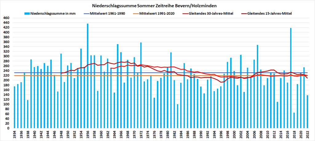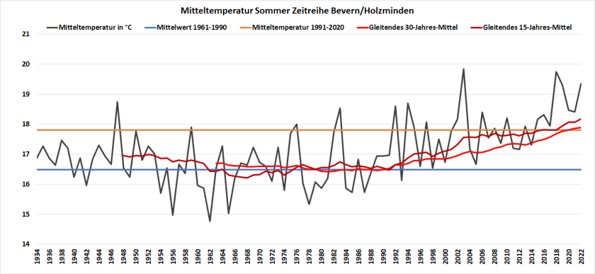 Mit einer Temperatur von 19,35 °C war der Sommer 2022 an der DWD-Klimastation in Bevern um rund 1,6 K wärmer als im aktuellen Mittel der Jahre 1991-2020 und lag sogar fast 2,9 K über der Referenz von 1961-1990. Nur 2003 und 2018 war es mit 19,8 bzw. 19,7 °C noch wärmer, der bisher drittwärmste Sommer aus dem Jahr 2019 wurde hingegen knapp überflügelt. 2003 war auch das Jahr, in dem die 19-Grad-Marke bei der Sommertemperatur erstmals überschritten wurde – nun war es bereits das dritte Mal seit 2018 und selbst die Durchschnittstemperatur der letzten fünf Sommer ist auf über 19 Grad angestiegen.