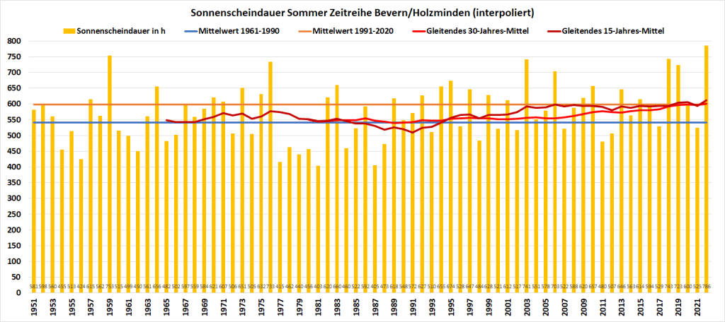 Wo wenige Wolken mit sehr wenig Regen unterwegs sind, da hat die Sonne oft freie Bahn – und so überrascht es nicht, dass nicht nur der August, sondern auch der gesamte Sommer einen neuen Rekord bei der Sonnenscheindauer aufstellte. Mit rund 785 Stunden wurde die alte Bestmarke aus dem Jahr 1959 (753 h) deutlich übertroffen. Es gilt aber auch hier zu beachten, dass Sonnenschein erst seit 1951 flächendeckend erfasst wird. Der Sommer 1947 könnte anhand der vorhandenen Daten aus Göttingen tatsächlich noch ein paar Stunden mehr auf die Waage gebracht haben. Aber wie auch immer: Solche Mengen sind womöglich auch Sonnenscheinliebhabern zu viel und vielleicht mag der eine oder andere sich für 2023 in Anlehnung an Rudi Carrell einen Sommer ohne Sonnenschein von Juni bis September wünschen – und dafür so nass und so sibirisch wie vor 50 Jahren…