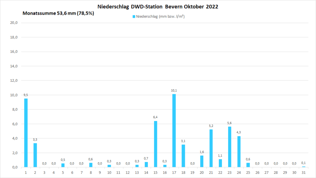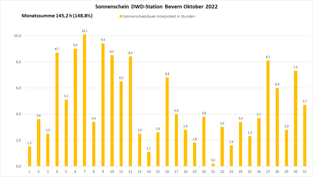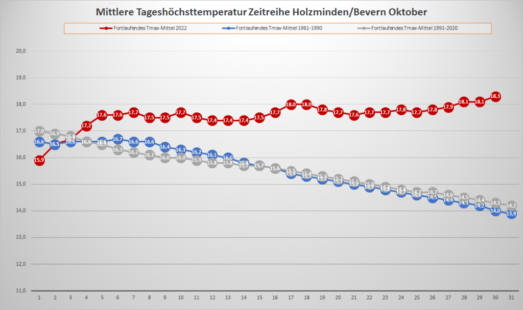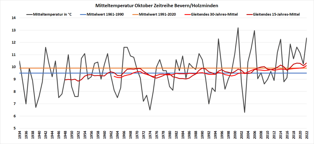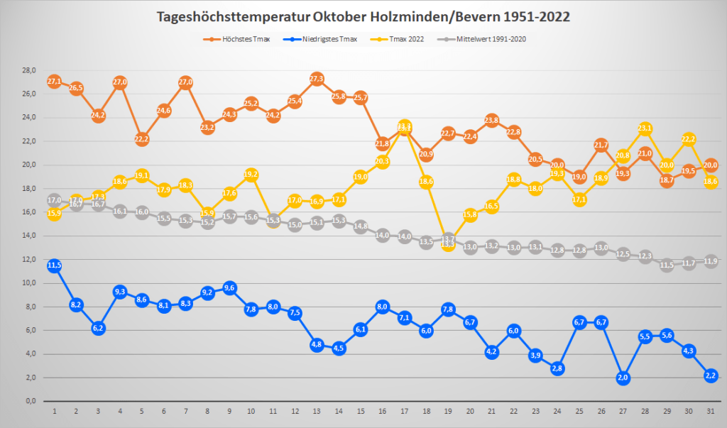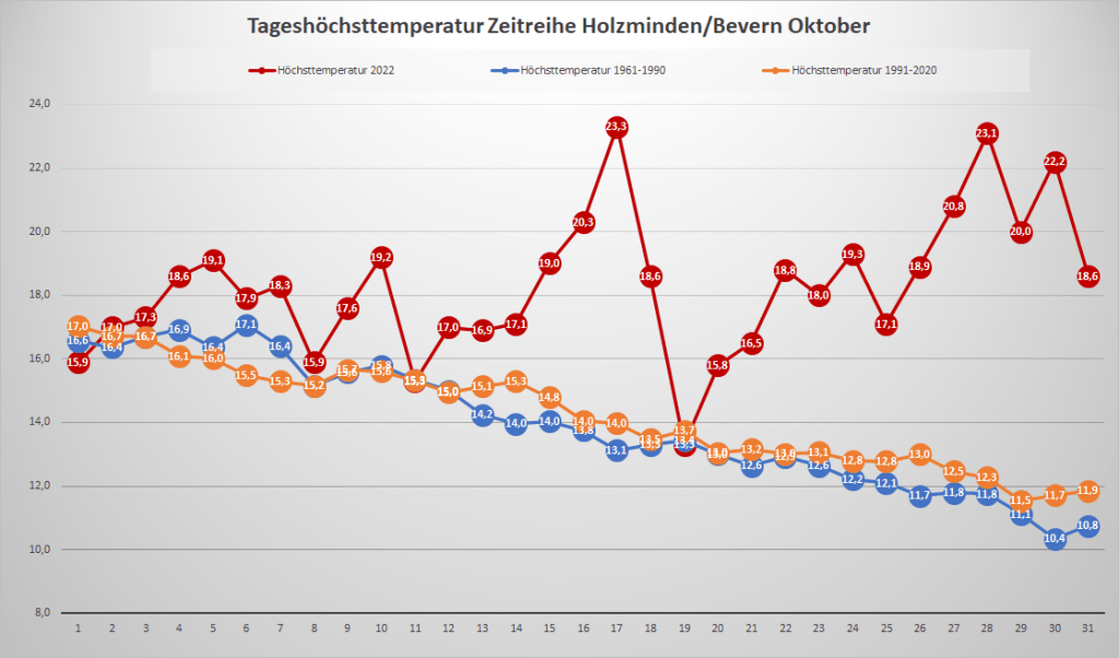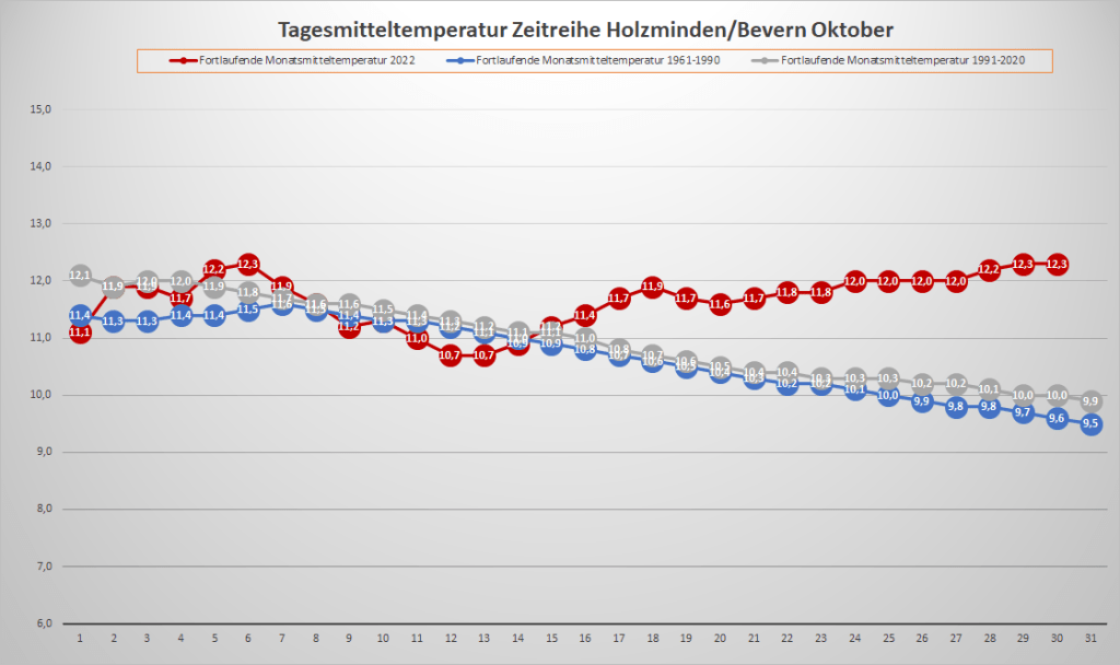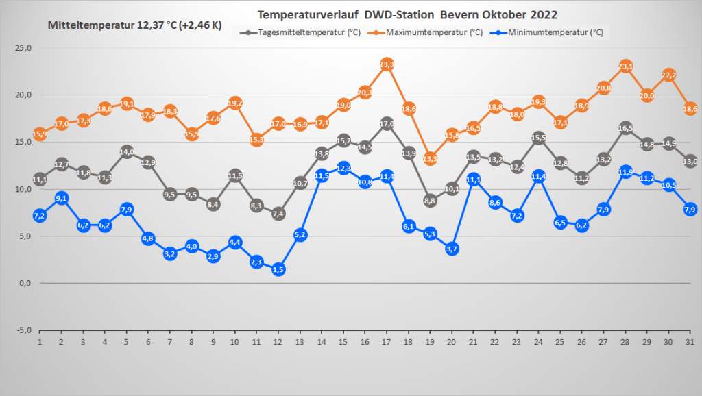 Mit einer Monatstemperatur von 12,37 °C war der Oktober 2022 an der DWD-Klimastation in Bevern um fast 2,5 K wärmer als im Mittel der Jahre 1991-2020. Gegenüber der älteren Klimanorm von 1961-1990 betrug das Plus fast 2,9 K. In der Zeitreihe seit 1934 sortiert er sich damit als drittwärmster hinter 2001 (13,2) und 2006 (13,0) sowie knapp vor 1995 und 2014 (je 12,3) ein. Besonders auffällig und in der Historie einmalig war dabei der Monatsverlauf: War die erste Hälfte noch nahe dem langjährigen Durchschnitt temperiert, stieg die fortlaufende Monatstemperatur im Laufe der zweiten Hälfte immer mehr an und erreichte ihren höchsten Wert ganz zum Schluss – so wie man es eigentlich in einem Frühjahrsmonat erwarten würde. In der rekordwarmen dritten Dekade gab es ein bisher kaum vorstellbares Finale, bei dem zwischen dem 27. und 30. viermal in Folge die 20-Grad-Marke überschritten wurde und die bisherigen Tagesrekorde nur so purzelten. Frost war hingegen am anderen Ende der Skala noch kein Thema, zumindest nicht in zwei Metern Messhöhe, während es in der Nacht zum 12. den ersten und bislang einzigen leichten Bodenfrost der Saison gab.