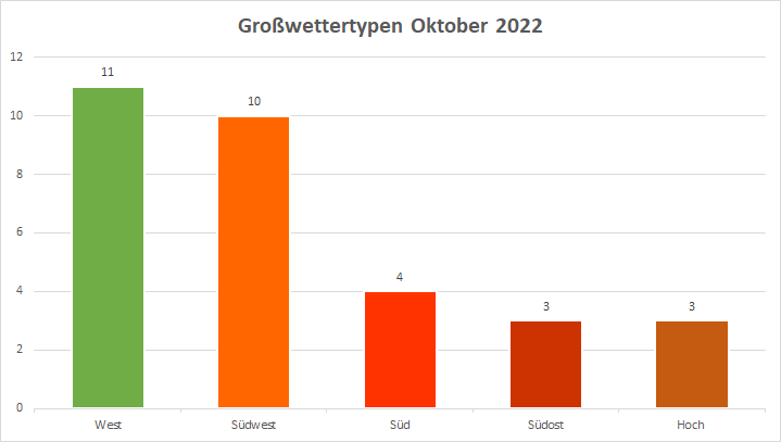 Die Analyse der Großwettertypen zeigt im wesentlichen zwei dominante Strömungsmuster: Vorwiegend West in der ersten Monatshälfte und ausschließlich den Sektor Süd in der zweiten, wobei die Großwetterlage Südwest antizyklonal (SWA) klar vorn lag. Die hochdruckgeprägte Südwestwetterlage ist mit gewissen Abstrichen im Winter die zu jeder Jahreszeit potenziell wärmste GWL und durchweg wärmer als der klimatologische Durchschnitt. Wenn „alles passt“ wie zum Monatsende, sind die Abweichungen zur Norm markant positiv, wobei das Außergewöhnliche im Oktober 2022 nicht das Auftreten der Südwestlage an sich war, sondern ihre Persistenz. Diese gestiegene Erhaltungsneigung, also das längere Andauern bestimmter Zirkulationsmuster, schreibt ein Großteil der Forschung dem Klimawandel zu.