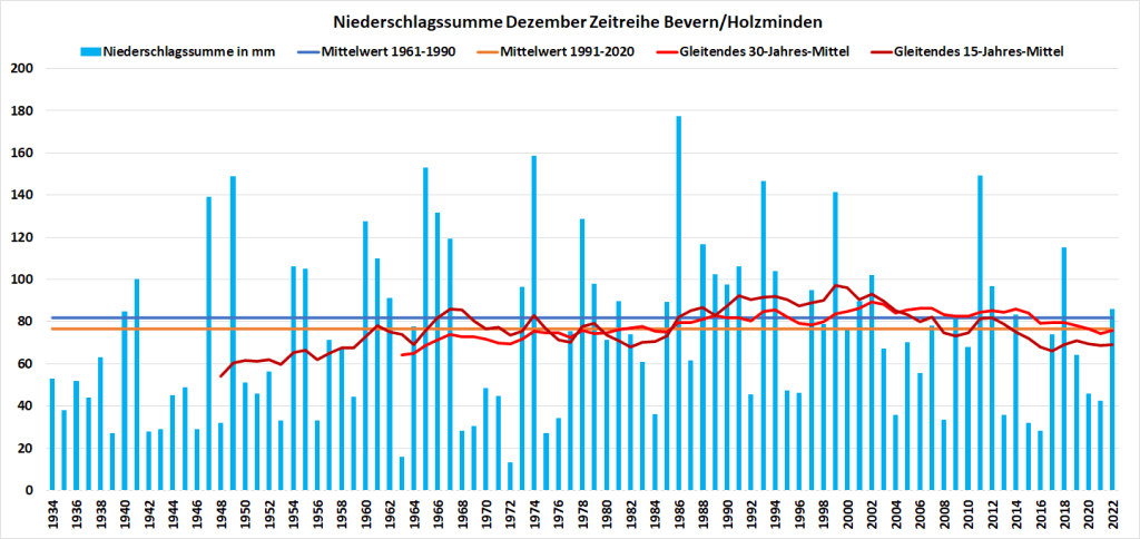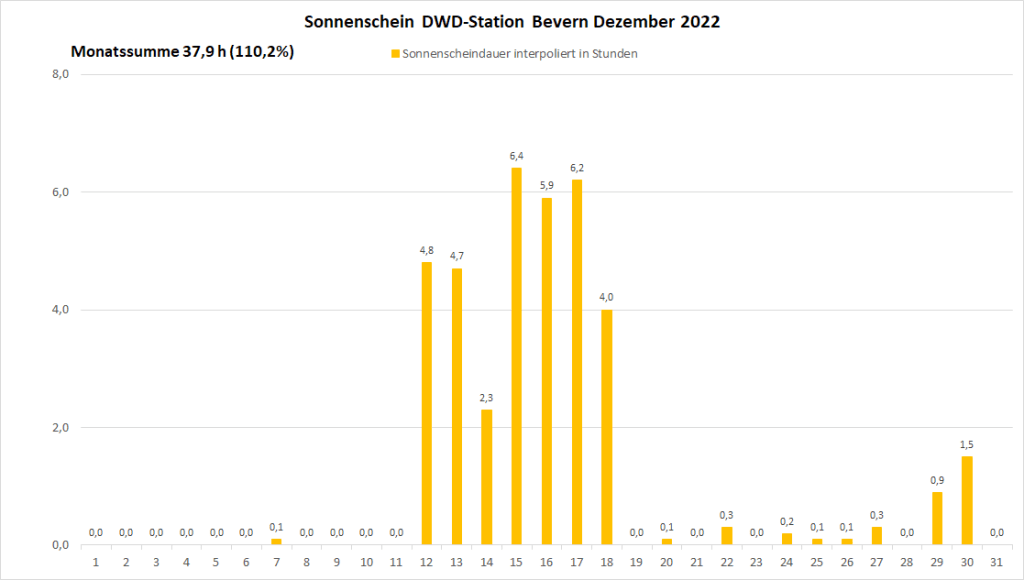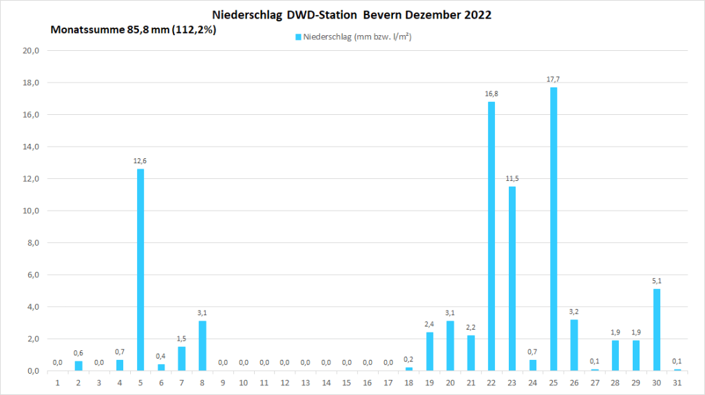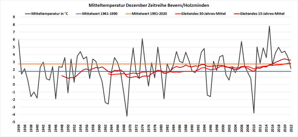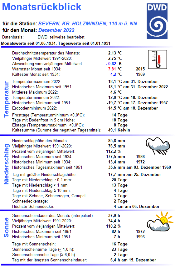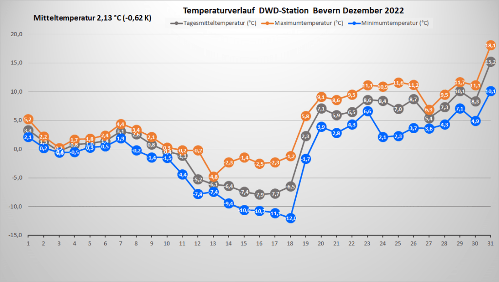 Mit einer Monatstemperatur von 2,13 °C war der Dezember 2022 an der DWD-Klimastation in Bevern um 0,6 K kälter als im Mittel der Jahre 1991-2020. Gegenüber der älteren Klimanorm von 1961-1990 ergab sich hingegen ein kleines Plus von 0,4 K. Damit war es immerhin der kälteste Dezember seit 2010, der seinerzeit nicht nur vorübergehend, sondern fast durchgehend hochwinterlich ausgefallen war. Nach einer mäßig kalten ersten Dekade ging es zu Beginn der zweiten in den Dauerfrostbereich, in dem die Temperaturen für acht Tage verharrten. In diese Phase fielen auch mehrere Nächte mit strengem Frost unter -10 Grad, direkt über dem Erdboden wurden fast -15 erreicht – und das alles ohne Schneedecke. Die hatte sich in den Niederungen nur kurzzeitig am Ende der ersten Woche gebildet und war noch vor dem Kaltlufteinbruch wieder abgetaut.