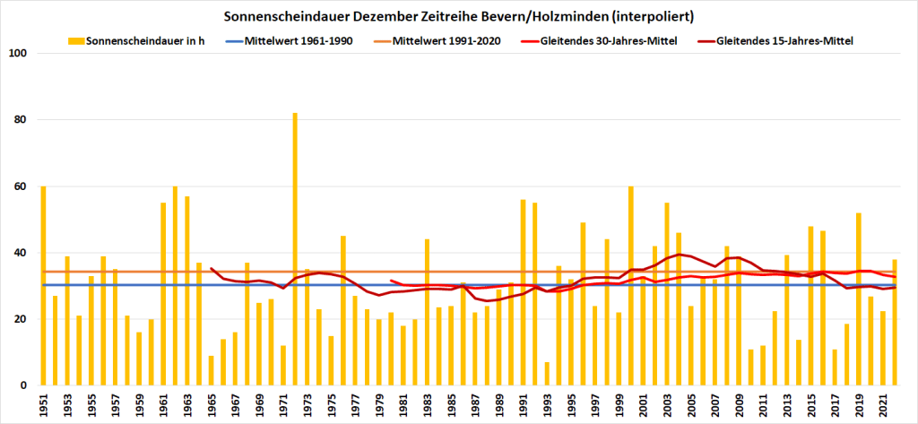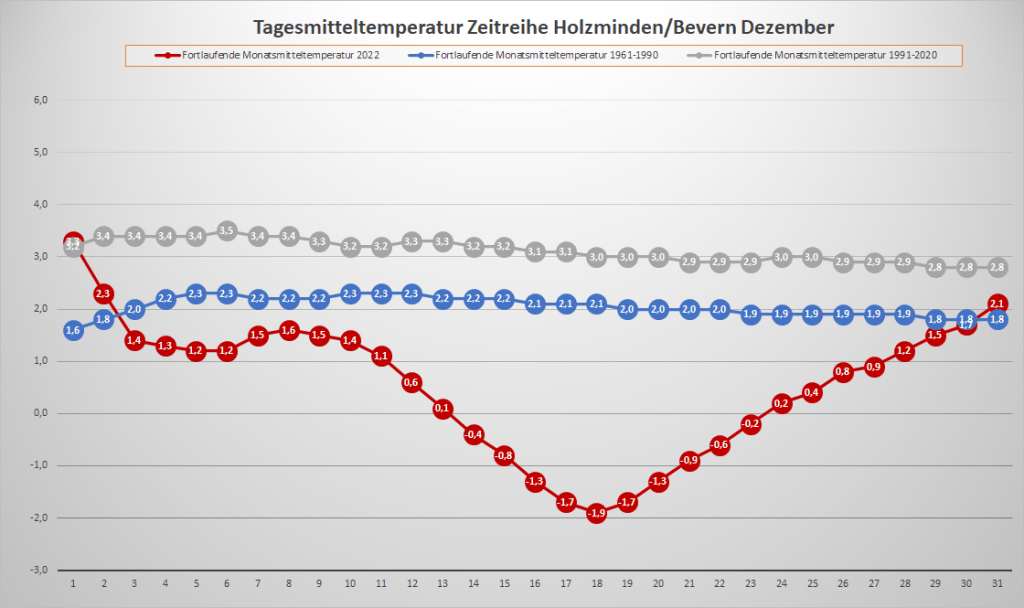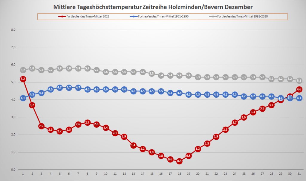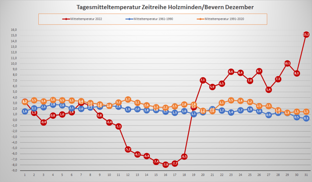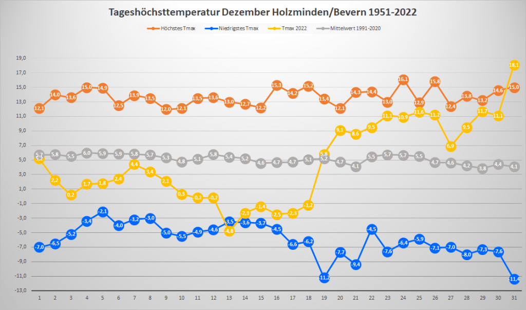 Die Milderung vollzog sich am 19. mit einer unfallträchtigen Glatteislage, als Regen auf die noch gefrorenen Böden fiel. Anschließend setzte eine beeindruckende „Aufholjagd“ bei den Temperaturen ein, die mit einem neuen Monatsrekord bei den Höchstwerten mit 18,1 °C am Silvestertag ihren Höhepunkt erreichte und den über 45 Jahre alten Dezemberrekord vom 24.12.1977 um volle zwei Grad hinter sich ließ. Die negative Abweichung der Monatstemperatur konnte dadurch zwar nicht mehr komplett getilgt, aber doch erheblich reduziert werden. Nach dem 18. hatte die fortlaufende Mitteltemperatur noch -1,9 °C betragen, am Ende stand mit +2,1 °C ein um vier Grad höherer Wert. Ähnlich markante Aufwärtsentwicklungen im Laufe der zweiten Monatshälfte hatte es zuletzt im Februar 2021 und beim Dezember im Jahr 2012 gegeben.