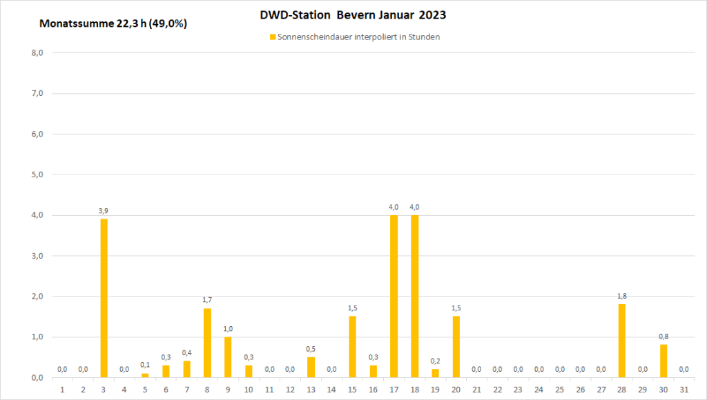 Die Sonnenscheindauer erreichte mit ca. 22 Stunden nur knapp die Hälfte eines durchschnittlichen Januars im Zeitraum von 1991-2020, lag aber immerhin zehn Stunden über dem noch trüberen Januar 2022. Für mehr als eine Halbtagsschicht von 4 Stunden reichte es auch an den sonnigsten Tagen nicht und auch dieser Wert wurde nur zweimal erreicht. An rund der Hälfte der Tage zeigte sich die Sonne gar nicht und als „Höhepunkt“ blieb es vom 21.-27. eine ganze Woche am Stück vollständig trüb. Dunkelheit liefert der Winter also auch weiterhin mit hoher Zuverlässigkeit in der Region. Auch deutschlandweit war es mit nur 32 Stunden im Gebietsmittel ein trüber Monat, etwas freundlicher zeigten sich die Nordseeinseln mit etwas über 50 Stunden und das Alpenvorland mit rund 65 Stunden. Mit Abstand am meisten Sonnenschein gab es auf Deutschlands höchstem Berg, der Zugspitze, mit 118 Stunden.