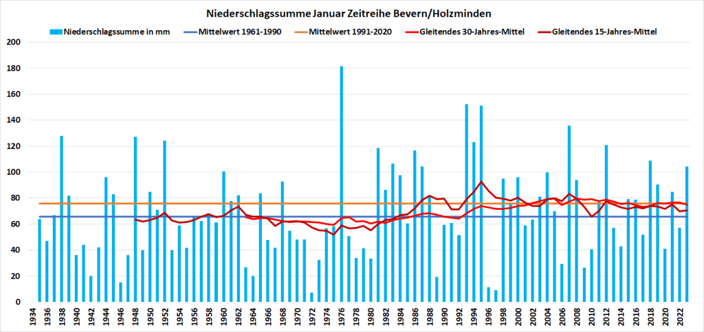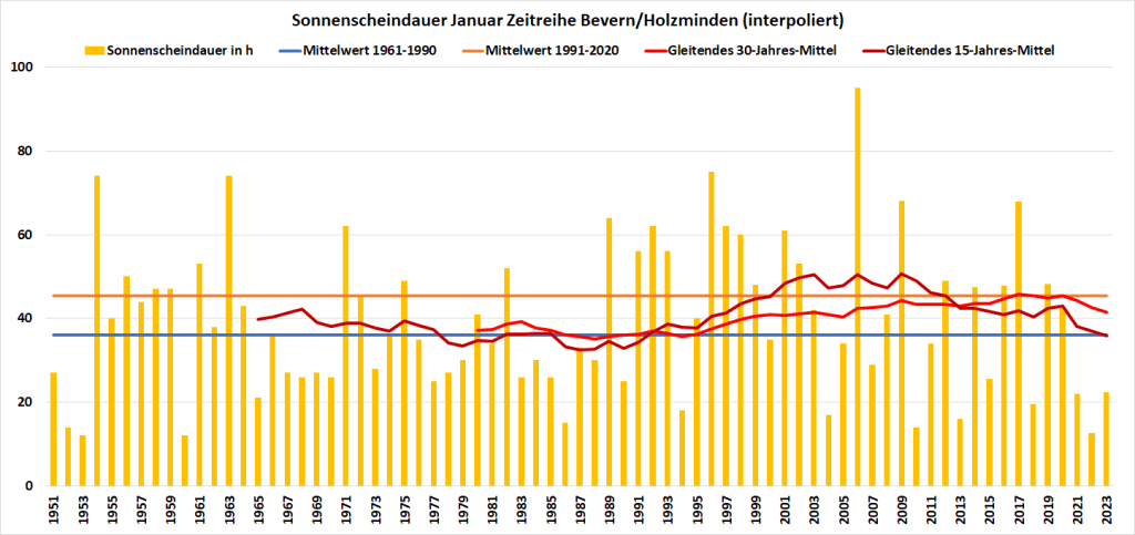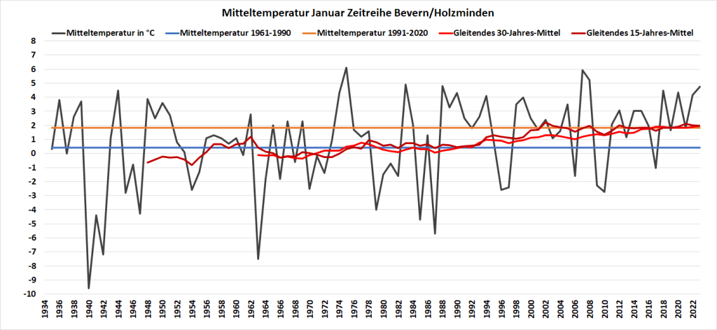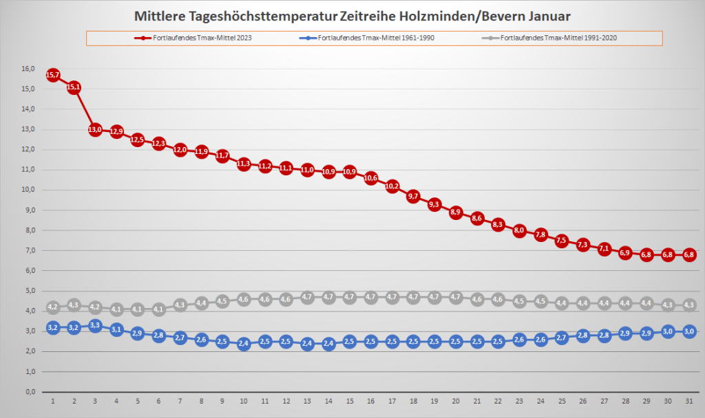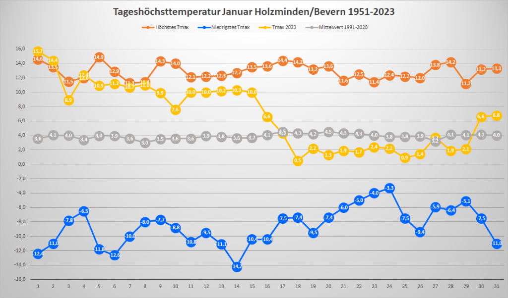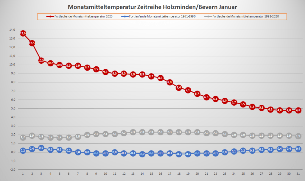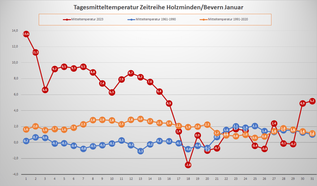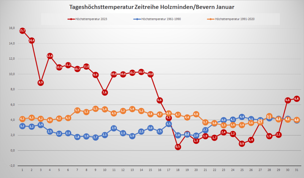 Mit einer Monatstemperatur von 4,78 °C war der Januar 2023 an der DWD-Klimastation in Bevern um 2,9 K wärmer als im Mittel der Jahre 1991-2020. Gegenüber der älteren Norm von 1961-1990 betrug das Plus sogar fast 4,4 K. Damit war es der fünftwärmste Januar in der fast 90 Jahre langen Klimareihe Holzminden/Bevern und der vierte über der Vier-Grad-Marke in den letzten sechs Jahren. Der Neujahrstag erreichte mit einem Höchstwert von 15,7 °C erneut frühlingshaftes Niveau und löste den erst vor einem Jahr aufgestellten Monatsrekord bereits wieder ab. Die ersten 15 Tage brachten es auf eine Mitteltemperatur von 8,7 °C und einen durchschnittlichen Höchstwert von 10,9 °C – beides findet man üblicherweise erst im Laufe des Aprils. Den ersten Frost gab es erst am Abend des 17. – eine frostfreie erste Januarhälfte hatte es zuvor am Standort Bevern (seit Sommer 2006) noch nie und an den Vorgängerstandorten in Holzminden nur einmal im Jahr 1975 gegeben.