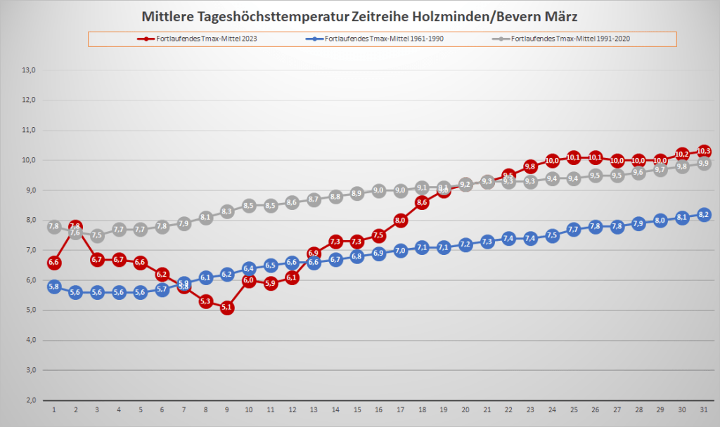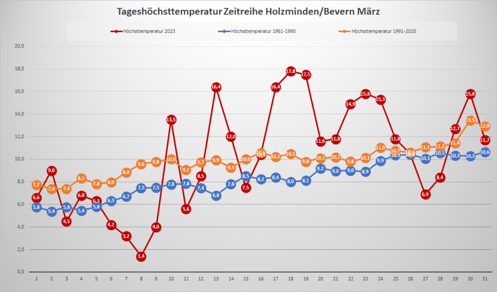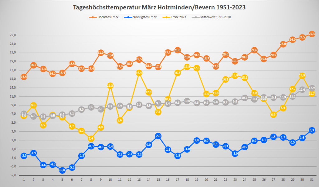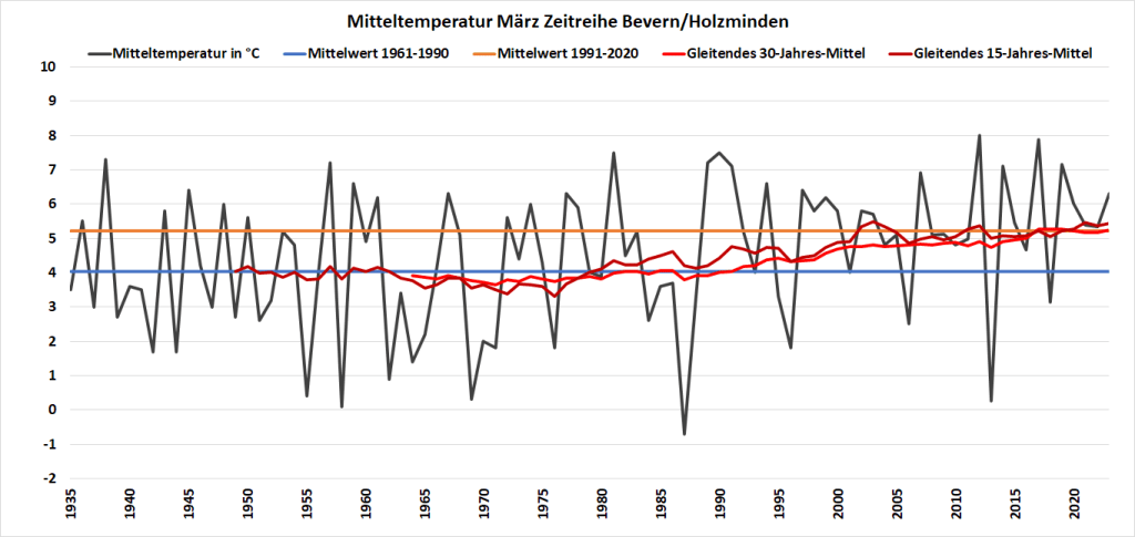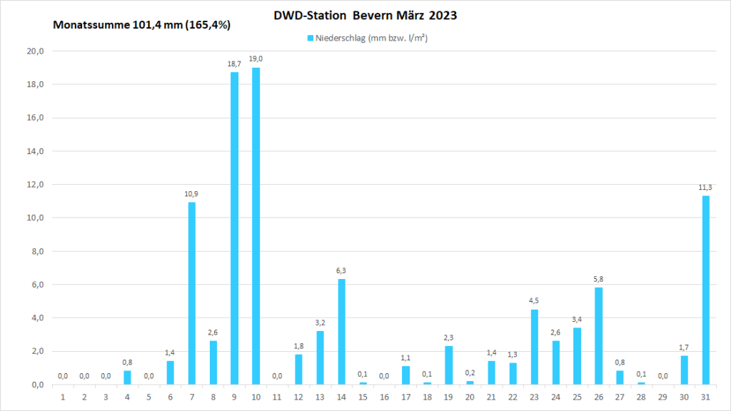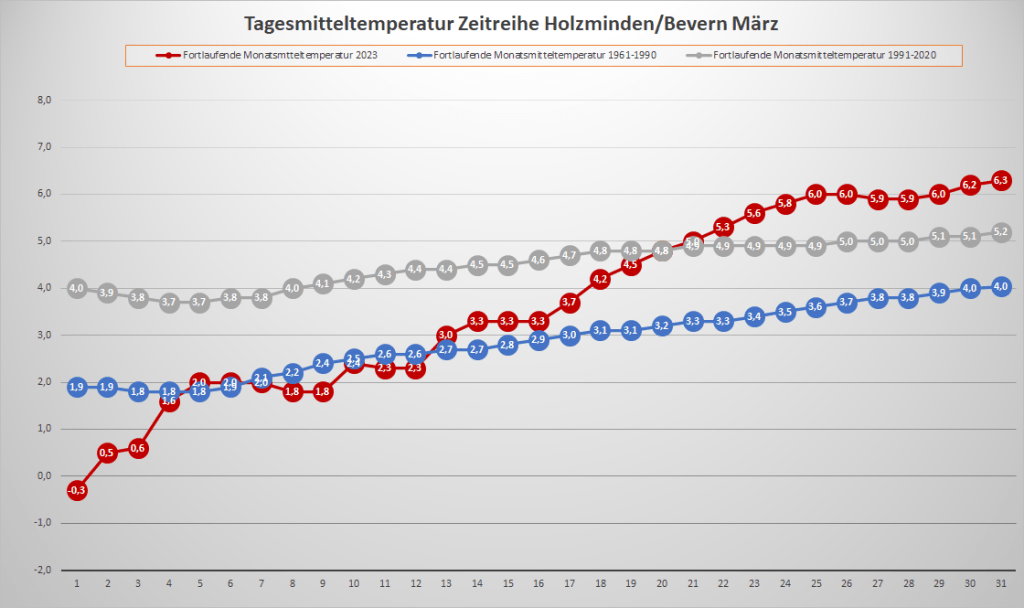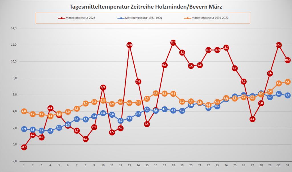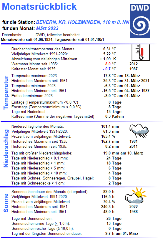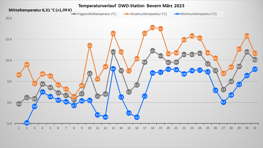 Mit einer Monatstemperatur von 6,31 °C war der März 2023 an der DWD-Klimastation in Bevern um 1,1 K wärmer als im Mittel der Jahre 1991-2020. Gegenüber der älteren Norm von 1961-1990 betrug die Abweichung fast 2,3 K. Am wärmsten wurde es am 18. mit einem Höchstwert von 17,8 °C und einem Tagesmittel von 12,3 °C, am kältesten war gleich die erste Nacht mit Minima von -6,3 °C in 2 m Höhe und -8,0 °C direkt über dem Boden. Die Anzahl der Frosttage lag mit acht unter dem 30-Jahres-Durchschnitt von zwölf und die zweite Monatshälfte blieb frostfrei. Die Grünlandtemperatursumme stieg am Standort Bevern bis Ende März auf einen Wert von fast 366 K an. Sie eine wichtige Kennzahl zur Beurteilung des Vegetationsbeginns und -fortschritts. Der DWD schreibt dazu in seinem Thema des Tages vom 18.03.2023: