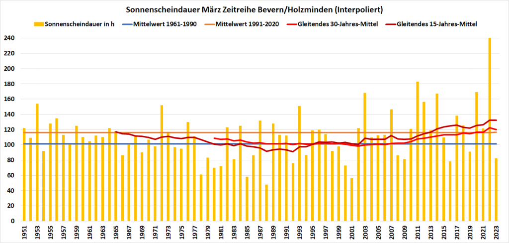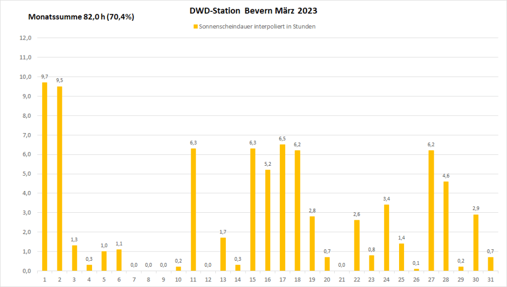 Die Sonnenscheindauer lag mit 82 Stunden fast genau auf dem Niveau des vorausgegangenen Februars – und damit angesichts der fortschreitenden Jahreszeit deutlich unter dem Klimawert von 116 Stunden. Markant fällt der Unterschied zum Vorjahresmärz aus, der mit 240 Stunden noch einen bis dahin kaum für möglich gehaltenen Rekord aufgestellt hatte. Doch auch gemessen an weniger hohen Maßstäben verdient der März 2023 das Etikett sehr trüb, gab es doch in den letzten 30 Jahren nur in vier Fällen eine noch geringere Sonnenscheindauer zum Start in den meteorologischen Frühling. Auffällig auch: Kein Tag erreichte eine zweistellige Tagessumme, das Maximum wurde gleich am Monatsersten mit 9,7 Stunden erzielt. Astronomisch sind am 31. März schon fast 13 Stunden möglich, messbar davon (durch eingeschränkte Horizontfreiheit) je nach genauem Standort um 12 Stunden.