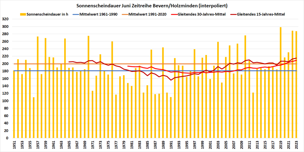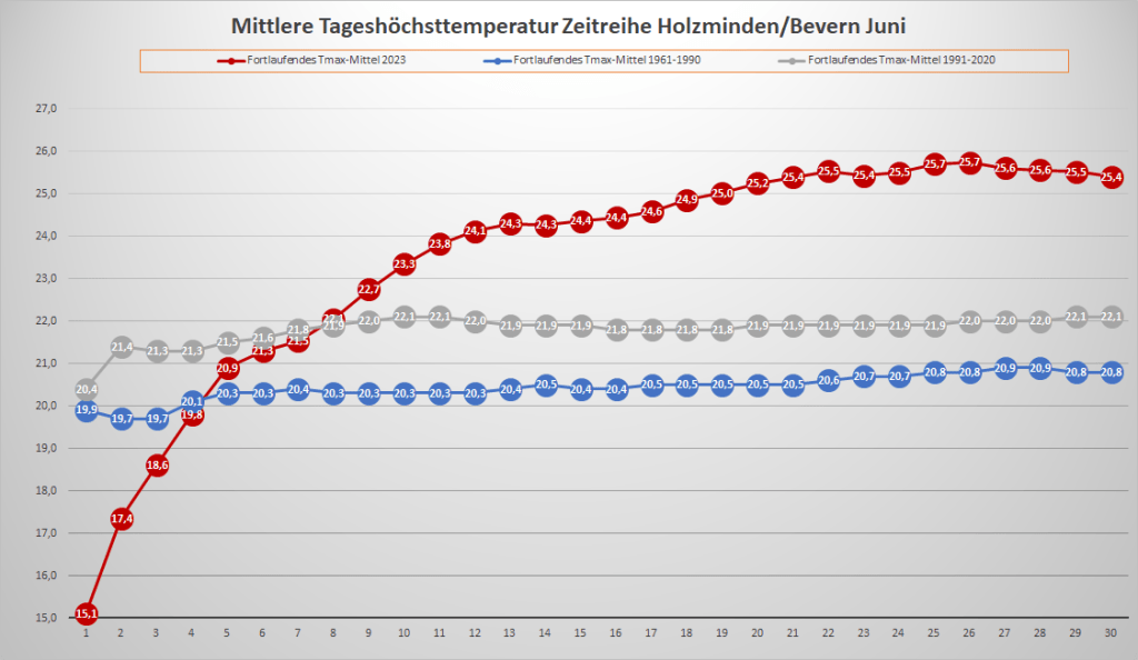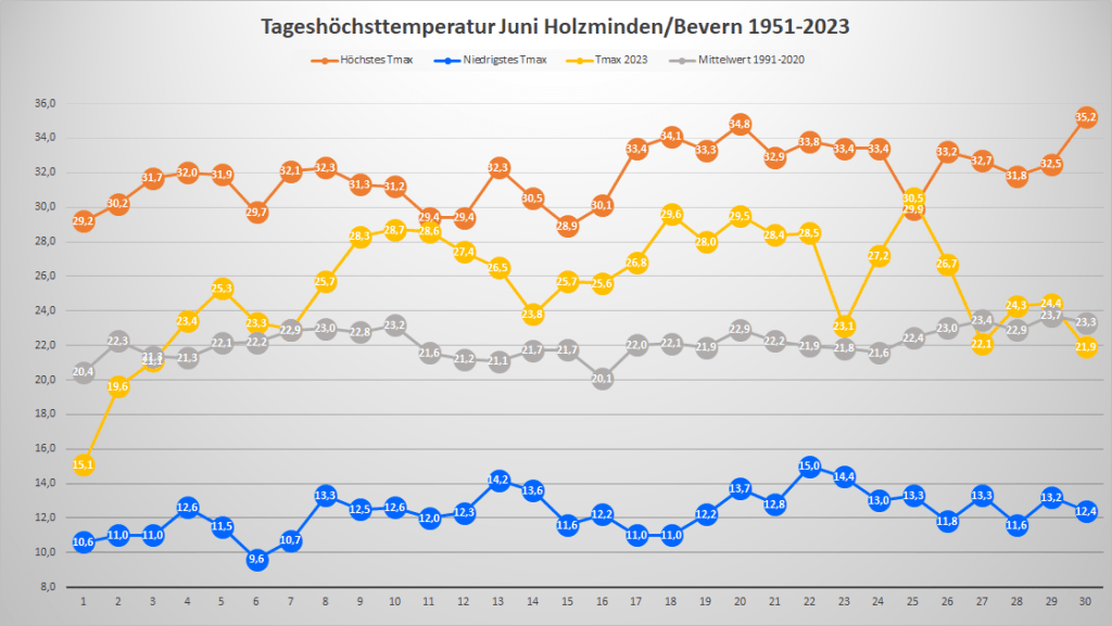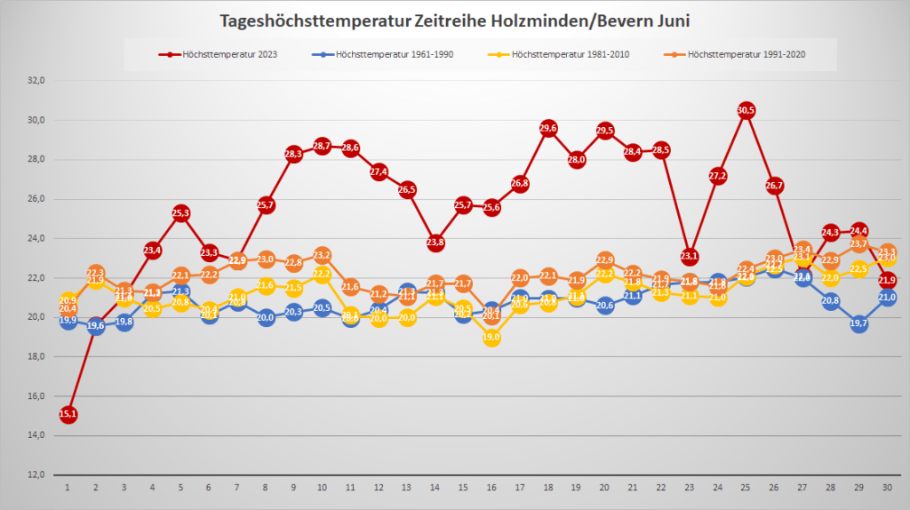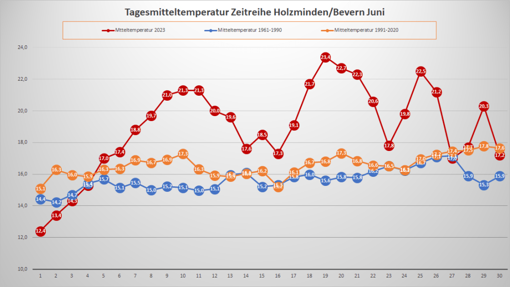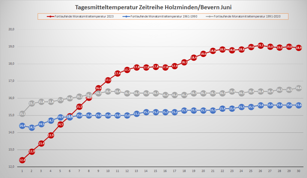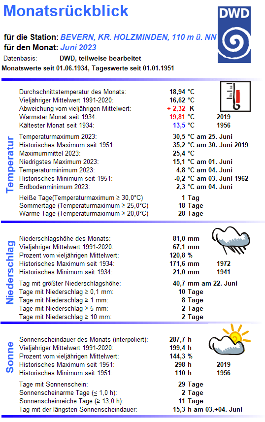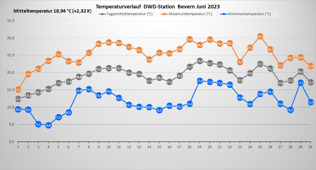 Mit einer Monatstemperatur von 18,94 °C lag der Juni 2023 an der DWD-Klimastation in Bevern um 2,3 K über dem Mittelwert von 1991-2020; gegenüber der älteren Norm von 1961-1990 betrug das Plus sogar über 3,3 K. Insgesamt war es der viertwärmste seit Beginn der lokalen Wetteraufzeichnungen. Mit dem regelrechten Sprung ab dem Jahr 2016 und einer weiteren Beschleunigung seit 2019 ist das Junimittel der letzten acht Jahre auf 18,5 °C angewachsen und entspricht nahezu dem des Hochsommermonats Juli. Erstmals war die 18-Grad-Marke vor 20 Jahren, im Rekordsommer 2003, überschritten worden, der zweite Fall trat 2007 auf und seit 2018 blieb nur noch ein Juni (2020) unter 18 Grad. Zusammen mit dem Dezember liegt der Juni damit bei der Erwärmung der letzten zehn Jahre ganz vorn.